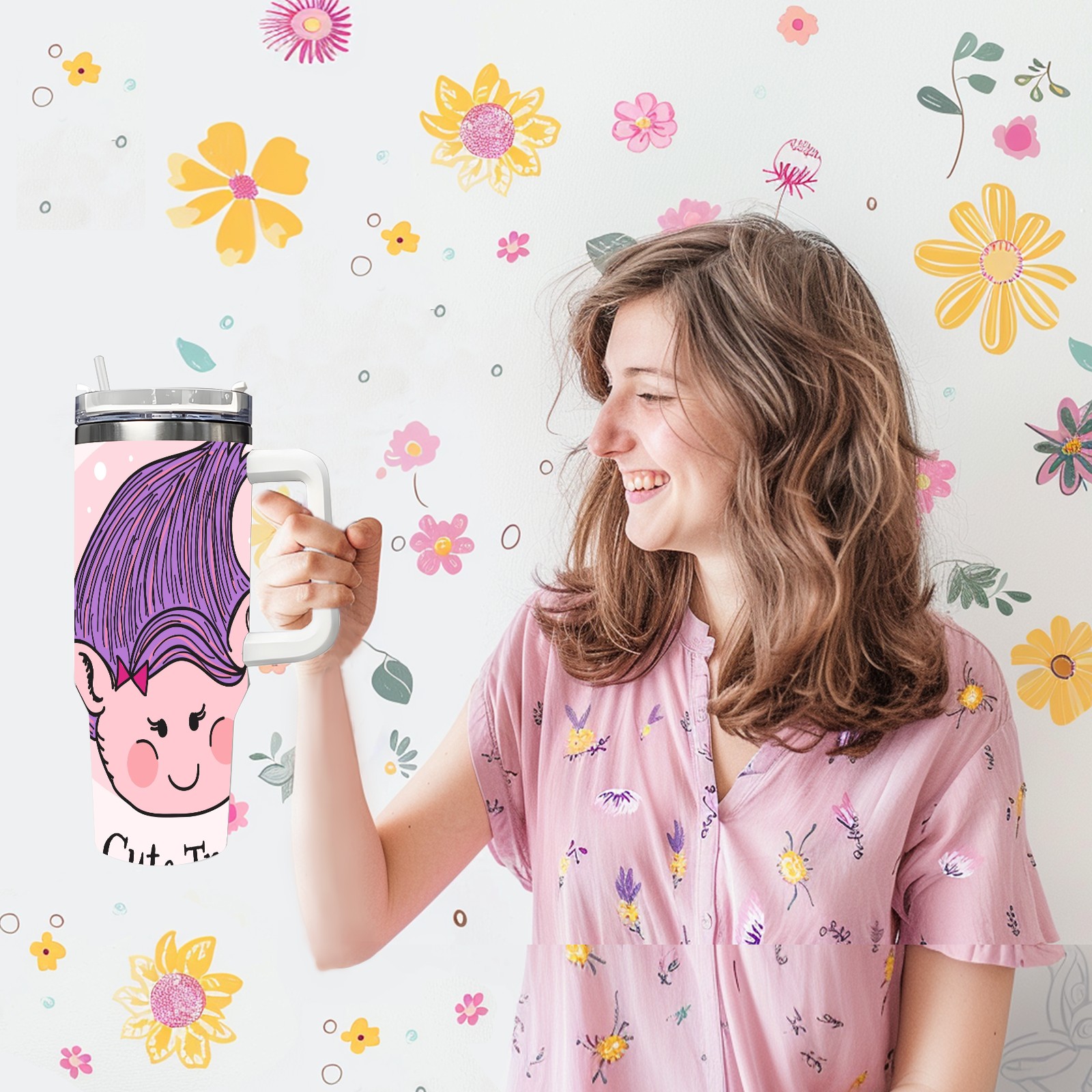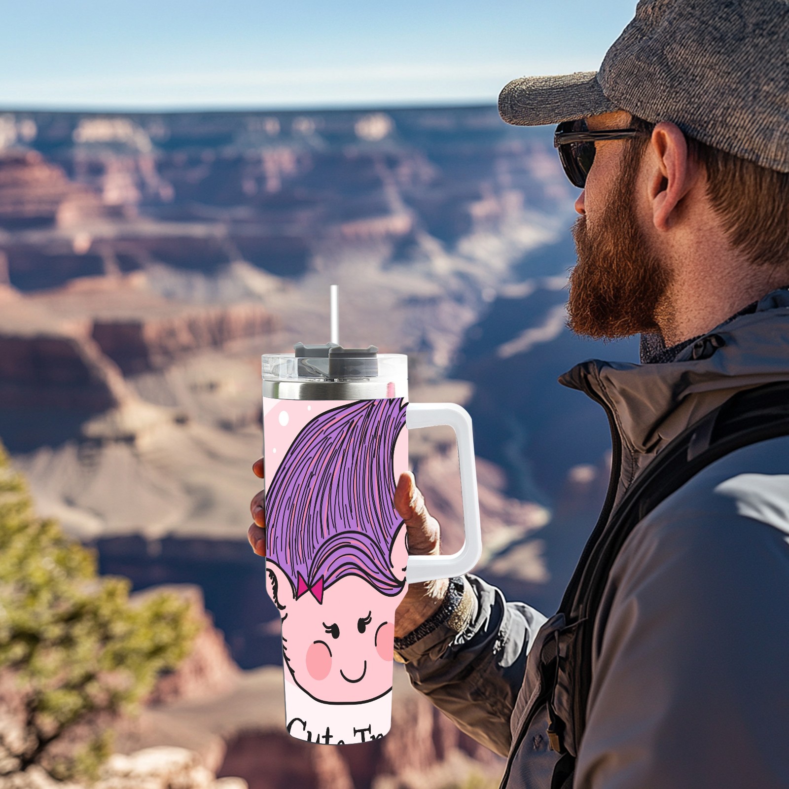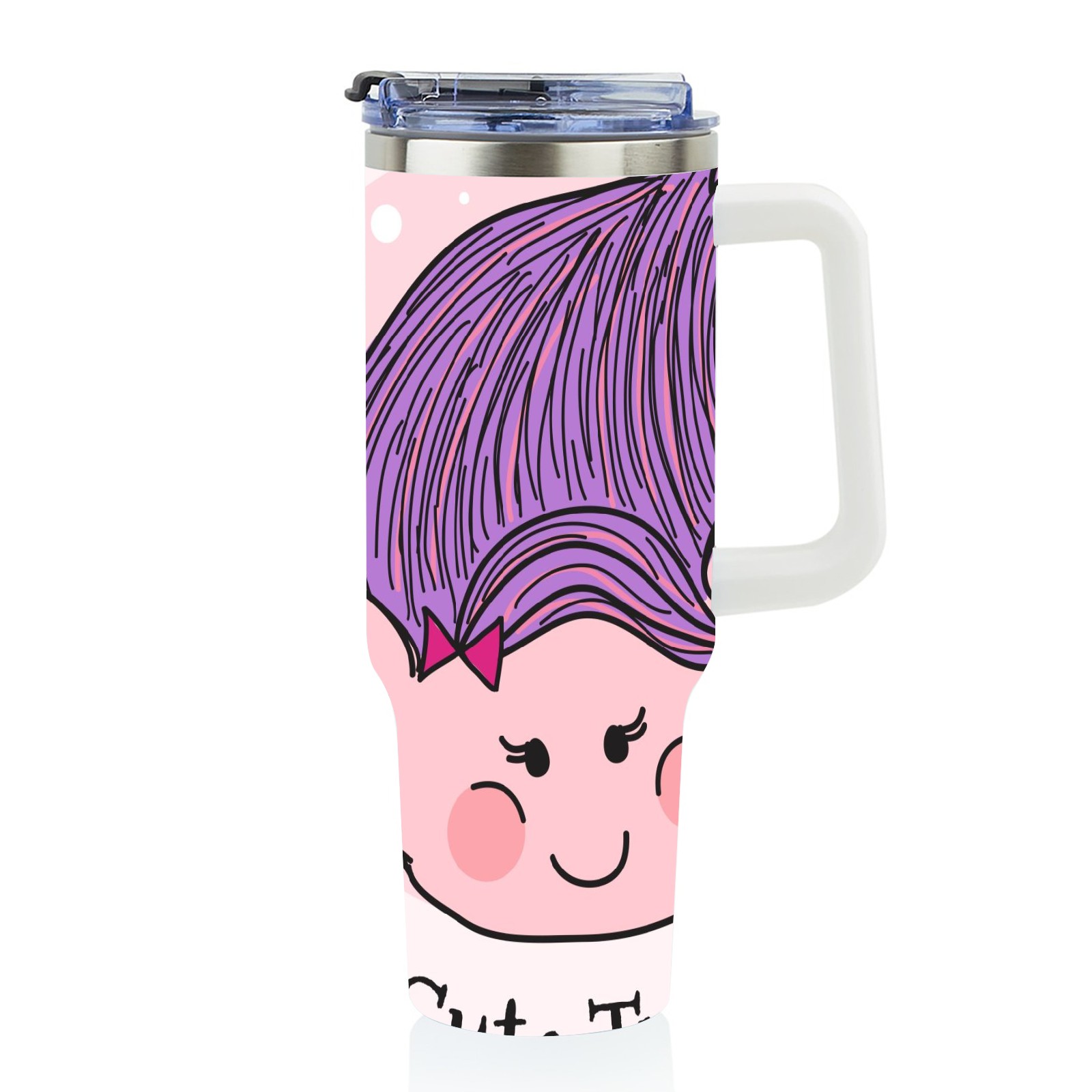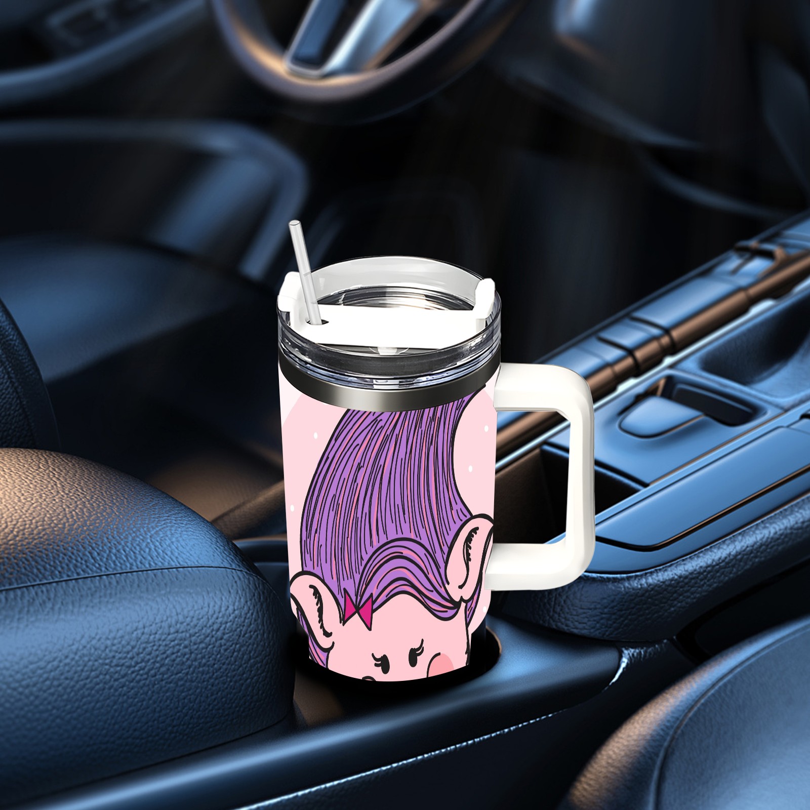 40oz Cute Troll thermos with lid and straw, leak-proof stainless steel, with handle, spill-proof bottle, convenient for travel(pink)
