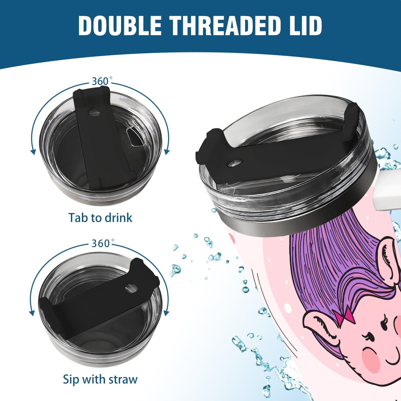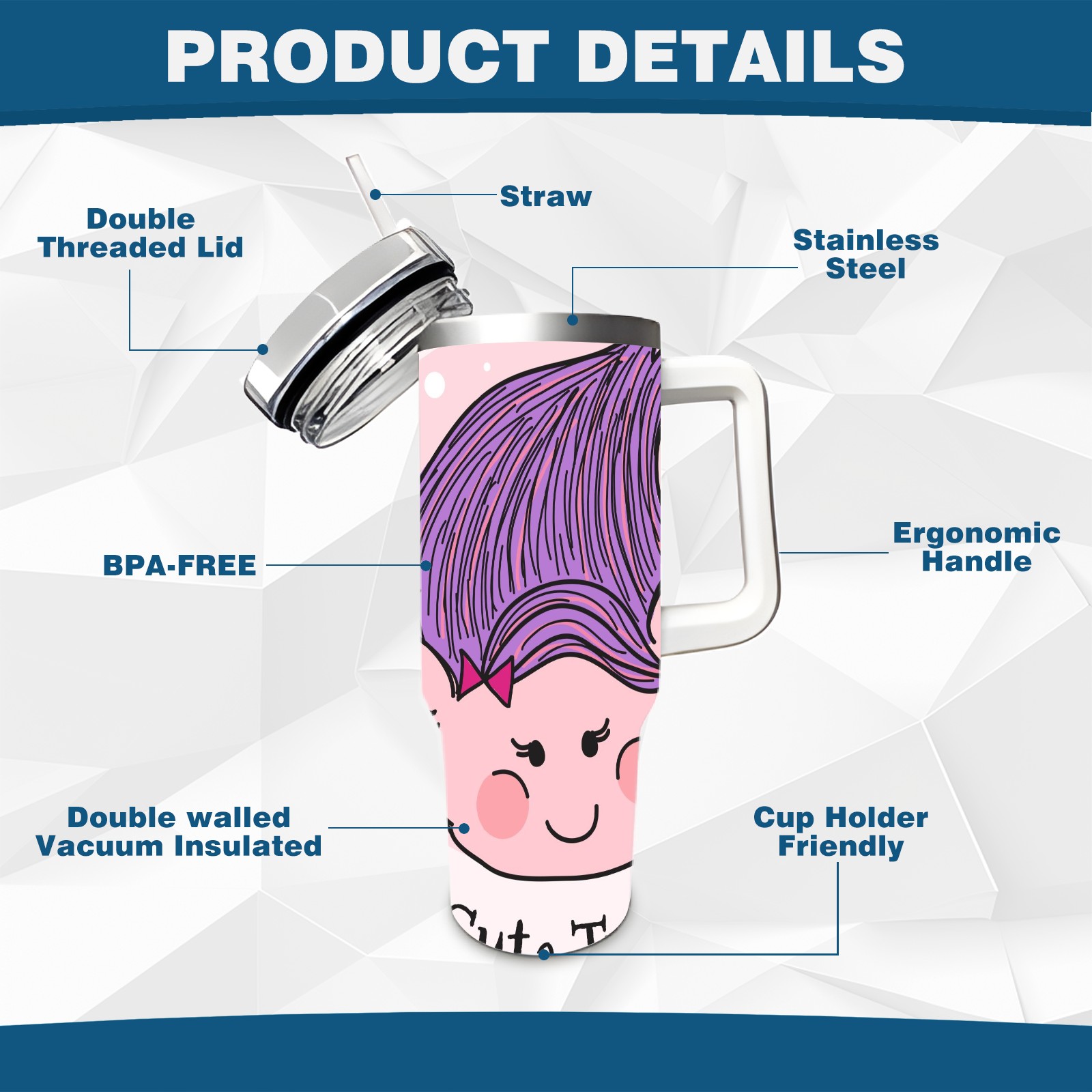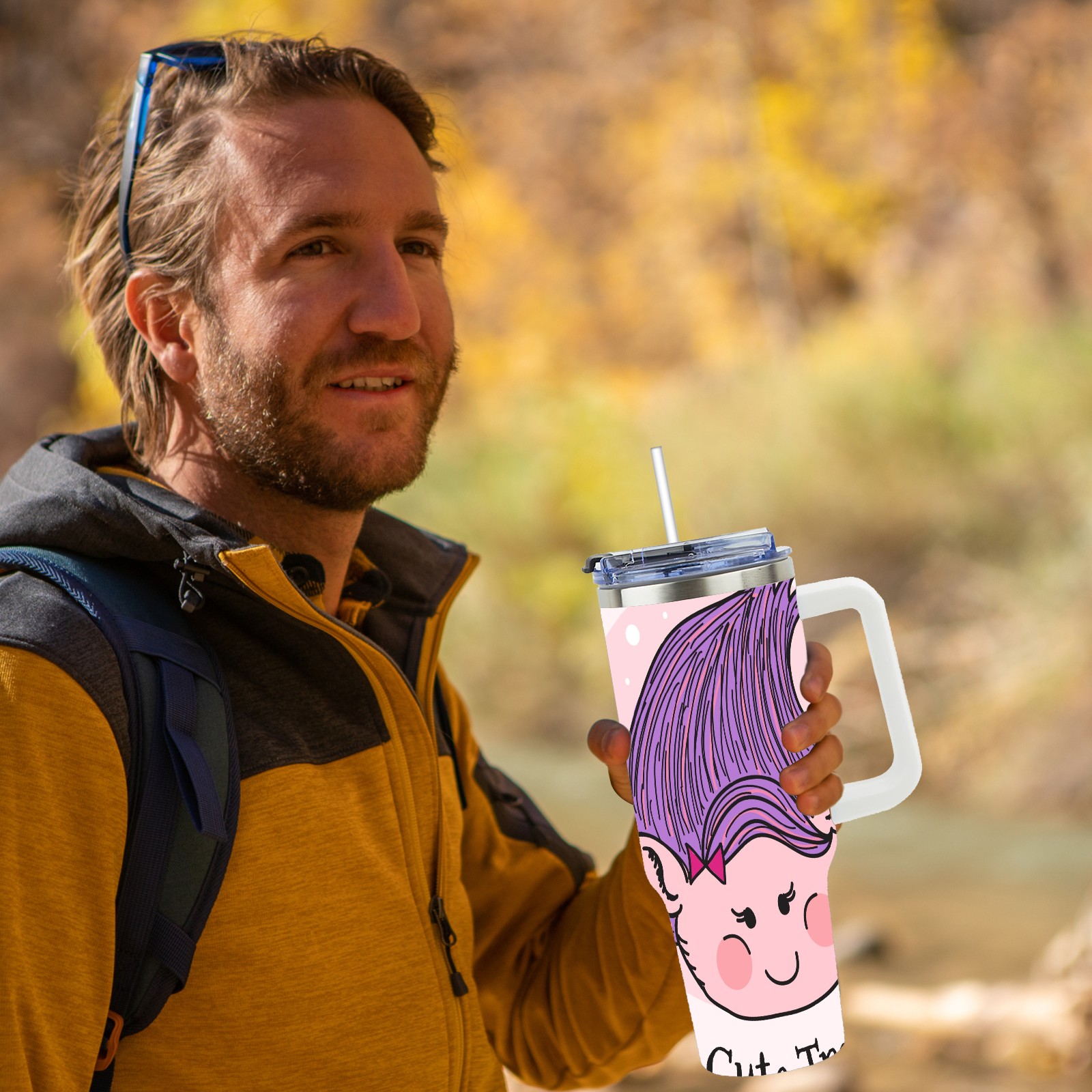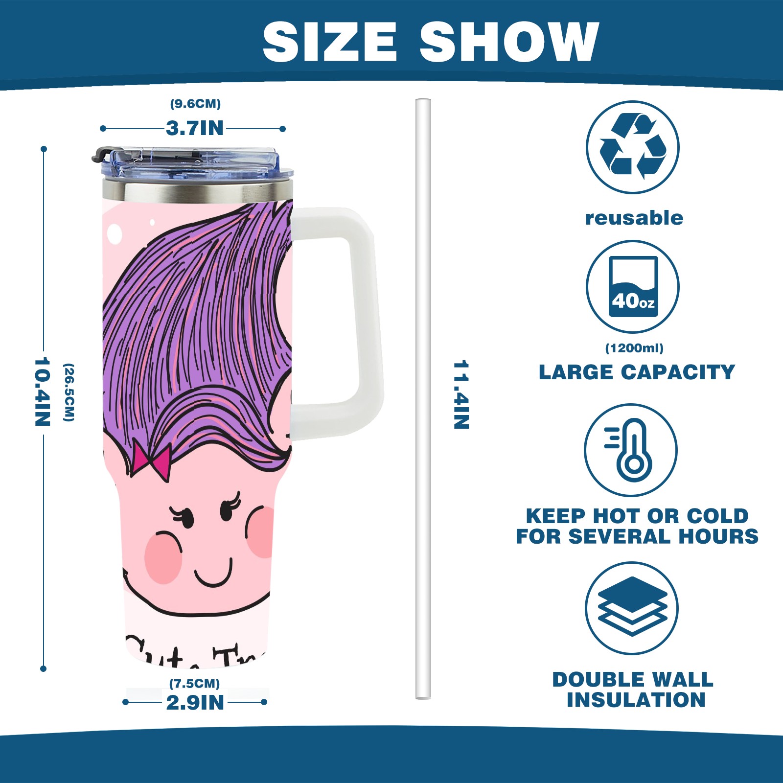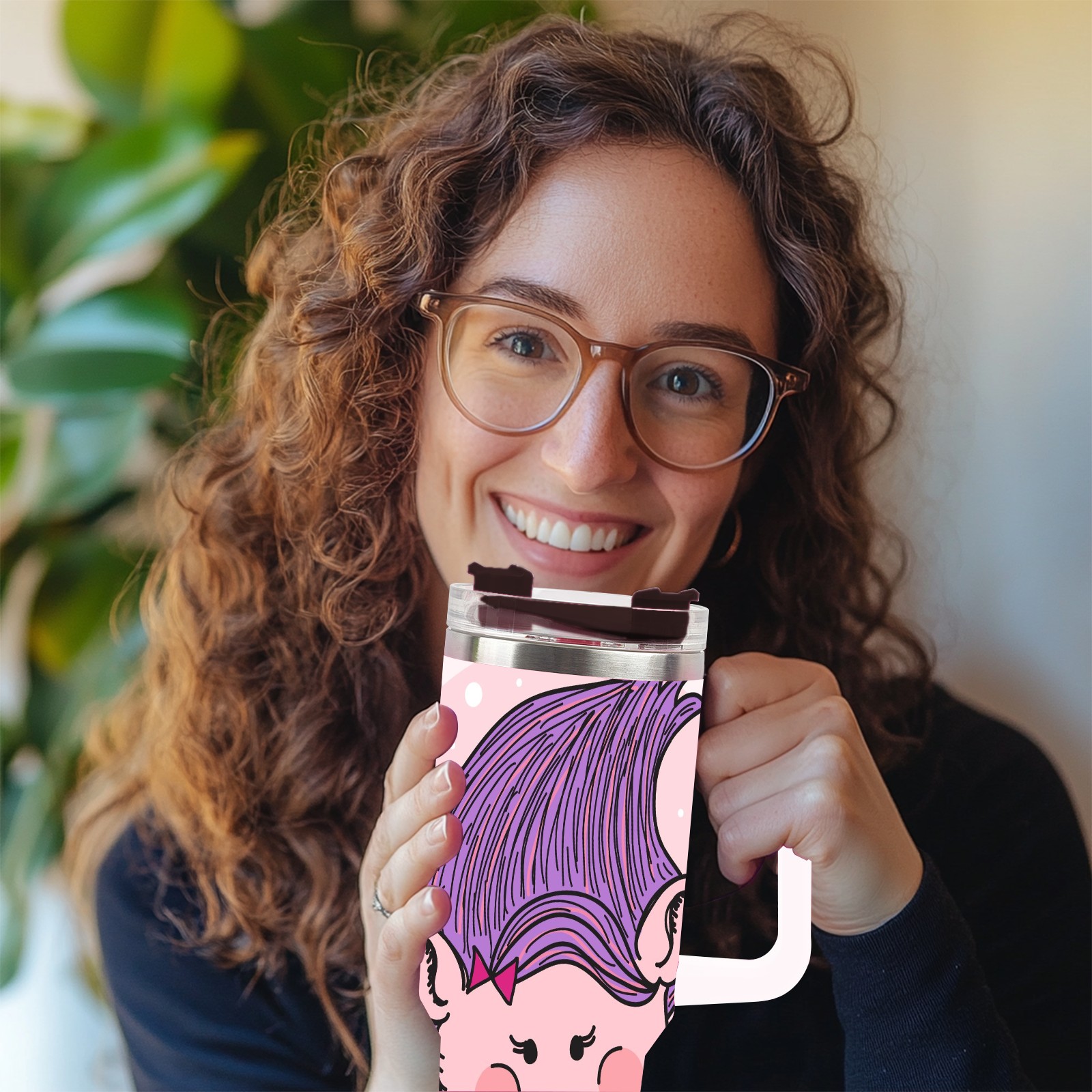 40oz Cute Troll thermos with lid and straw, leak-proof stainless steel, with handle, spill-proof bottle, convenient for travel(pink)