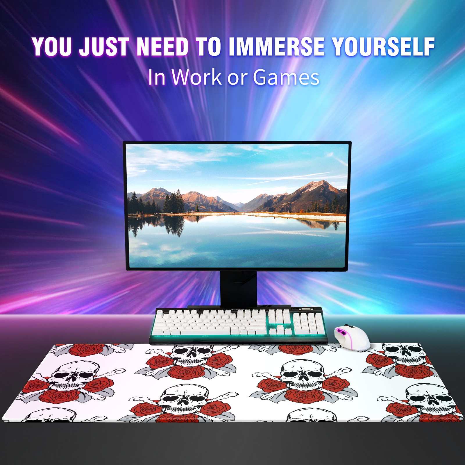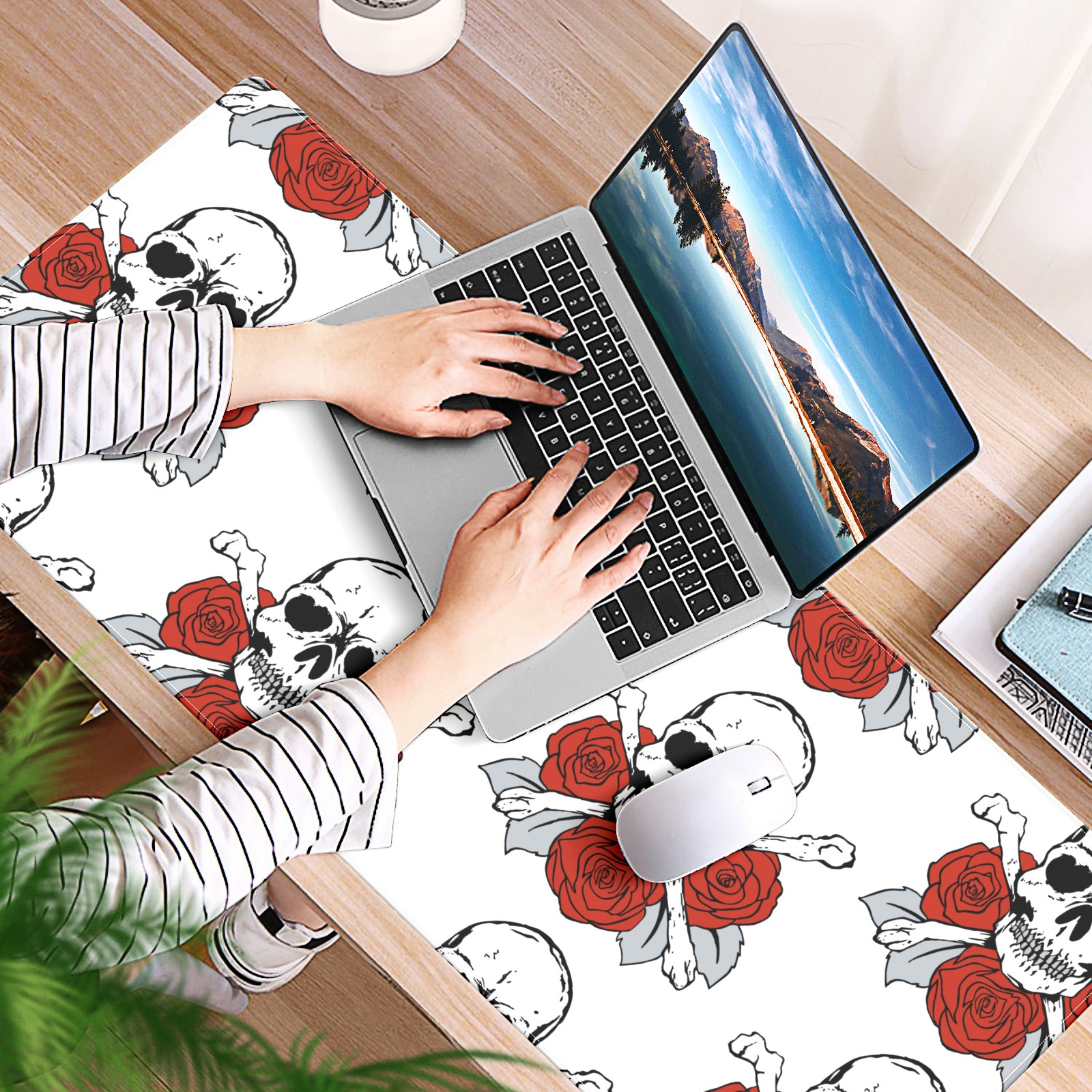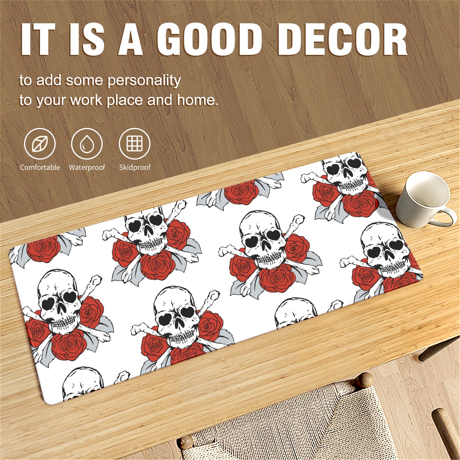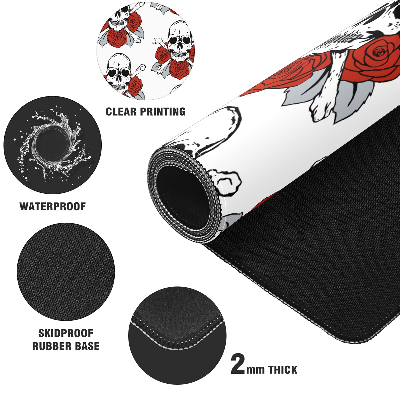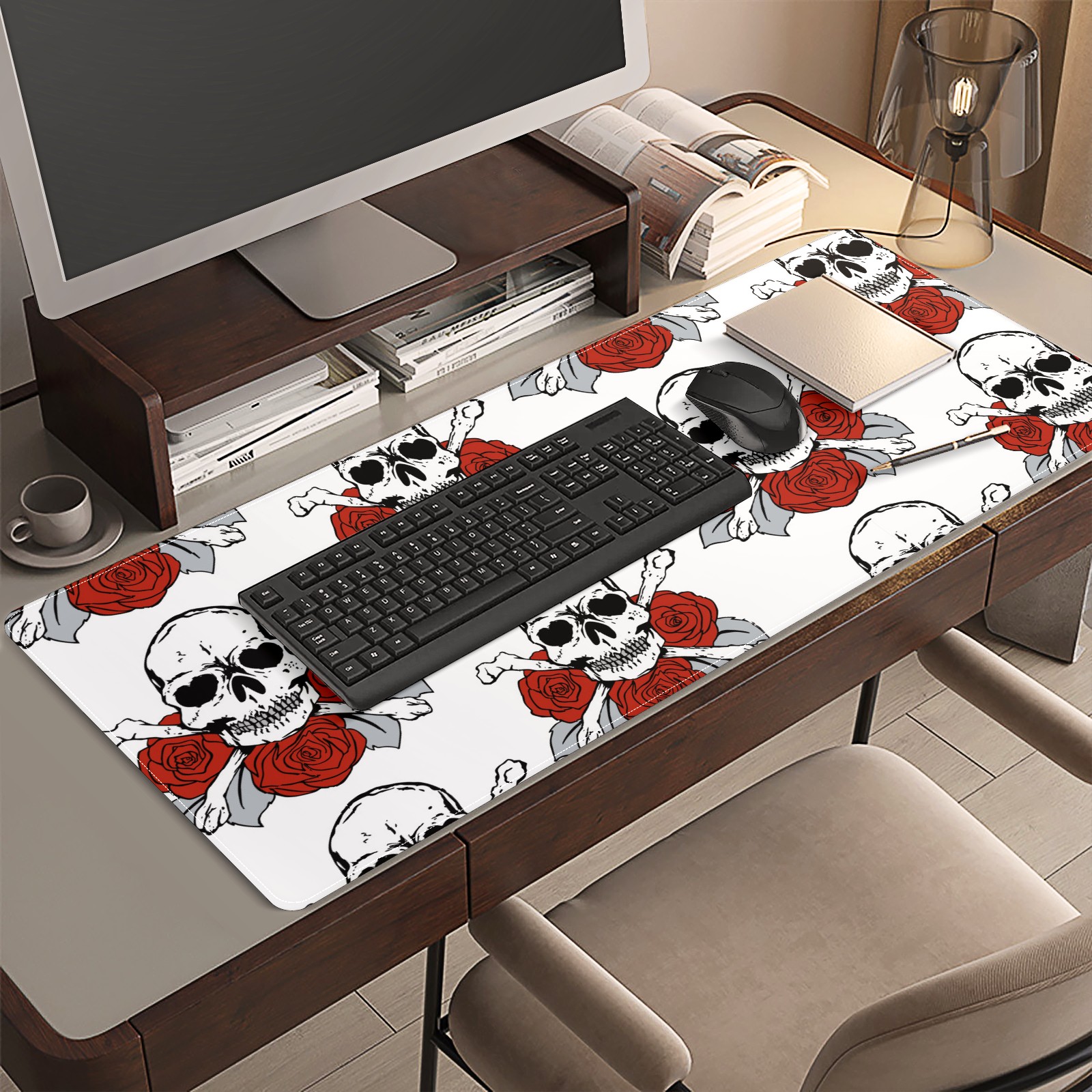Large Mouse Pad for Desktop, Cute Desk Mat Pad Protector for Work & Gaming, Aesthetic Pretty Anti-Slip Laptop Blotter Cover for Office School Home Supplies, Skulls Roses Flower Red White , 35.4inx15.7in