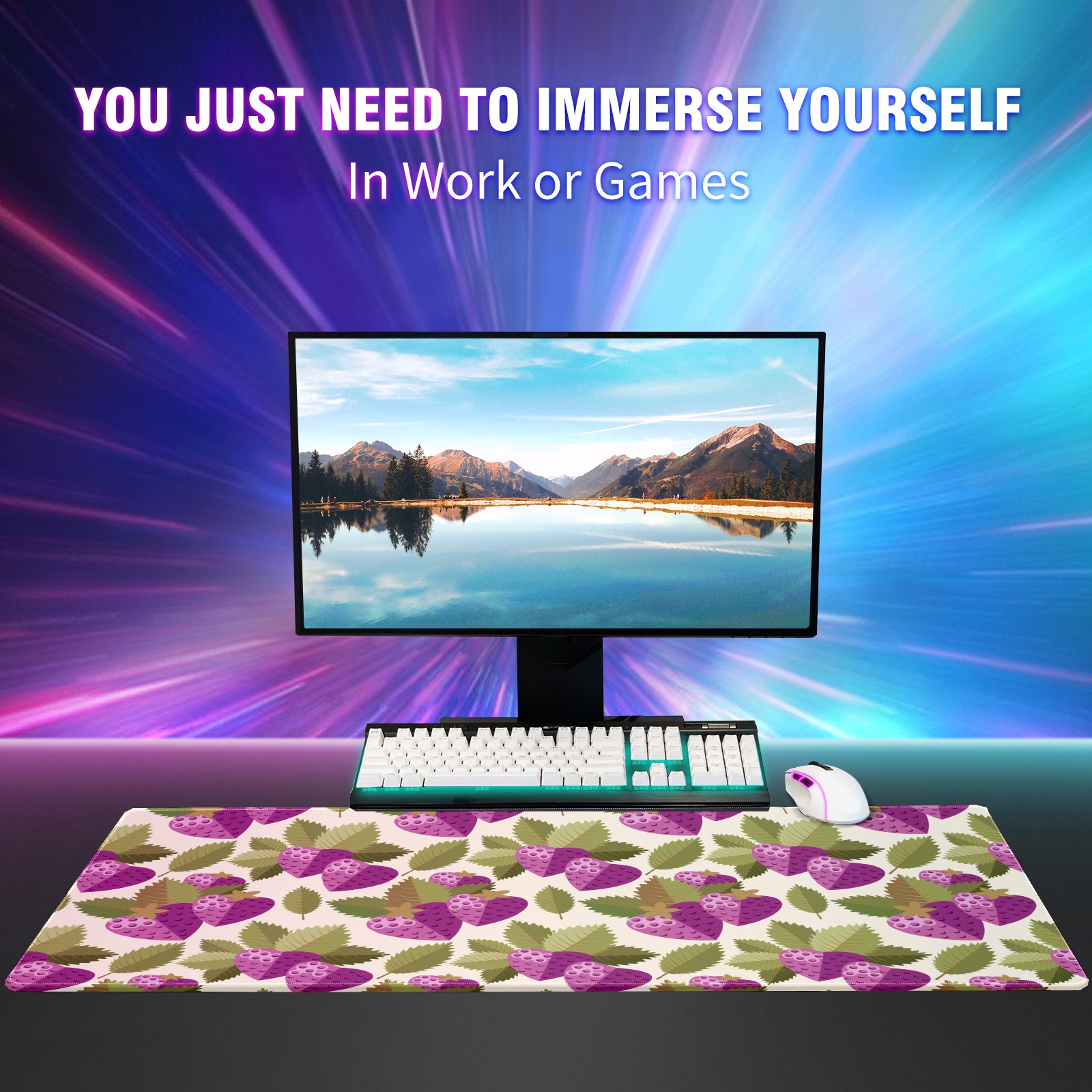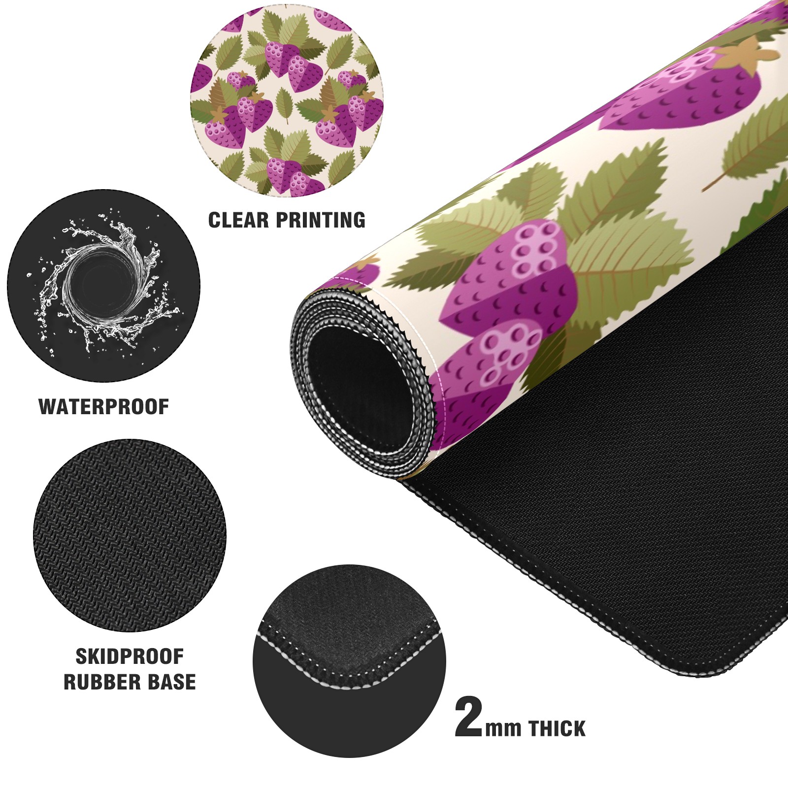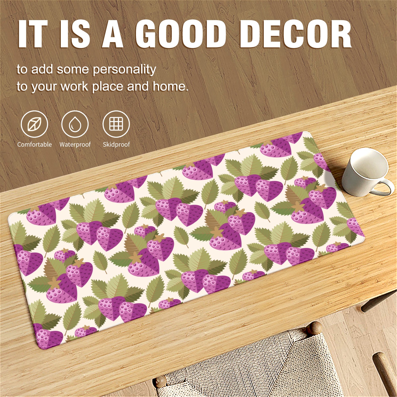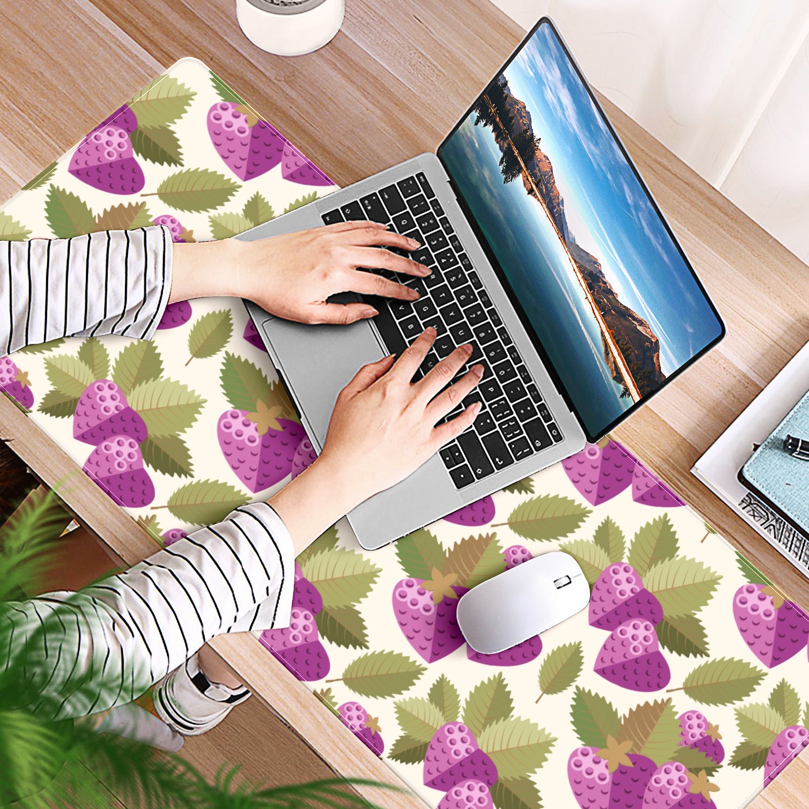 Large Mouse Pad for Desktop, Cute Desk Mat Pad Protector for Work & Gaming, Aesthetic Pretty Anti-Slip Laptop Blotter Cover for Office School Home Supplies, Purple Strawberry Leaves Seamless , 35.4inx15.7in