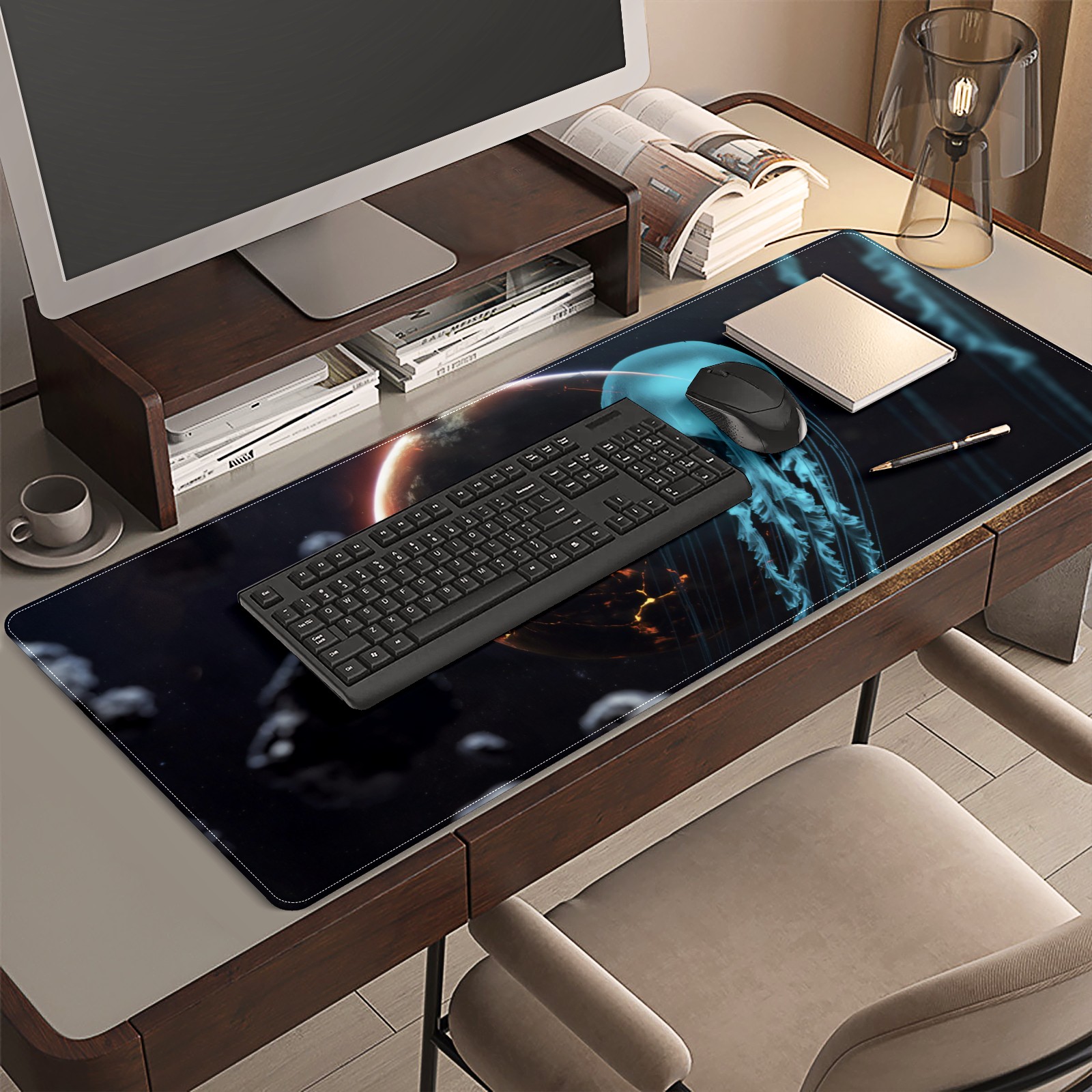 <p>This 35.4” × 15.7” extended desk mat offers ample space for your keyboard, mouse and essentials, working as a smooth work/writing pad while protecting your desktop from scratches.</p><p>With stylish artistic patterns, it adds personality to your home office, study or gaming setup. The high-density woven surface ensures precise, smooth mouse tracking for work and gaming.</p><p>Featuring an anti-slip natural rubber base for firm grip and stability, the mat is soft, elastic and odorless. Reinforced stitched edges prevent fraying and curling for long-lasting durability.</p>