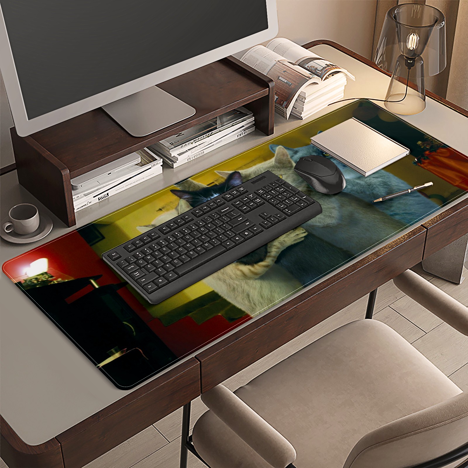 <p>This 35.4” × 15.7” extended desk mat offers ample space for your keyboard, mouse and essentials, working as a smooth work/writing pad while protecting your desktop from scratches.</p><p>With stylish artistic patterns, it adds personality to your home office, study or gaming setup. The high-density woven surface ensures precise, smooth mouse tracking for work and gaming.</p><p>Featuring an anti-slip natural rubber base for firm grip and stability, the mat is soft, elastic and odorless. Reinforced stitched edges prevent fraying and curling for long-lasting durability.</p>
