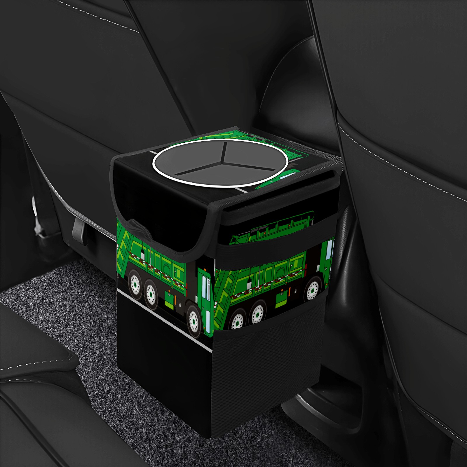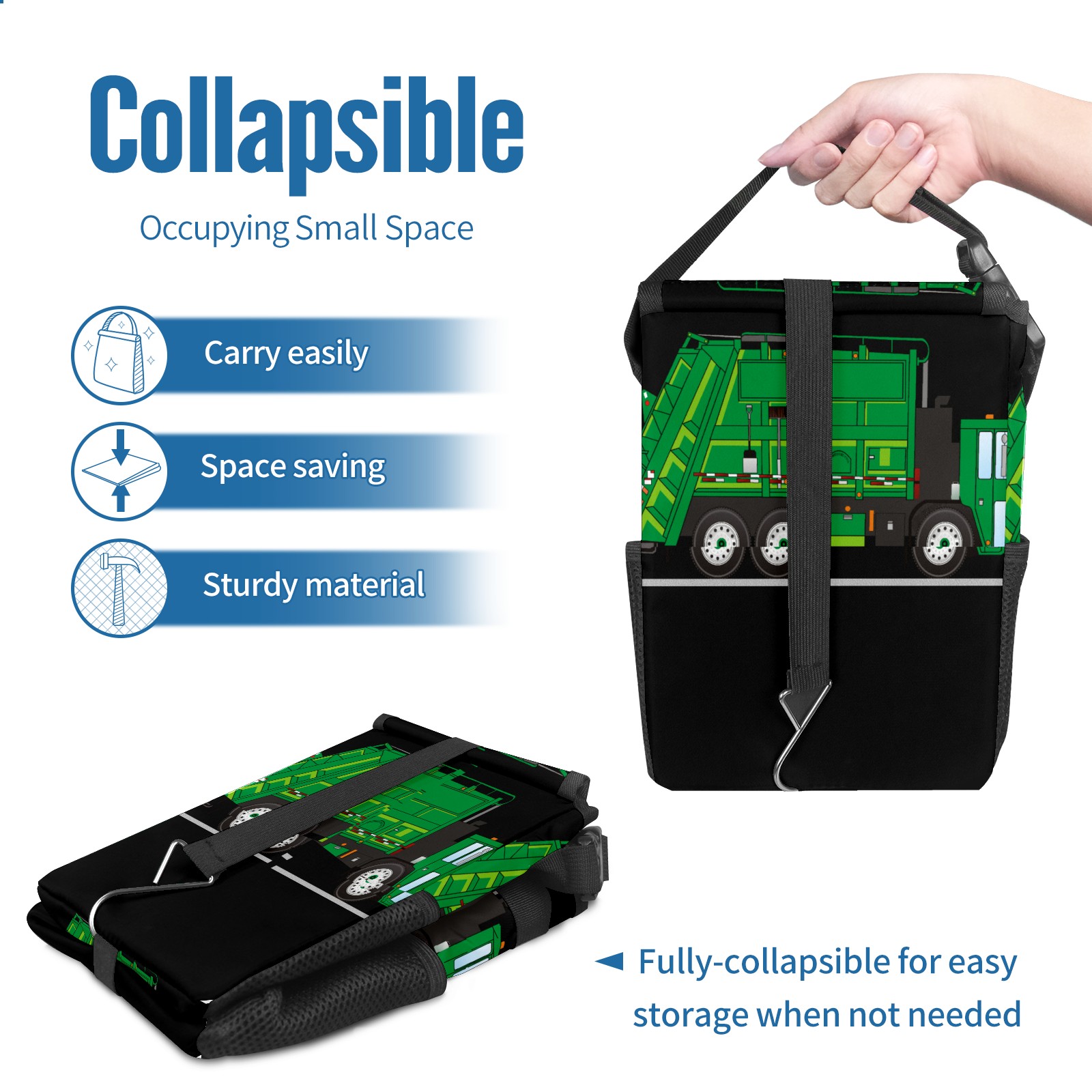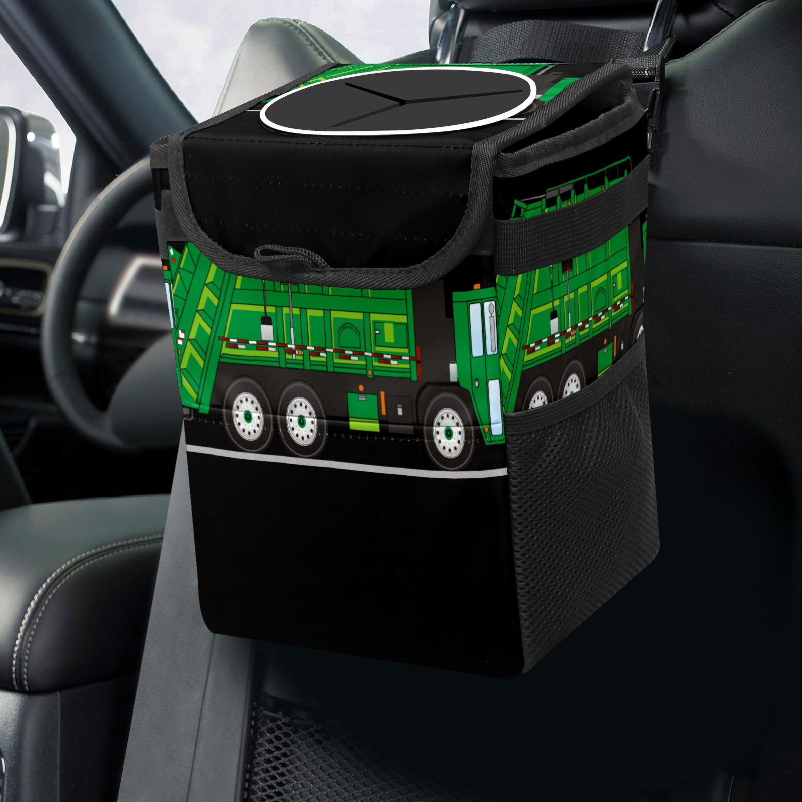 Car Garbage Can — Multi-functional, Lightweight Portable, Reusable Vehicle Trash Can, Waterproof with Sufficient Storage Capacity Green Cartoon Garbage Truck