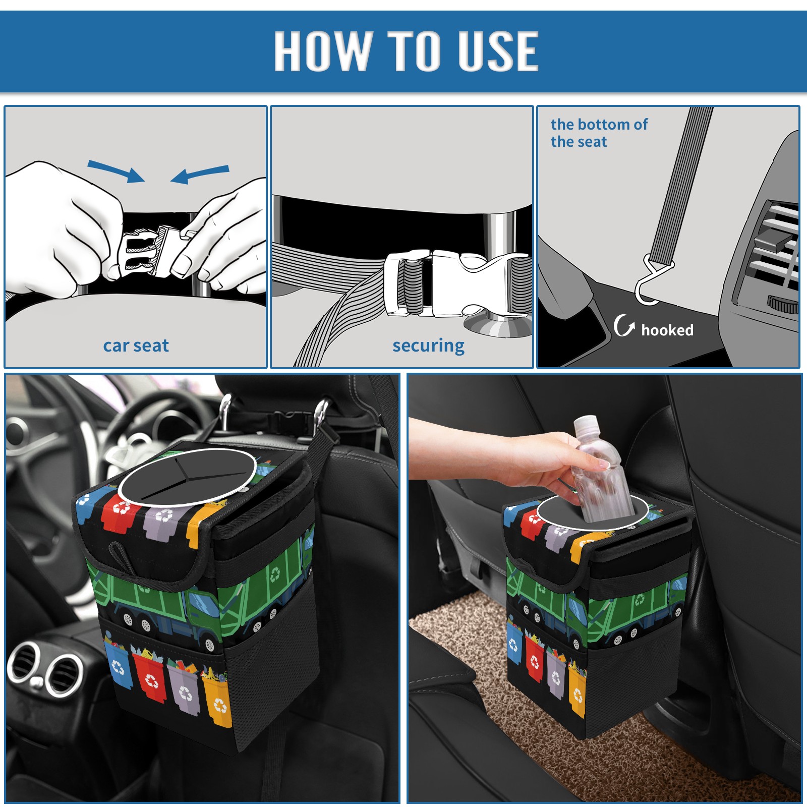 • <p>Keep your car neat with this practical car trash can—built for durability, versatility, and on-the-go convenience! Crafted from quality twill fabric with a waterproof lining, it prevents leaks, keeping seats/floors clean. Clean easily: empty directly or secure a disposable bag with side clips. Adjustable pull cord fits floor, seat, or headrest. 9.5x6.3x6.7 inches, ample space for daily trash, folds flat for storage. More than a trash can, it doubles as a storage bag for cups, toys, docs, and small gadgets—must-have car interior accessory. Installs in seconds on seats, console, or gear shift; adjustable straps keep it stable, no slipping on bumpy roads. Perfect gift for new car owners!</p>