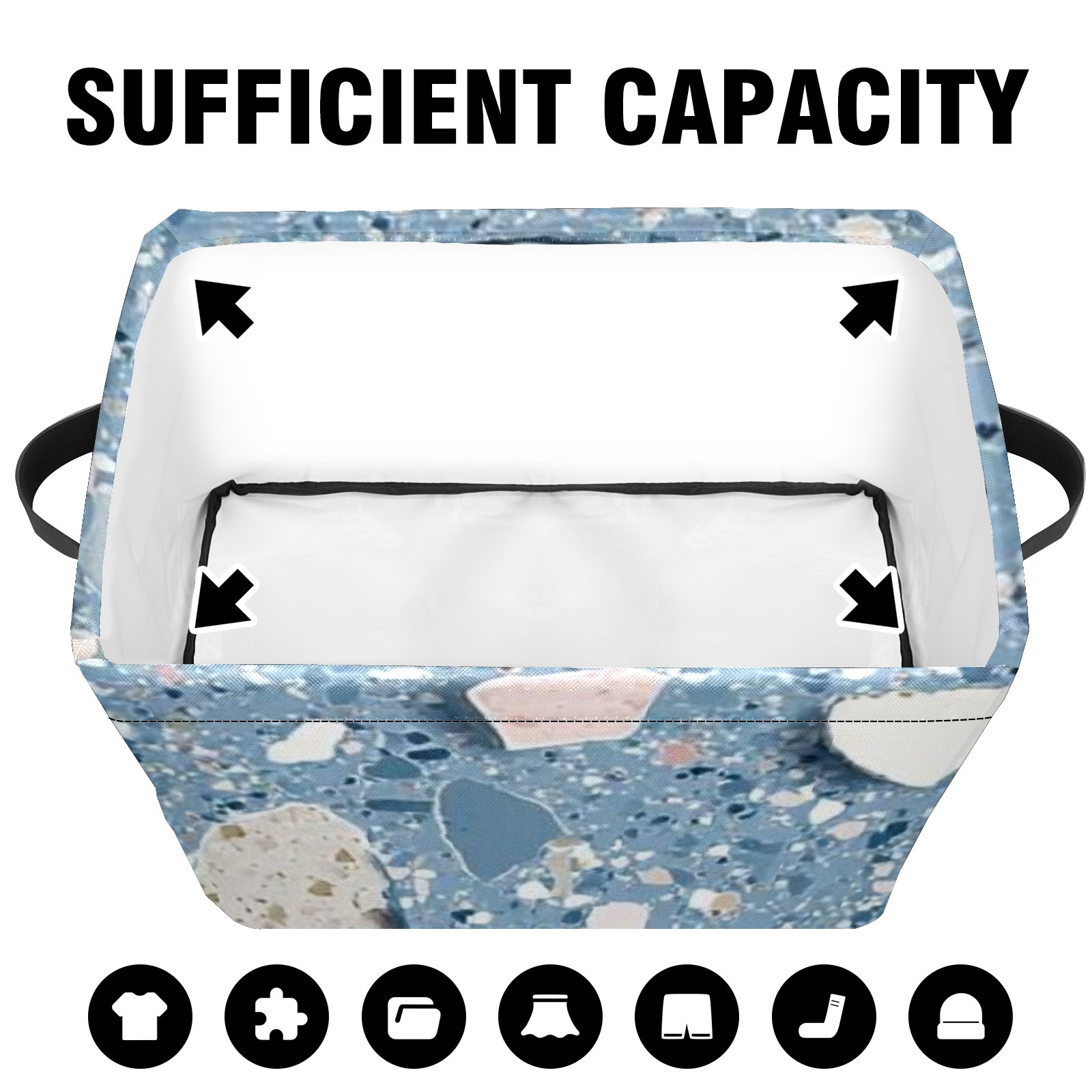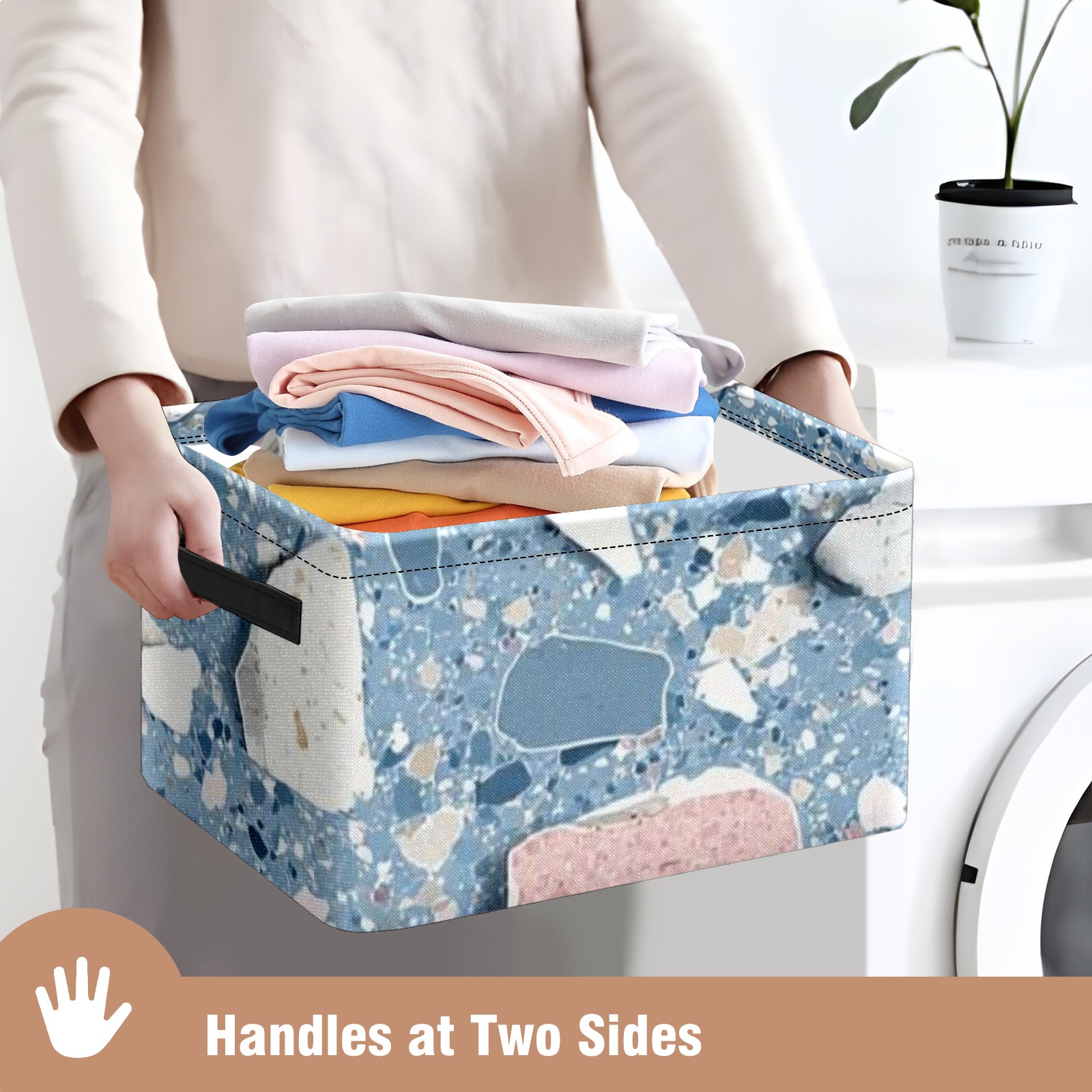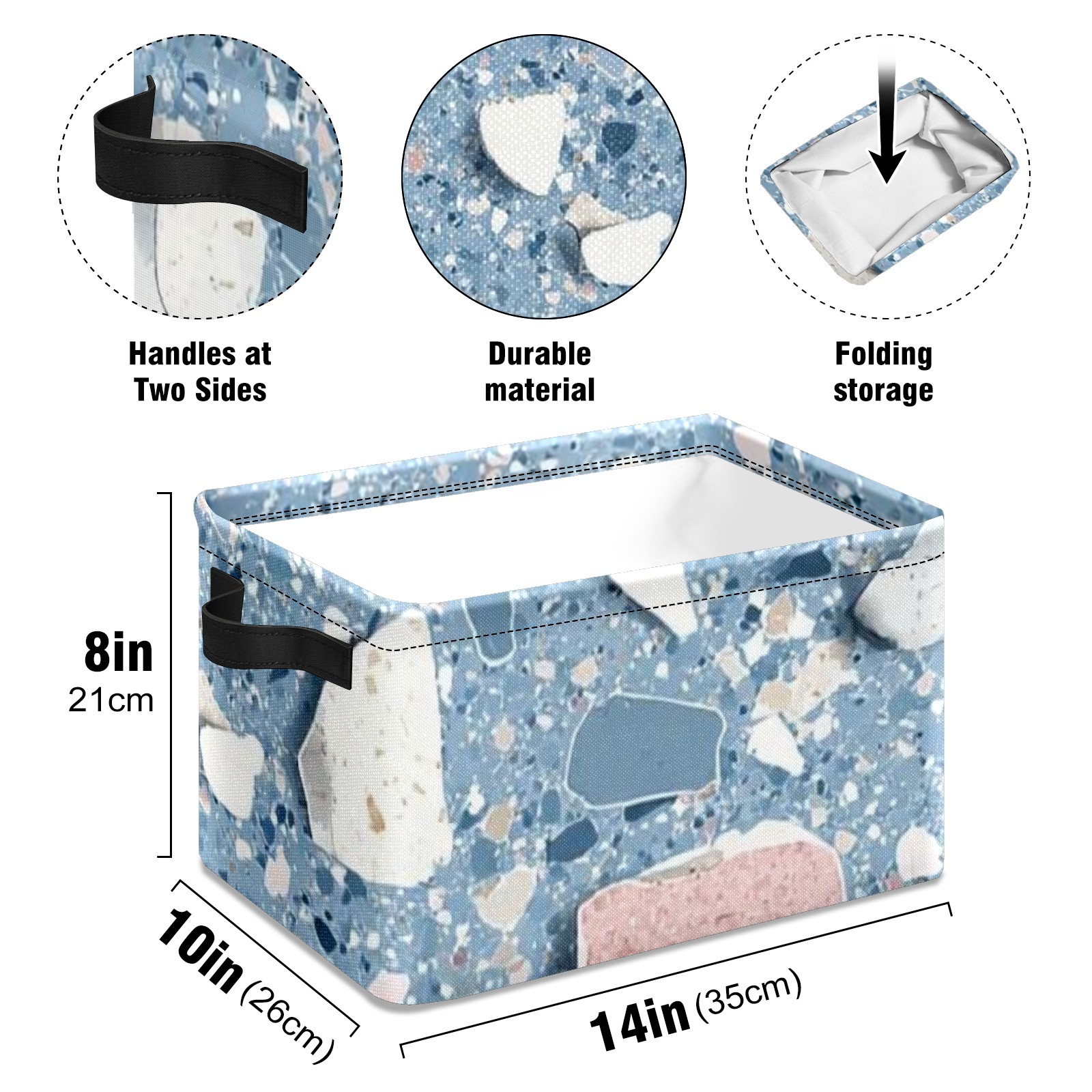 【Материал】Оксфордская ткань из полиэстера 600D; ручки изготовлены из полиэстера. 【Описание материала】Внешняя ткань: Оксфордская ткань полотняного переплетения высокой плотности 300D (ПВХ); Подкладка: белая ткань 750D; Ручки: черная композитная ткань 290T. 【Размер】26x35x21 см (10x14x8 дюймов) 【Описание продукта】Эта корзина для хранения с ручками с обеих сторон предлагает достаточно места для хранения предметов разных размеров, что делает ее подходящей для различных случаев, таких как дом, офис и школа. Ручки с обеих сторон закреплены гвоздями для долговечности. Прочный металлический каркас окружает корзину, поддерживая ее форму. Складная корзина для хранения: Наши корзины для хранения легко складываются, когда не используются. Эти ящики для хранения изготовлены из легко моющейся оксфордской ткани и при необходимости могут быть аккуратно протерты мягким мылом и водой. Из-за внутреннего металлического каркаса и жесткого дна машинная стирка не рекомендуется. 【Подходящие сценарии использования】Дом, офис и школа 【Инструкции по стирке】Рекомендуется ручная стирка; избегайте длительного воздействия прямых солнечных лучей.