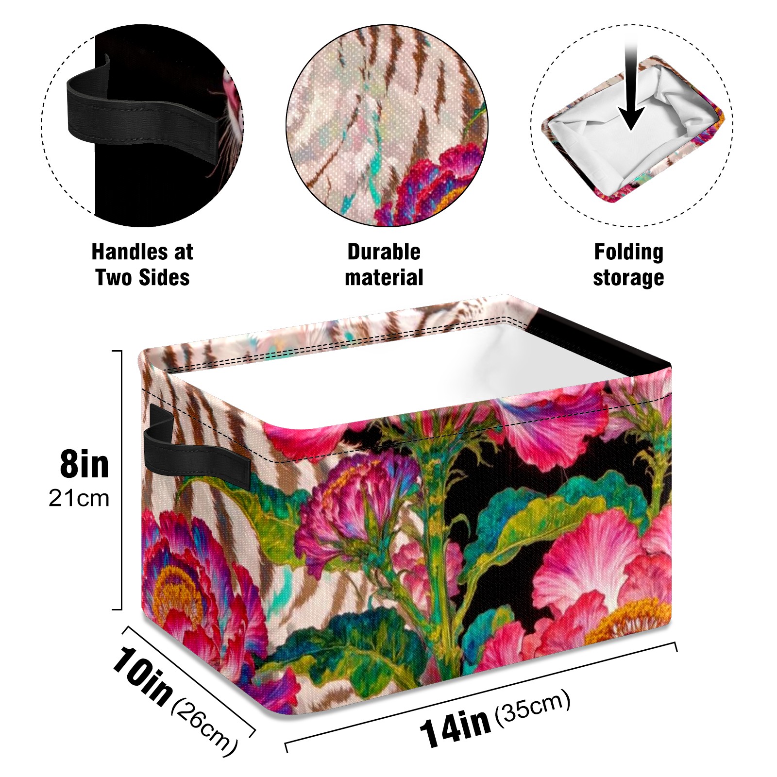 【Материал】Оксфордская ткань из полиэстера 600D; ручки изготовлены из полиэстера. 【Описание материала】Внешняя ткань: Оксфордская ткань полотняного переплетения высокой плотности 300D (ПВХ); Подкладка: белая ткань 750D; Ручки: черная композитная ткань 290T. 【Размер】26x35x21 см (10x14x8 дюймов) 【Описание продукта】Эта корзина для хранения с ручками с обеих сторон предлагает достаточно места для хранения предметов разных размеров, что делает ее подходящей для различных случаев, таких как дом, офис и школа. Ручки с обеих сторон закреплены гвоздями для долговечности. Прочный металлический каркас окружает корзину, поддерживая ее форму. Складная корзина для хранения: Наши корзины для хранения легко складываются, когда не используются. Эти ящики для хранения изготовлены из легко моющейся оксфордской ткани и при необходимости могут быть аккуратно протерты мягким мылом и водой. Из-за внутреннего металлического каркаса и жесткого дна машинная стирка не рекомендуется. 【Подходящие сценарии использования】Дом, офис и школа 【Инструкции по стирке】Рекомендуется ручная стирка; избегайте длительного воздействия прямых солнечных лучей.
