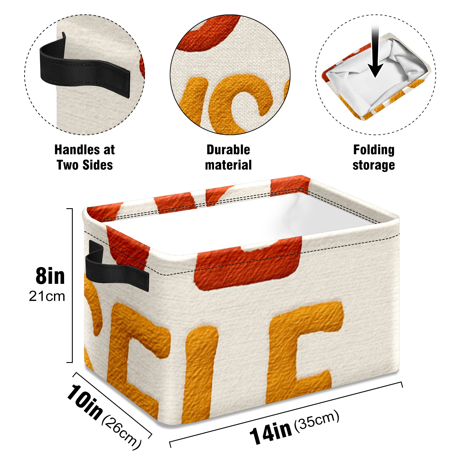 • 【Материал】Оксфордская ткань из полиэстера 600D; ручки изготовлены из полиэстера. 【Описание материала】Внешняя ткань: Оксфордская ткань полотняного переплетения высокой плотности 300D (ПВХ); Подкладка: белая ткань 750D; Ручки: черная композитная ткань 290T. 【Размер】26x35x21 см (10x14x8 дюймов) 【Описание продукта】Эта корзина для хранения с ручками с обеих сторон предлагает достаточно места для хранения предметов разных размеров, что делает ее подходящей для различных случаев, таких как дом, офис и школа. Ручки с обеих сторон закреплены гвоздями для долговечности. Прочный металлический каркас окружает корзину, поддерживая ее форму. Складная корзина для хранения: Наши корзины для хранения легко складываются, когда не используются. Эти ящики для хранения изготовлены из легко моющейся оксфордской ткани и при необходимости могут быть аккуратно протерты мягким мылом и водой. Из-за внутреннего металлического каркаса и жесткого дна машинная стирка не рекомендуется. 【Подходящие сценарии использования】Дом, офис и школа 【Инструкции по стирке】Рекомендуется ручная стирка; избегайте длительного воздействия прямых солнечных лучей.