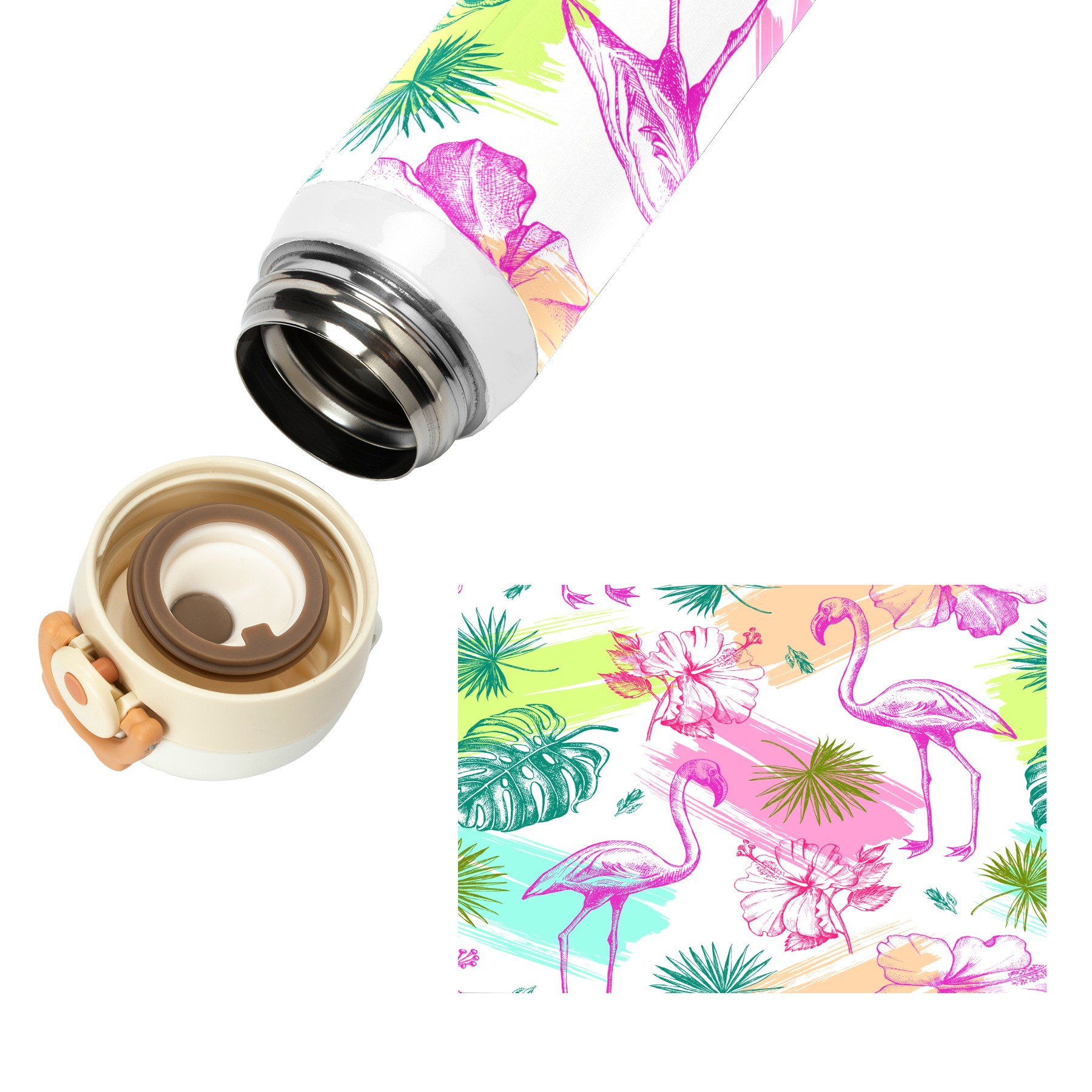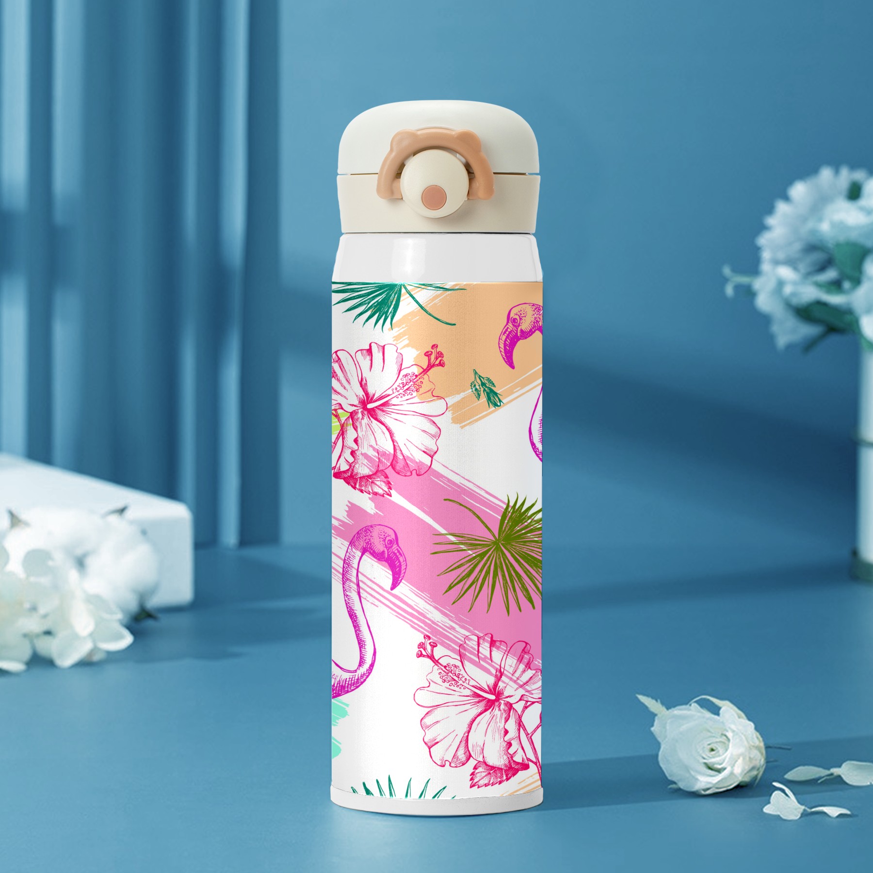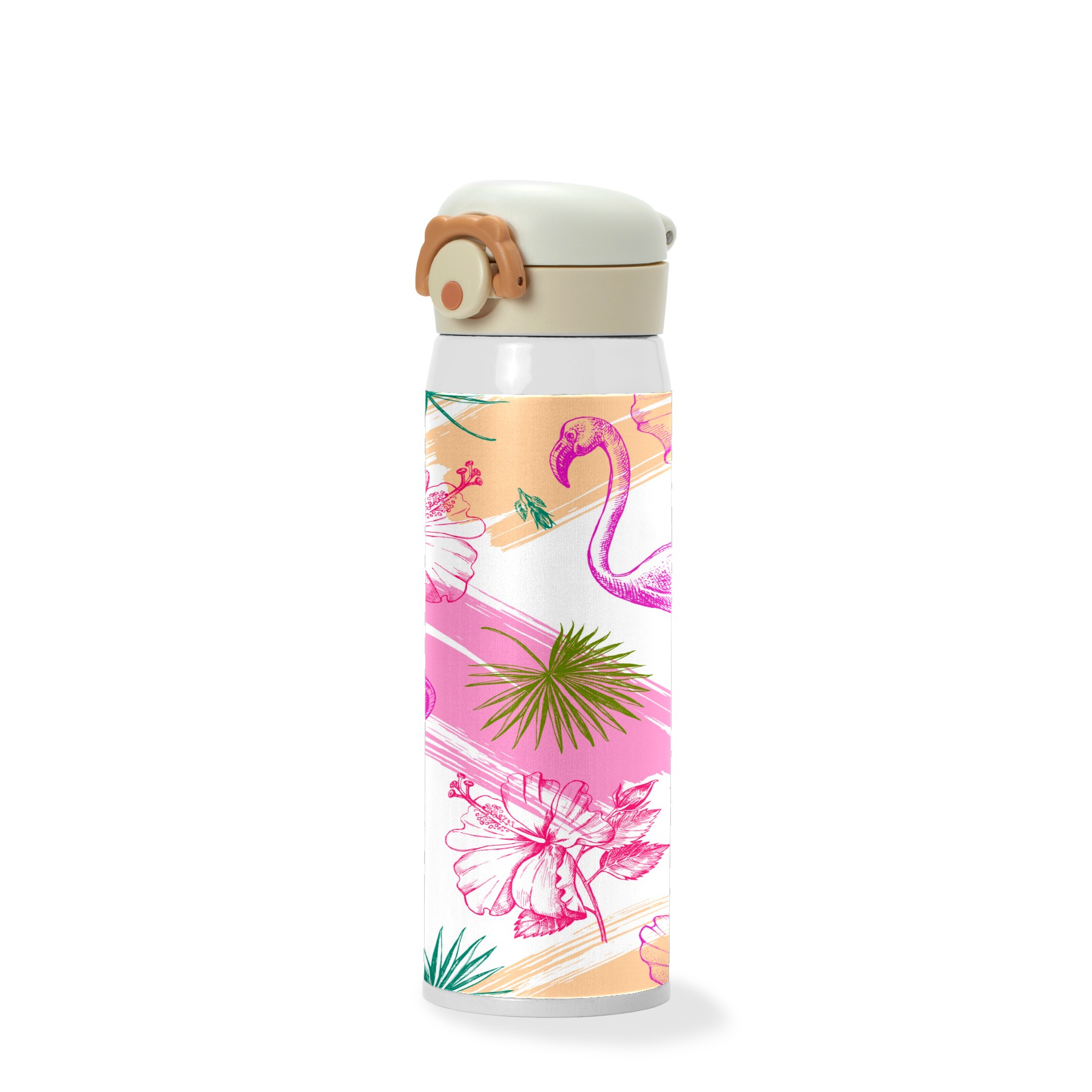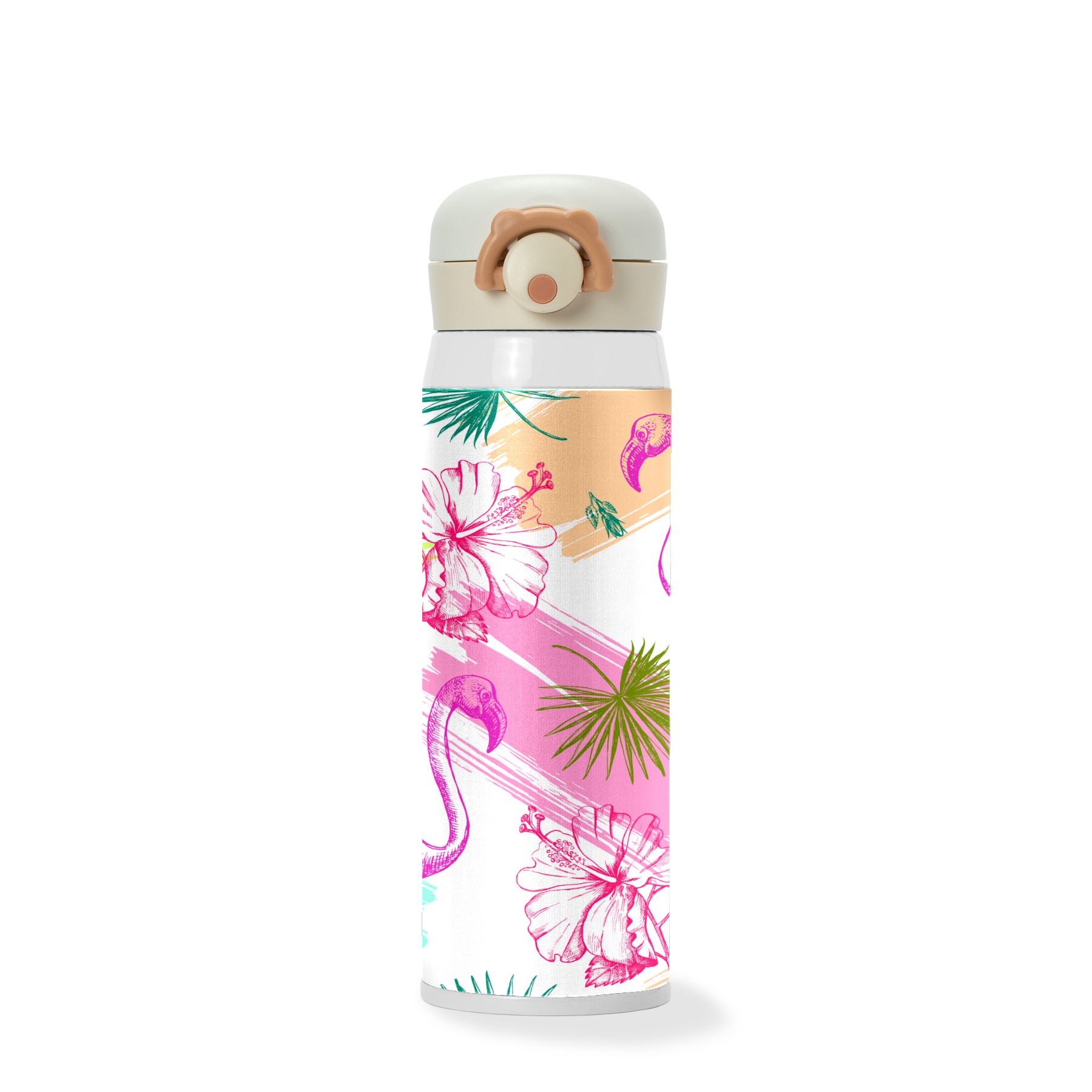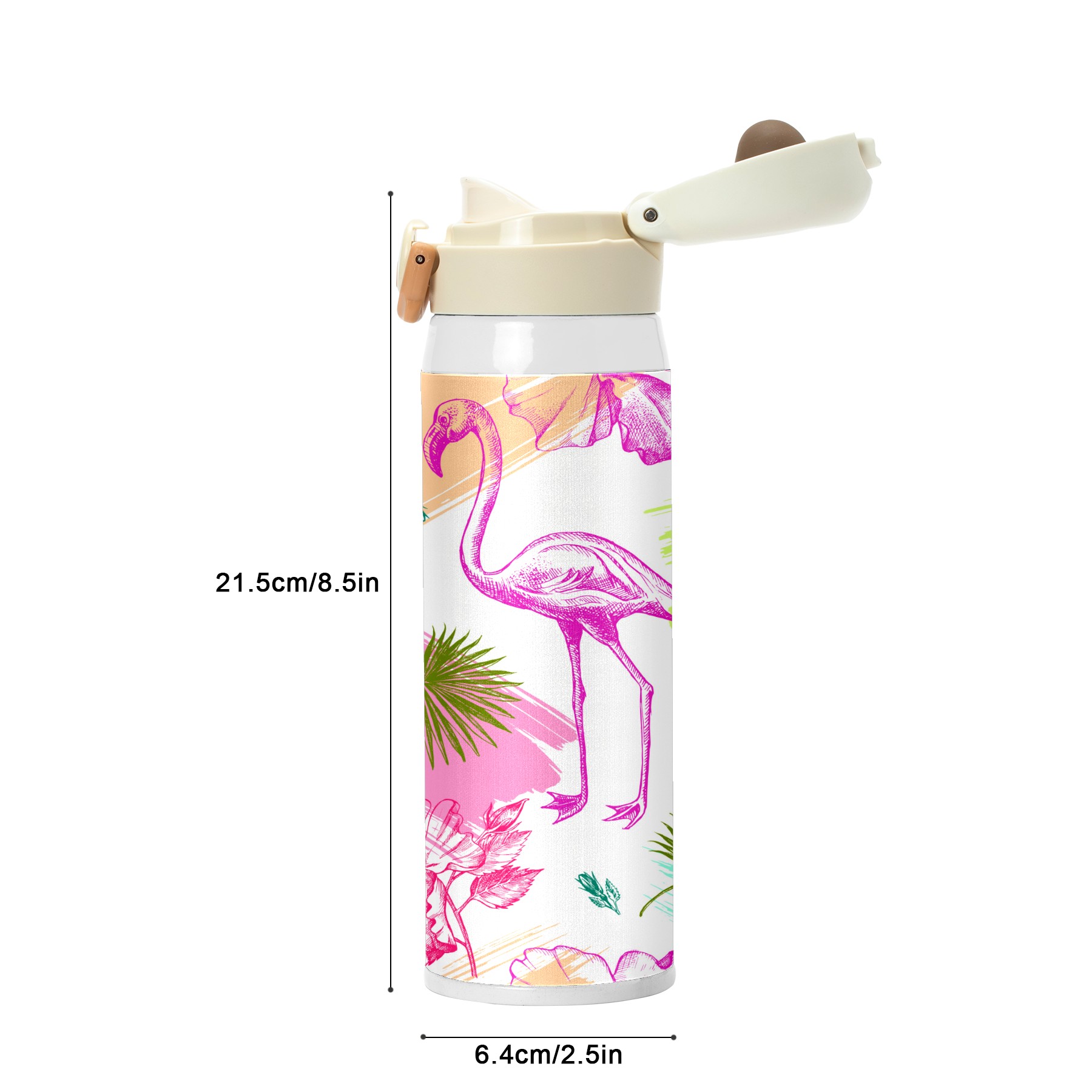 Colorful Tropical Flamingo With Palm Leaves