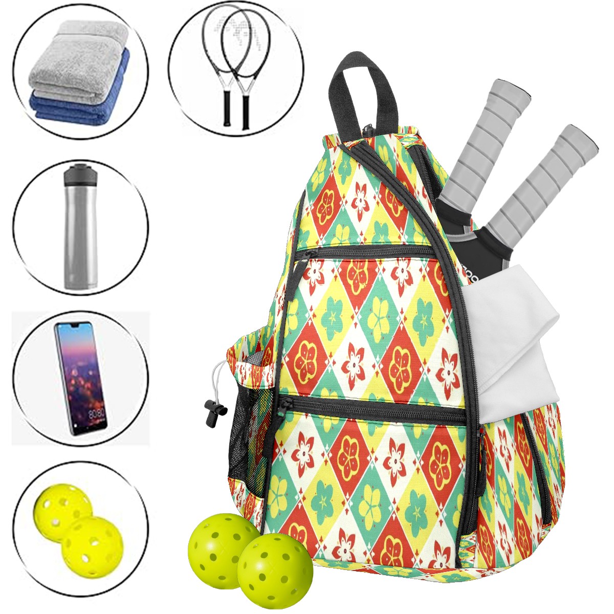 Multifunctional Pickleball Bag,Large Capacity Sports Pickleball Racket Bag, Water Bottle Holder and Fence Hook,Suitable for Both Men Women -Colorful Petals