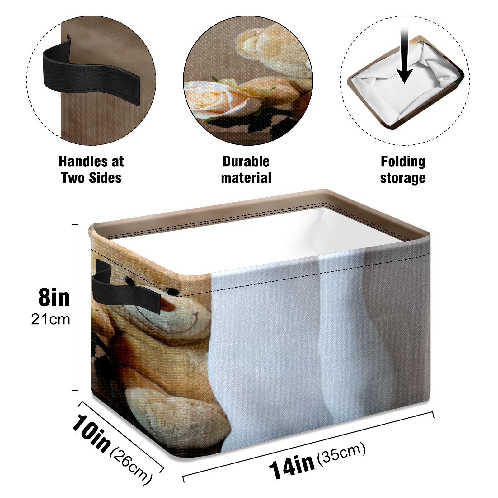 【Материал】Оксфордская ткань из полиэстера 600D; ручки изготовлены из полиэстера. 【Описание материала】Внешняя ткань: Оксфордская ткань полотняного переплетения высокой плотности 300D (ПВХ); Подкладка: белая ткань 750D; Ручки: черная композитная ткань 290T. 【Размер】26x35x21 см (10x14x8 дюймов) 【Описание продукта】Эта корзина для хранения с ручками с обеих сторон предлагает достаточно места для хранения предметов разных размеров, что делает ее подходящей для различных случаев, таких как дом, офис и школа. Ручки с обеих сторон закреплены гвоздями для долговечности. Прочный металлический каркас окружает корзину, поддерживая ее форму. Складная корзина для хранения: Наши корзины для хранения легко складываются, когда не используются. Эти ящики для хранения изготовлены из легко моющейся оксфордской ткани и при необходимости могут быть аккуратно протерты мягким мылом и водой. Из-за внутреннего металлического каркаса и жесткого дна машинная стирка не рекомендуется. 【Подходящие сценарии использования】Дом, офис и школа 【Инструкции по стирке】Рекомендуется ручная стирка; избегайте длительного воздействия прямых солнечных лучей.