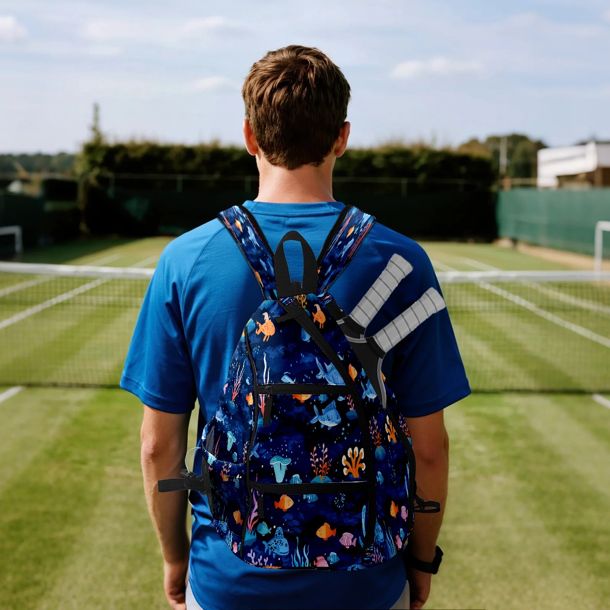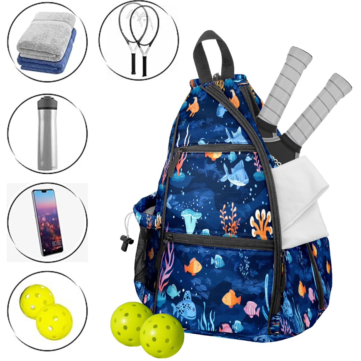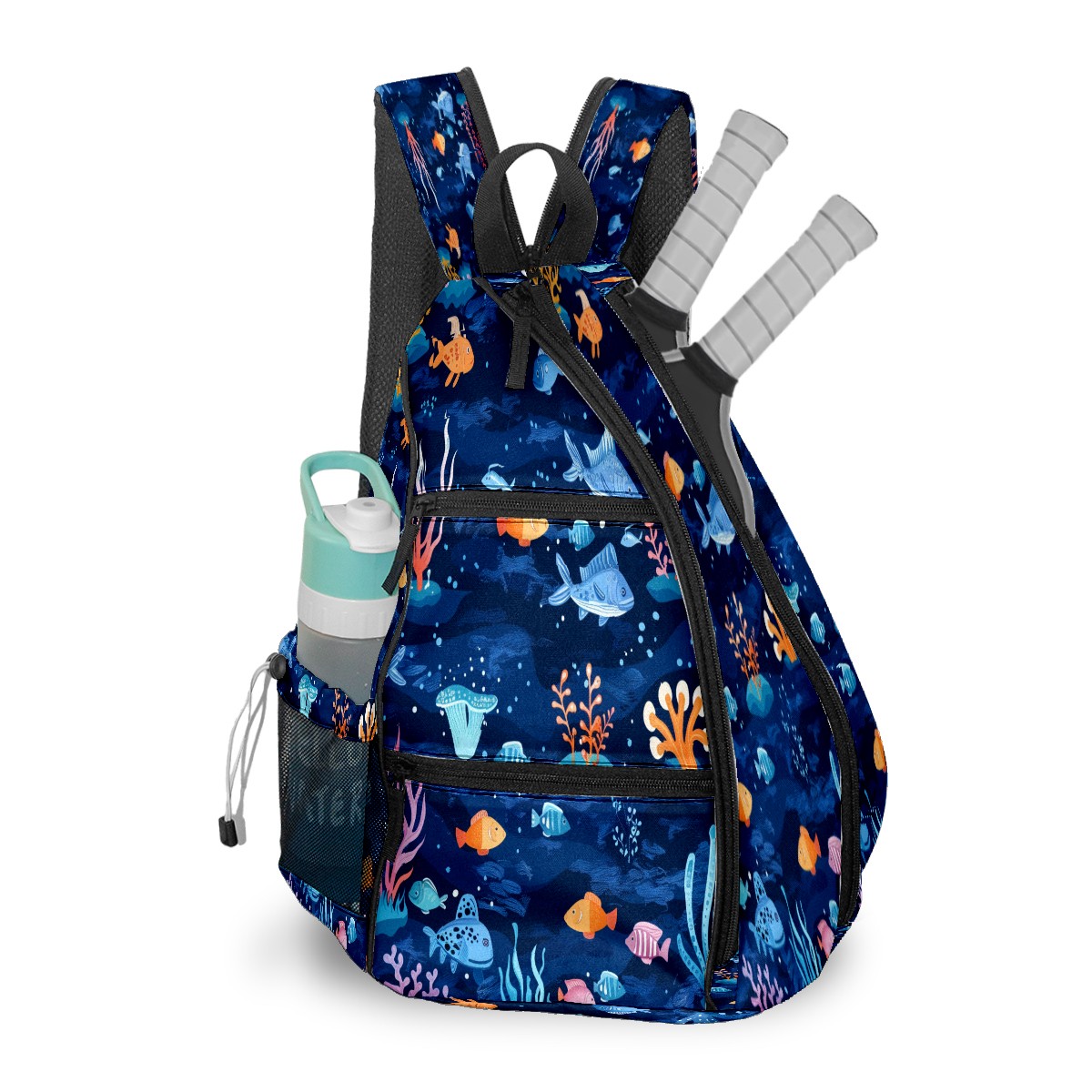 Multifunctional Pickleball Bag,Large Capacity Sports Pickleball Racket Bag, Water Bottle Holder and Fence Hook,Suitable for Both Men Women -Many Fish