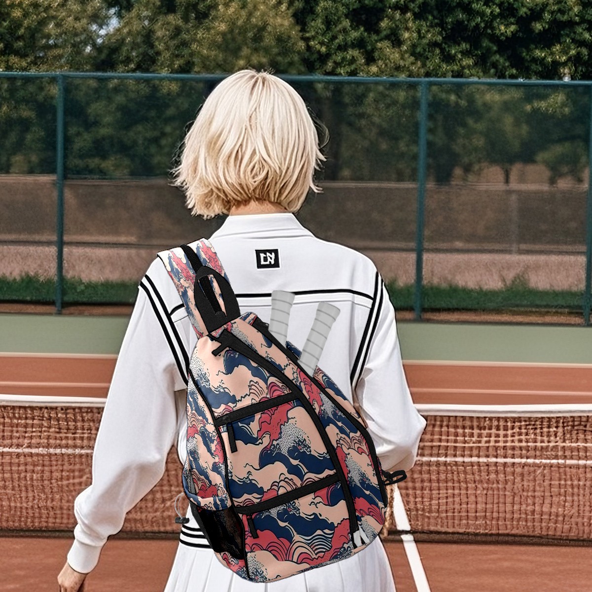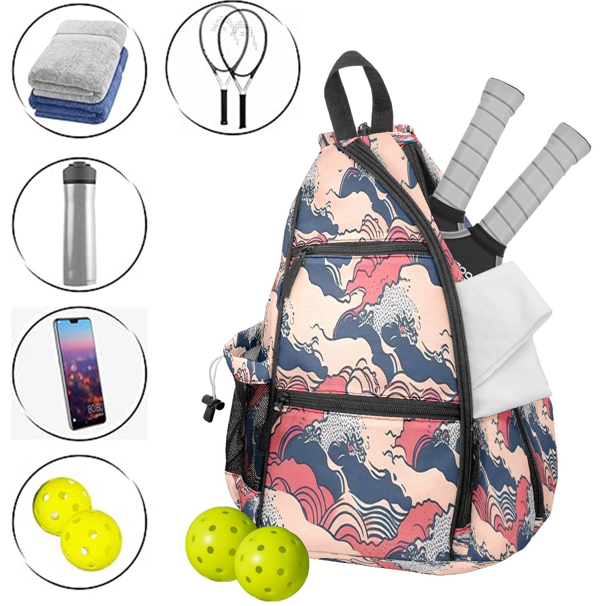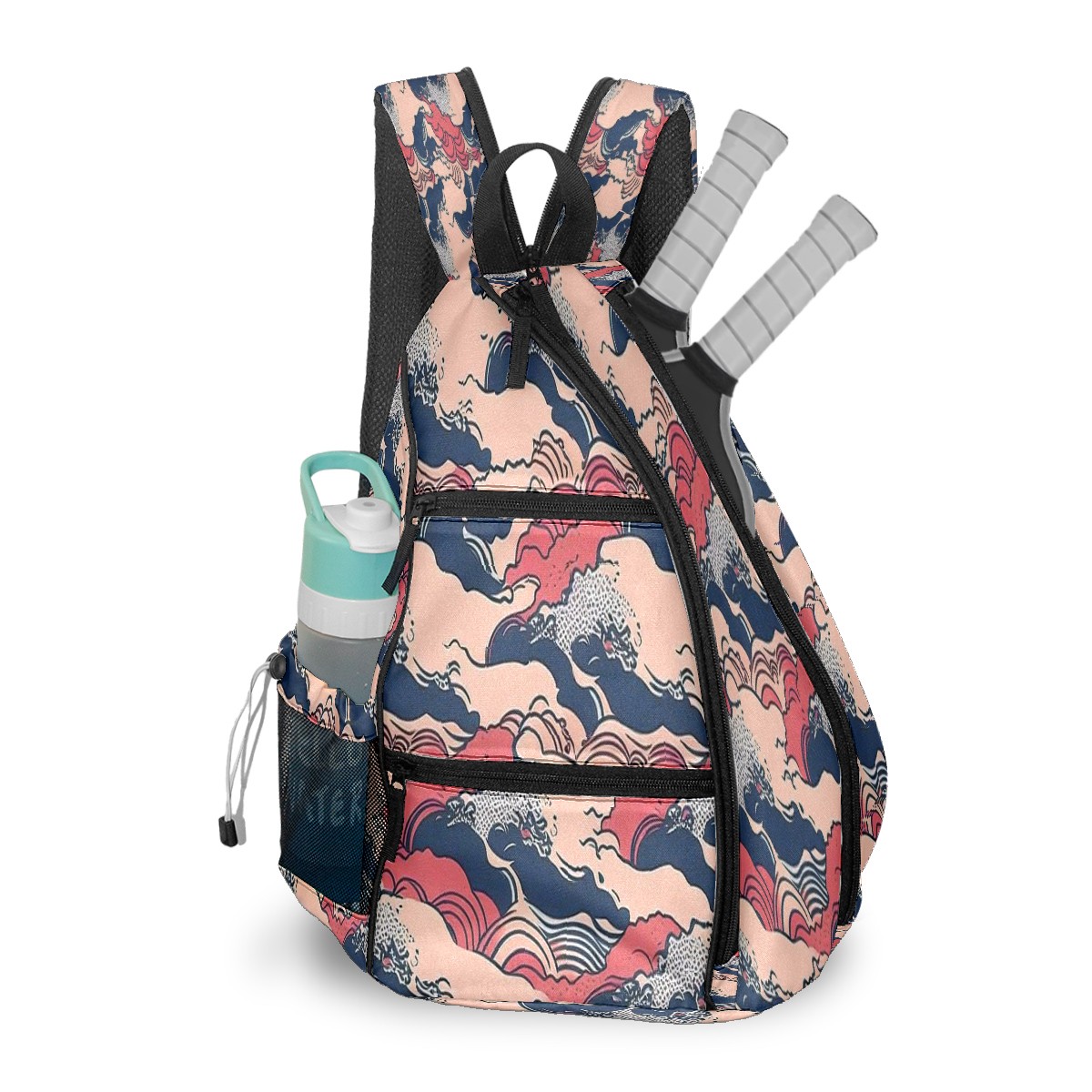Multifunctional Pickleball Bag,Large Capacity Sports Pickleball Racket Bag, Water Bottle Holder and Fence Hook,Suitable for Both Men Women -Waves Print