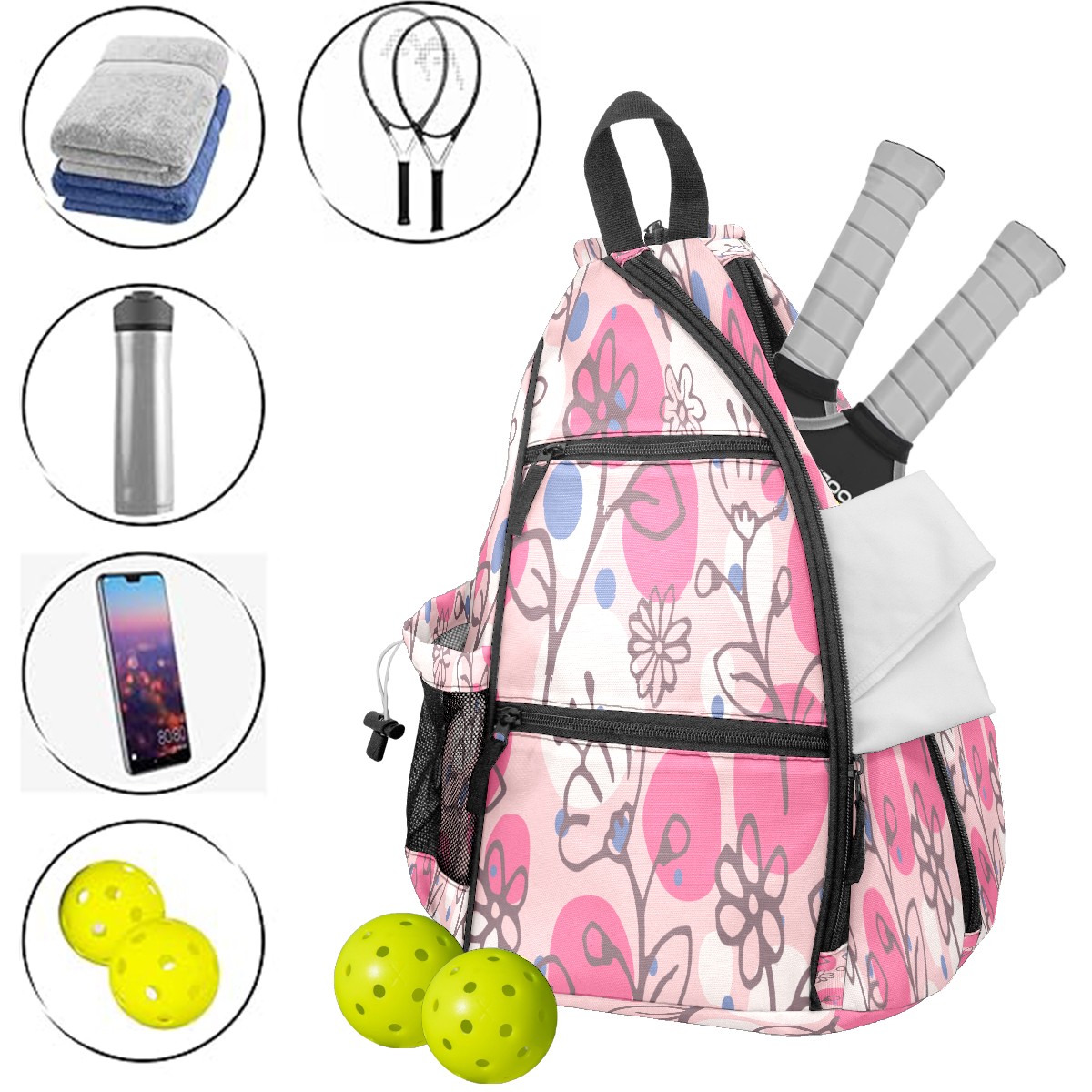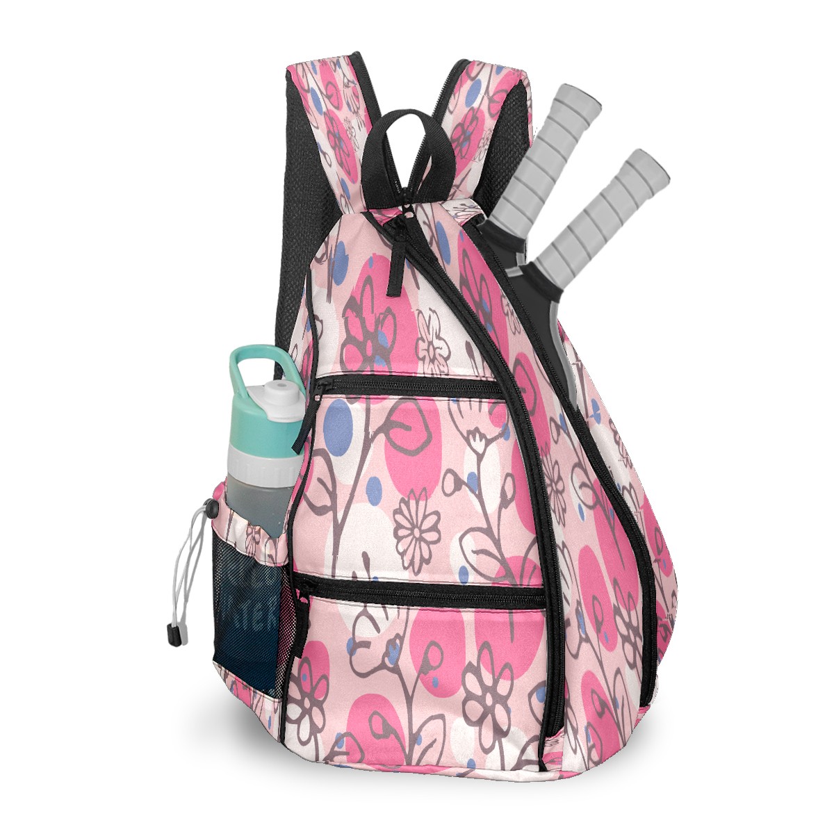 Multifunctional Pickleball Bag,Large Capacity Sports Pickleball Racket Bag, Water Bottle Holder and Fence Hook,Suitable for Both Men Women -Flowers Pattern