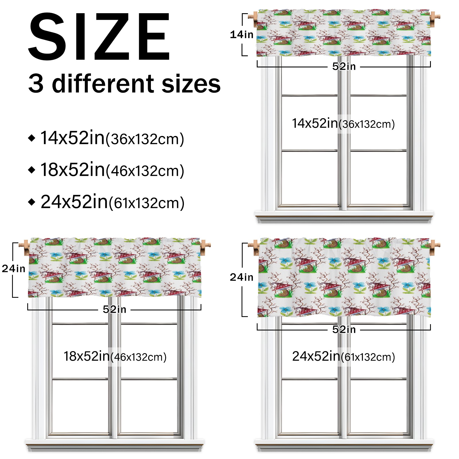 • <p>This rod-pocket curtain combines functionality and style, making it an ideal choice for home window decoration. Available in three practical sizes—14×52 inches, 18×52 inches, and 24×52 inches—it fits most standard curtain rods. Made from high-quality polyester, it's durable and comfortable, resisting wear and deformation from daily use. Its semi-blackout properties and moderate thickness balance light intensity, allowing for views while maintaining privacy, ensuring a balanced experience.</p><p>It's suitable for a variety of spaces and is ideal for covering the upper half of windows in areas like kitchens, bathrooms, laundry rooms, and studios. For a coordinated look, pair with matching curtain fabrics in the same pattern. Cleaning is also easy: machine washable in cold water without bleaching, tumble dry on low, and gently iron for finishing touches, making it easy to maintain even on a busy schedule.</p><p>Whether you're looking to refresh a small window or add a finishing touch to a room, this curtain effortlessly enhances the space with its practicality and aesthetic.</p>