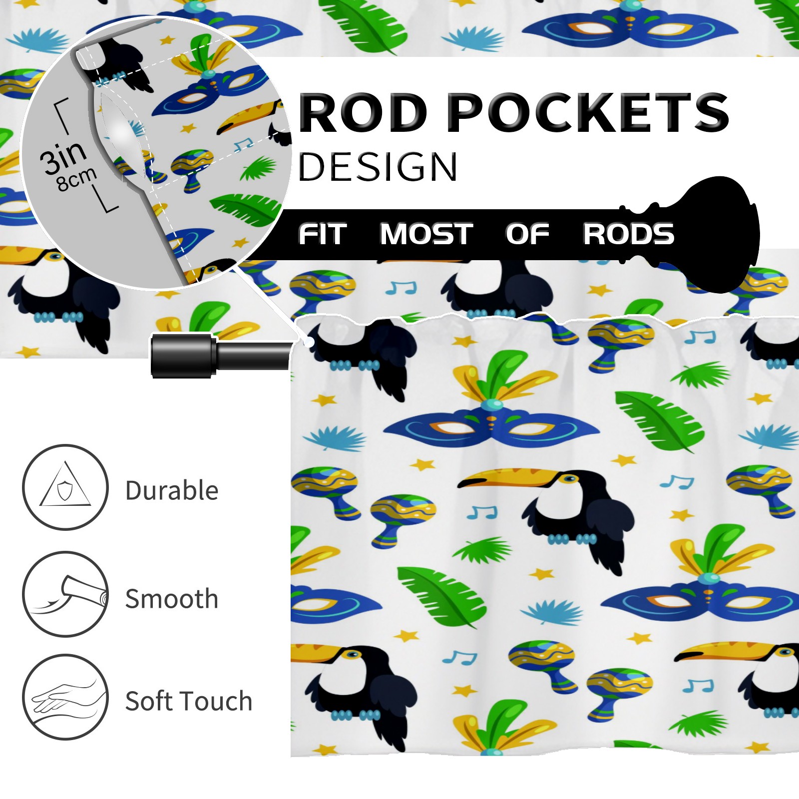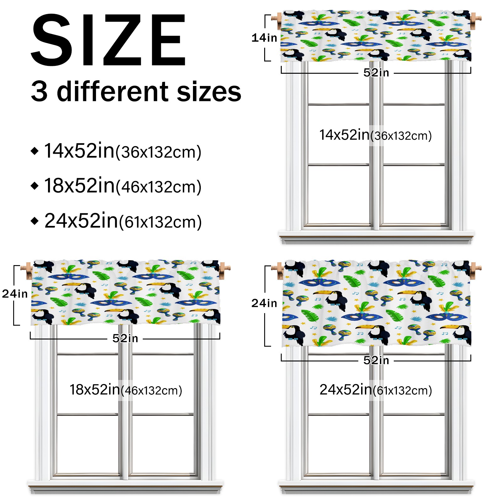 • <p>This rod-pocket curtain combines functionality and style, making it an ideal choice for home window decoration. Available in three practical sizes—14×52 inches, 18×52 inches, and 24×52 inches—it fits most standard curtain rods. Made from high-quality polyester, it's durable and comfortable, resisting wear and deformation from daily use. Its semi-blackout properties and moderate thickness balance light intensity, allowing for views while maintaining privacy, ensuring a balanced experience.</p><p>It's suitable for a variety of spaces and is ideal for covering the upper half of windows in areas like kitchens, bathrooms, laundry rooms, and studios. For a coordinated look, pair with matching curtain fabrics in the same pattern. Cleaning is also easy: machine washable in cold water without bleaching, tumble dry on low, and gently iron for finishing touches, making it easy to maintain even on a busy schedule.</p><p>Whether you're looking to refresh a small window or add a finishing touch to a room, this curtain effortlessly enhances the space with its practicality and aesthetic.</p>
