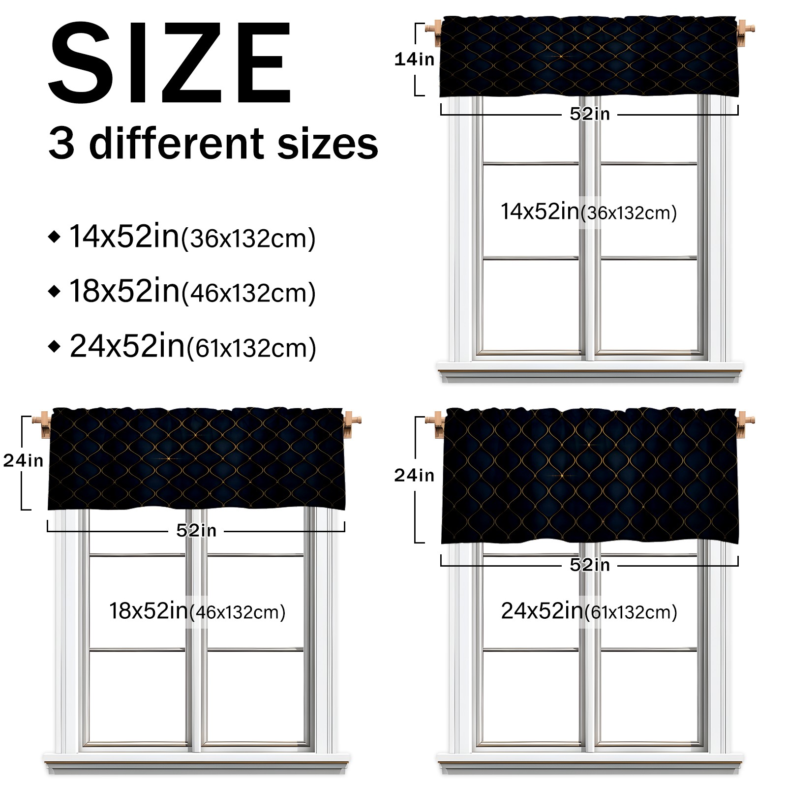 • <p>This rod-pocket curtain combines functionality and style, making it an ideal choice for home window decoration. Available in three practical sizes—14×52 inches, 18×52 inches, and 24×52 inches—it fits most standard curtain rods. Made from high-quality polyester, it's durable and comfortable, resisting wear and deformation from daily use. Its semi-blackout properties and moderate thickness balance light intensity, allowing for views while maintaining privacy, ensuring a balanced experience.</p><p>It's suitable for a variety of spaces and is ideal for covering the upper half of windows in areas like kitchens, bathrooms, laundry rooms, and studios. For a coordinated look, pair with matching curtain fabrics in the same pattern. Cleaning is also easy: machine washable in cold water without bleaching, tumble dry on low, and gently iron for finishing touches, making it easy to maintain even on a busy schedule.</p><p>Whether you're looking to refresh a small window or add a finishing touch to a room, this curtain effortlessly enhances the space with its practicality and aesthetic.</p>