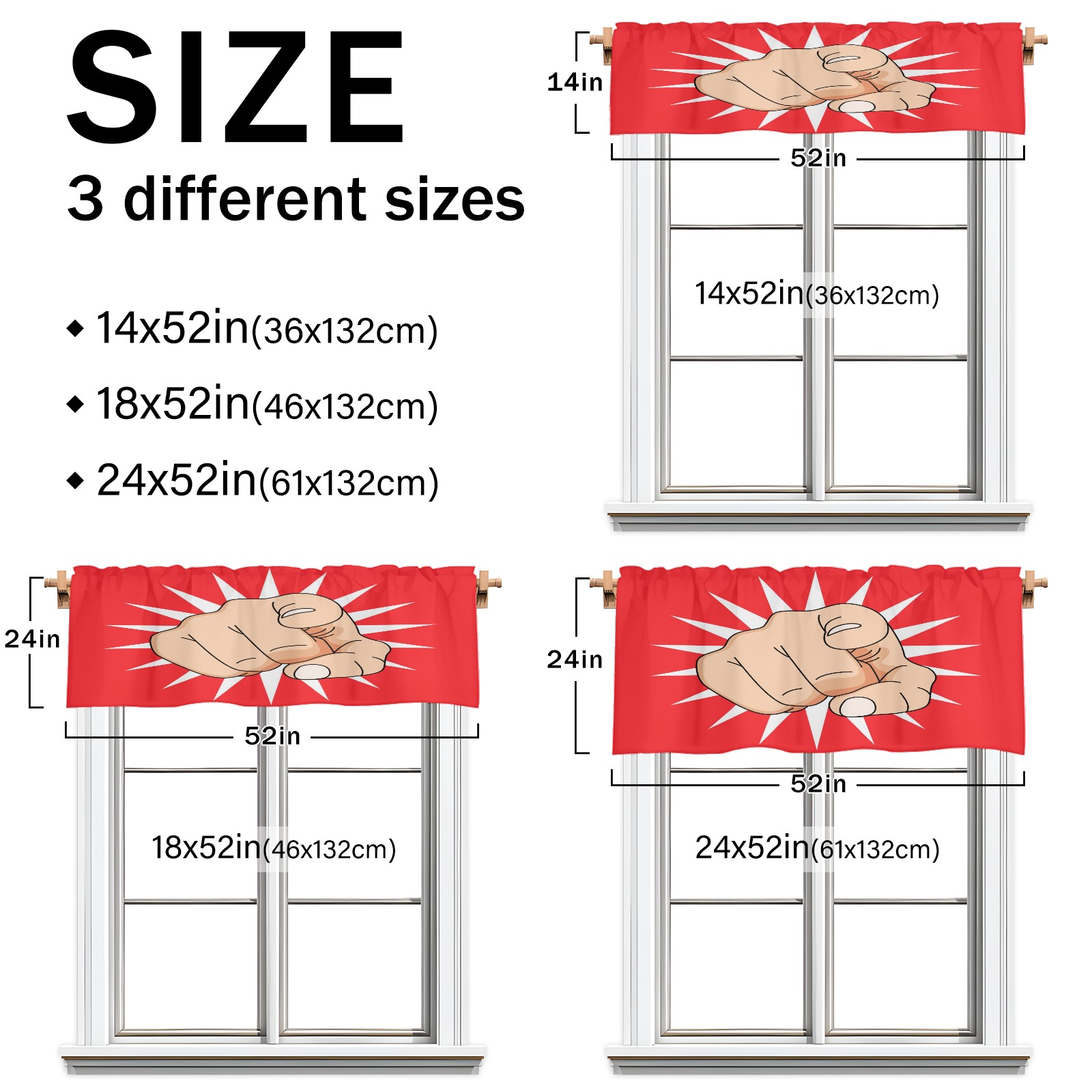 • <p>This rod-pocket curtain combines functionality and style, making it an ideal choice for home window decoration. Available in three practical sizes—14×52 inches, 18×52 inches, and 24×52 inches—it fits most standard curtain rods. Made from high-quality polyester, it's durable and comfortable, resisting wear and deformation from daily use. Its semi-blackout properties and moderate thickness balance light intensity, allowing for views while maintaining privacy, ensuring a balanced experience.</p><p>It's suitable for a variety of spaces and is ideal for covering the upper half of windows in areas like kitchens, bathrooms, laundry rooms, and studios. For a coordinated look, pair with matching curtain fabrics in the same pattern. Cleaning is also easy: machine washable in cold water without bleaching, tumble dry on low, and gently iron for finishing touches, making it easy to maintain even on a busy schedule.</p><p>Whether you're looking to refresh a small window or add a finishing touch to a room, this curtain effortlessly enhances the space with its practicality and aesthetic.</p>