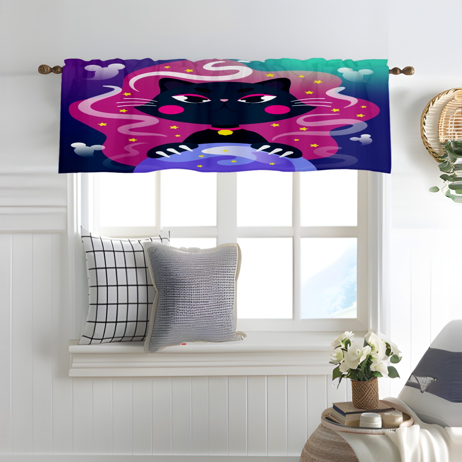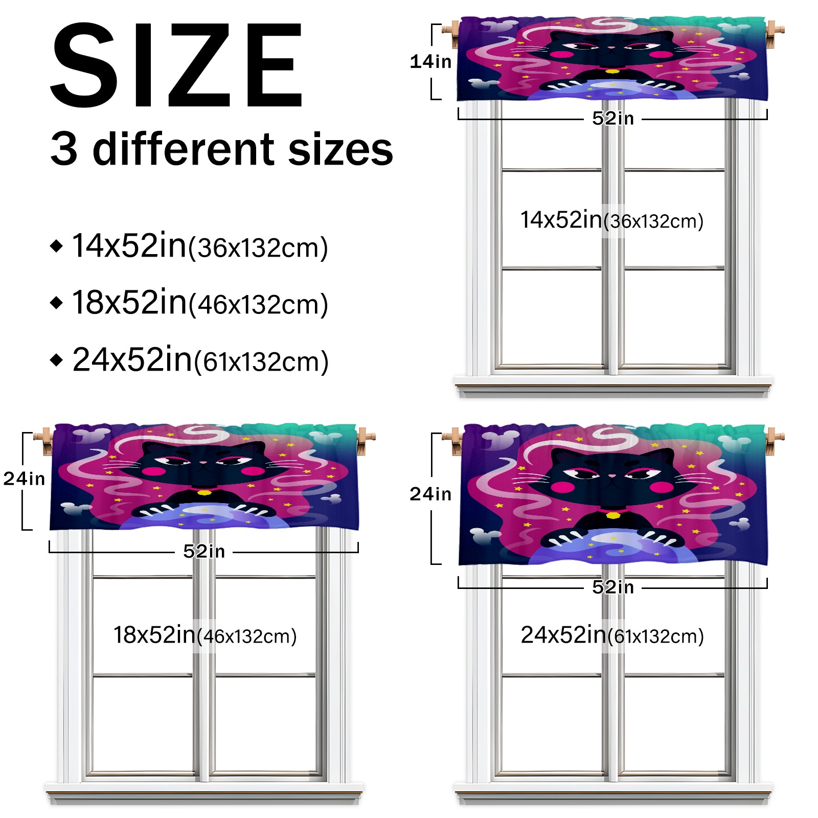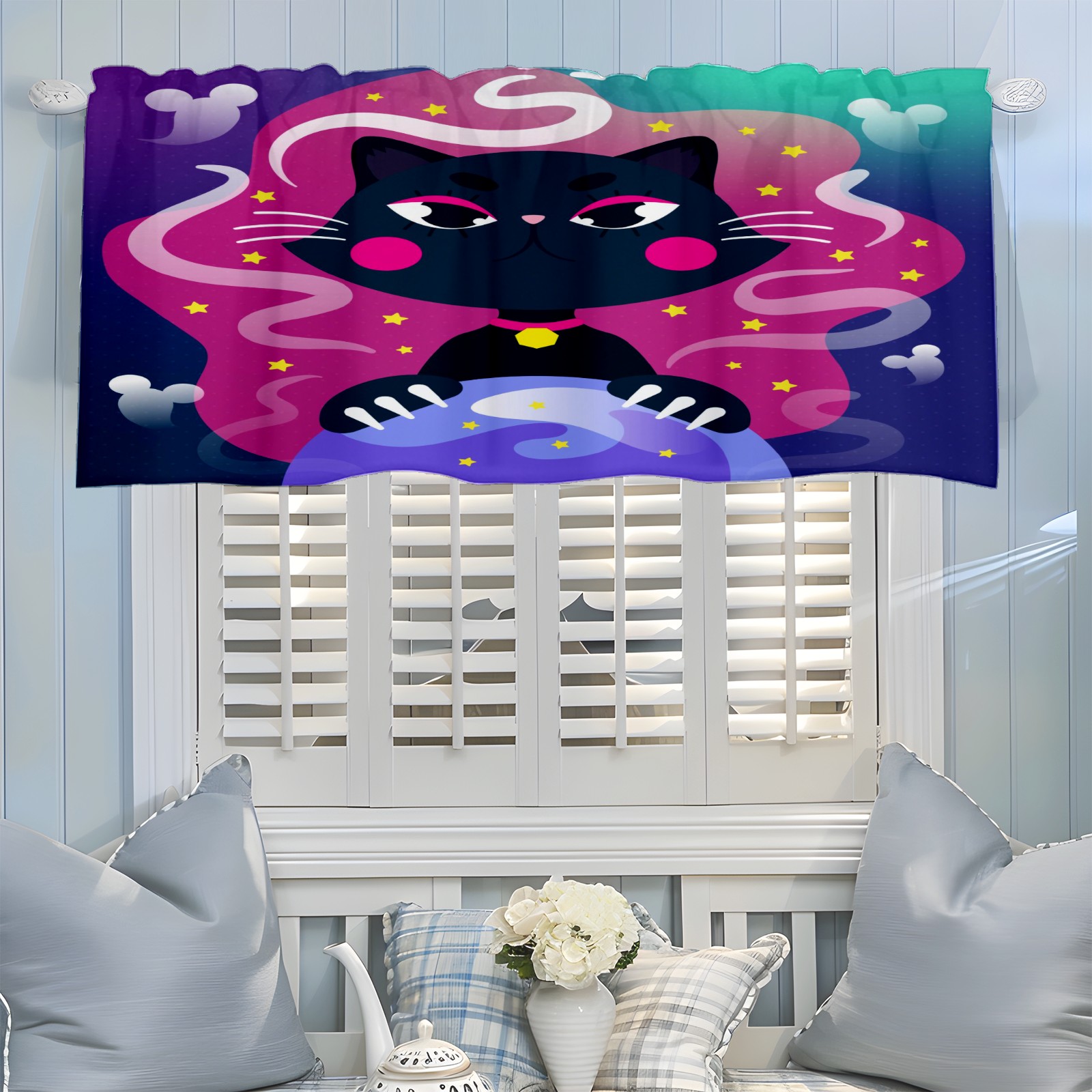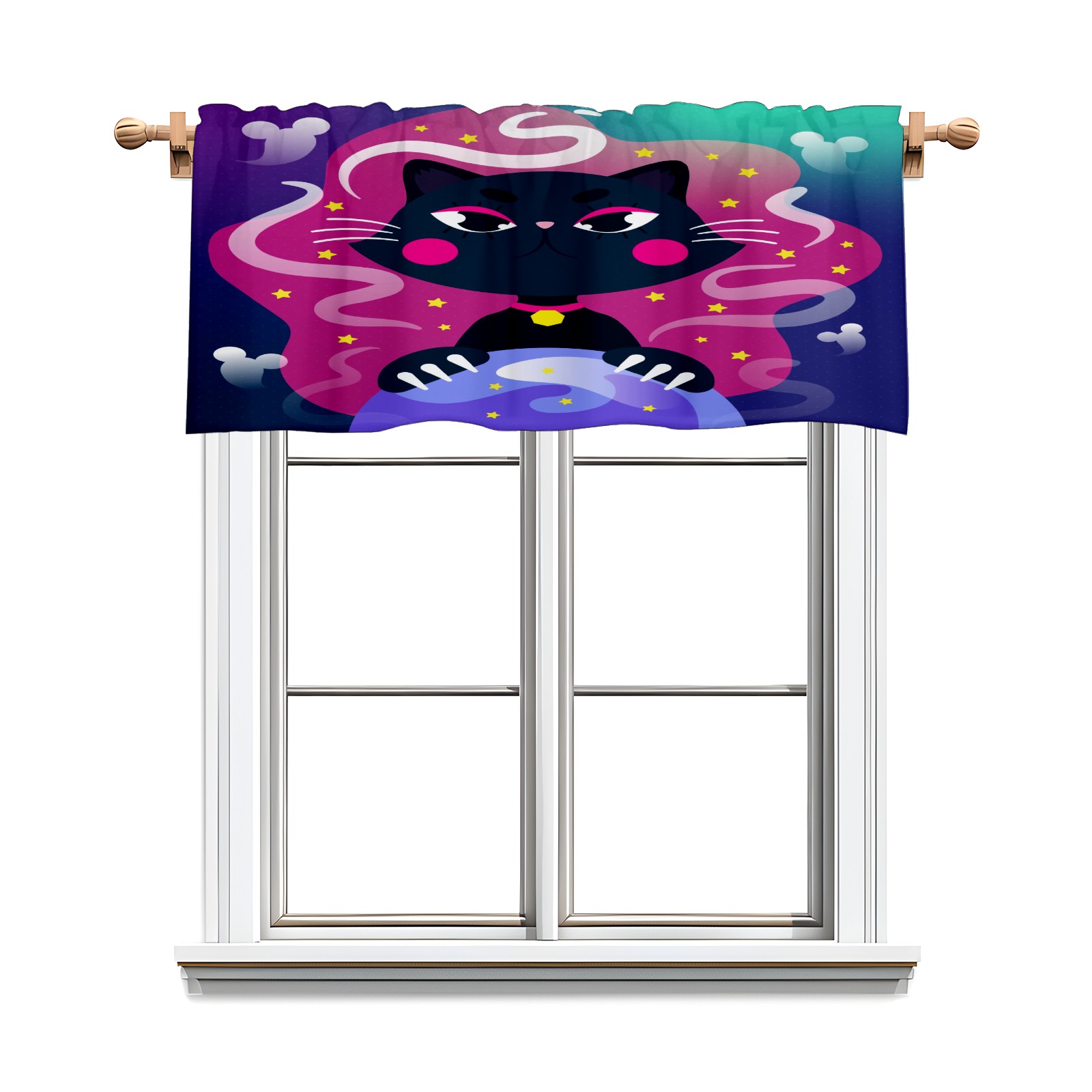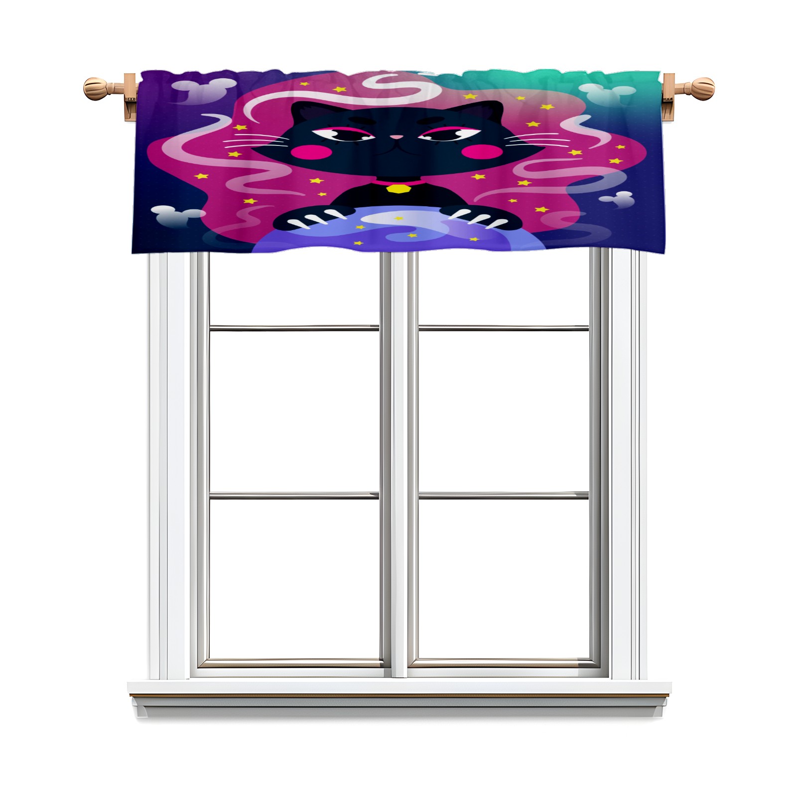 Blackout Curtain Valance for Living Room/Bathroom/Kitchen Valance Rod Pocket Curtain 14 x 52 Inches Halloween Black Cat-cartoon Crystal Globe