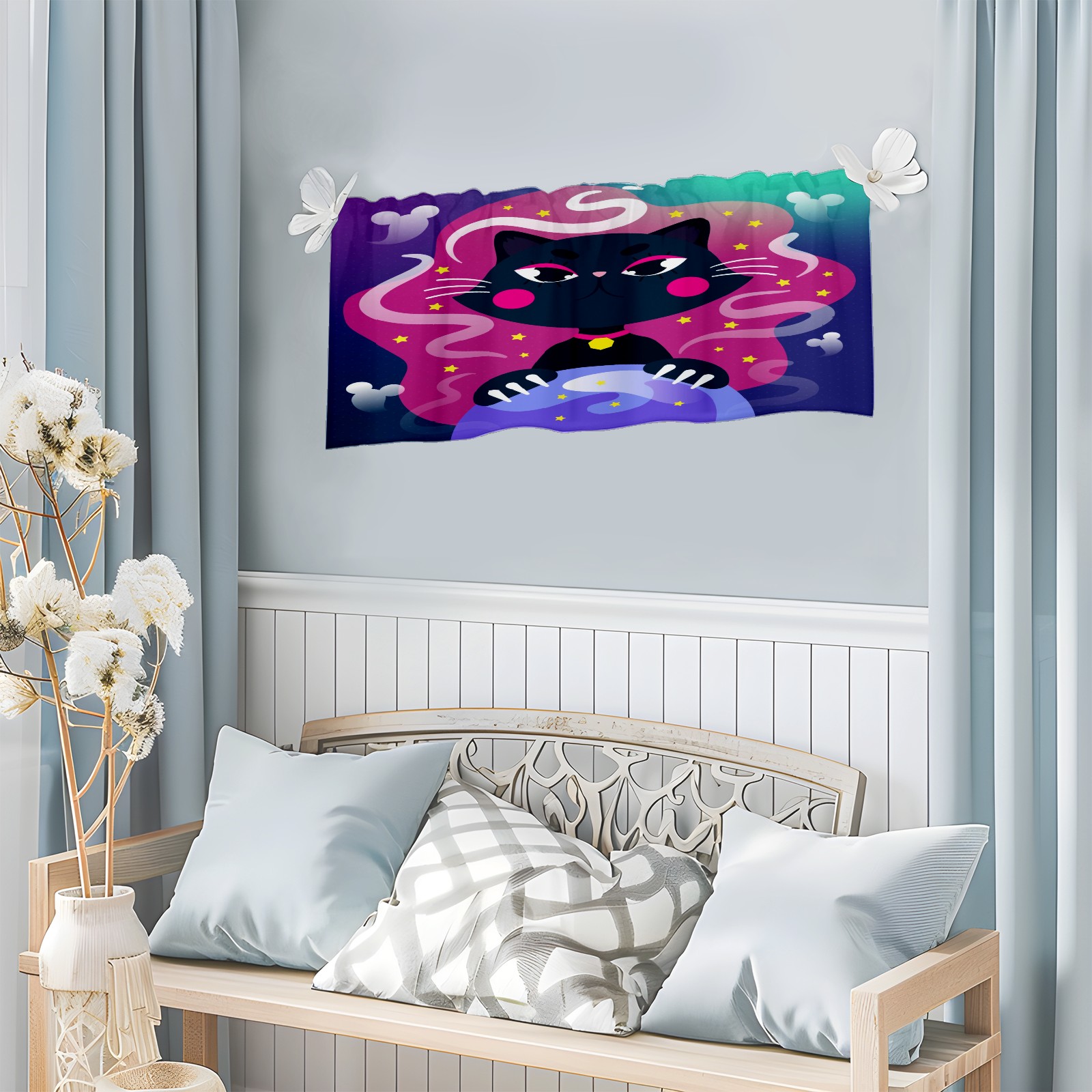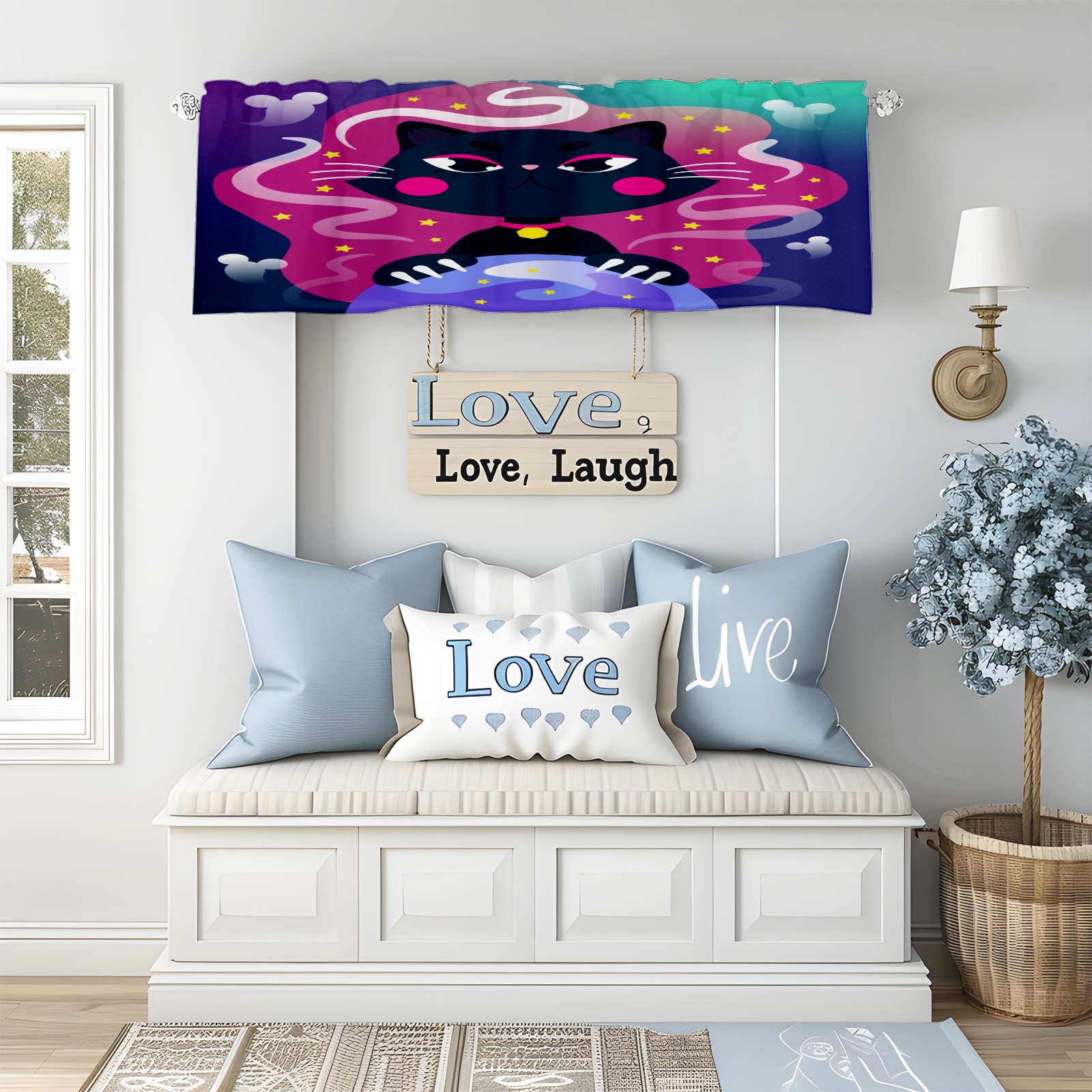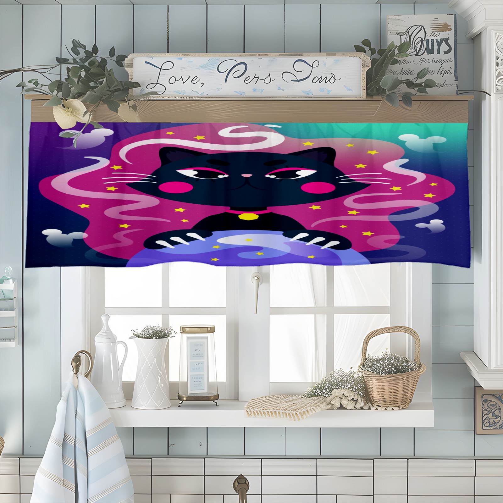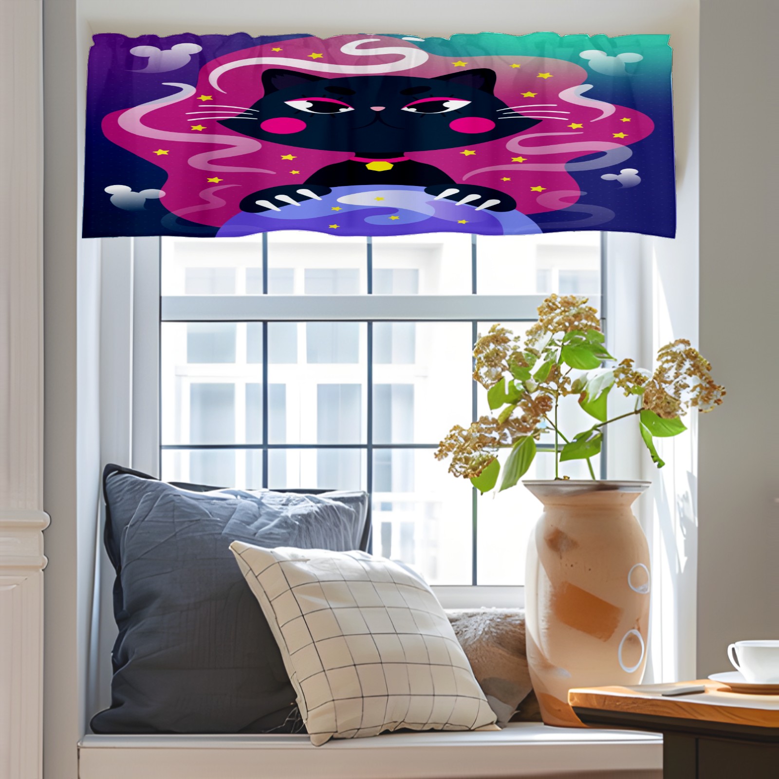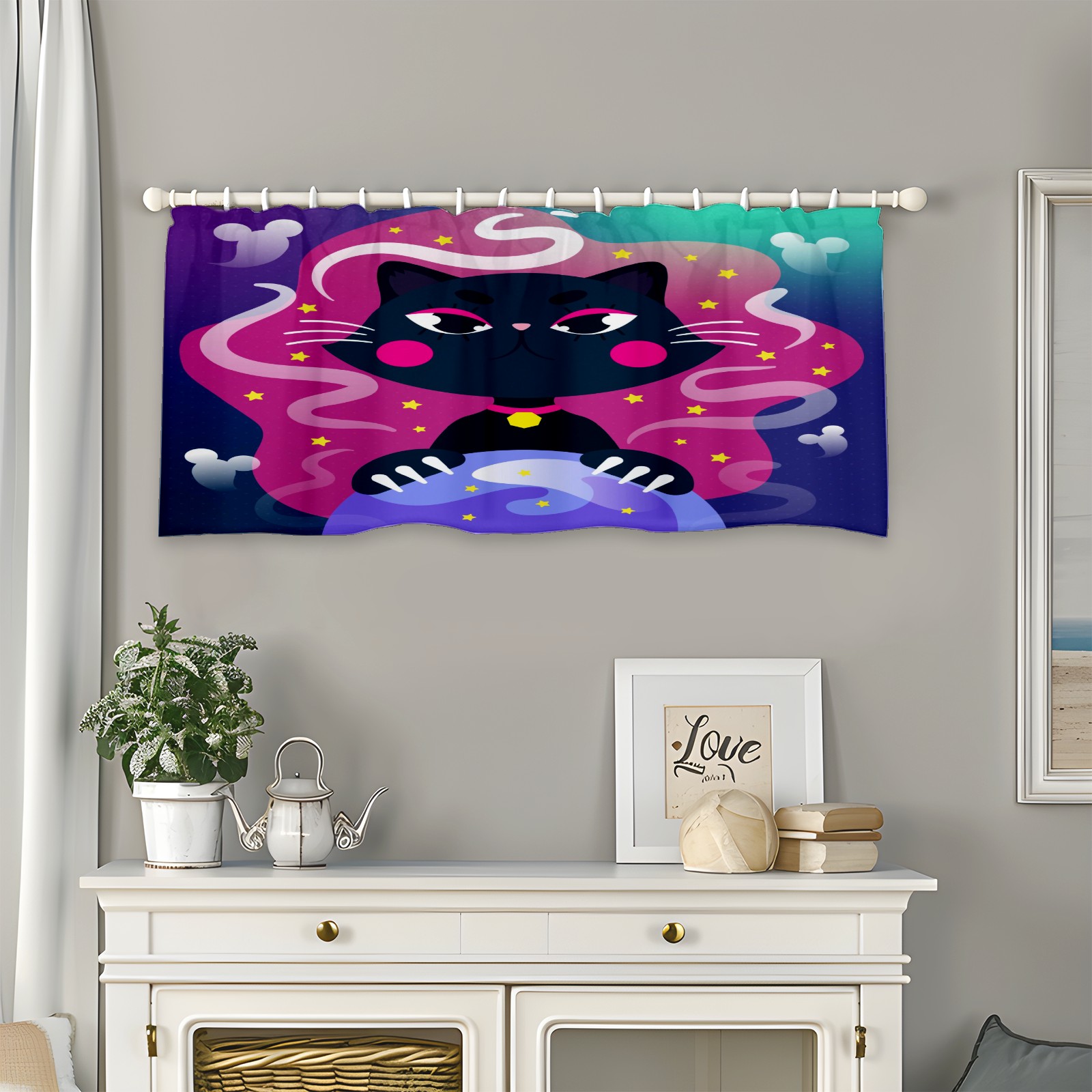 Blackout Curtain Valance for Living Room/Bathroom/Kitchen Valance Rod Pocket Curtain 14 x 52 Inches Halloween Black Cat-cartoon Crystal Globe