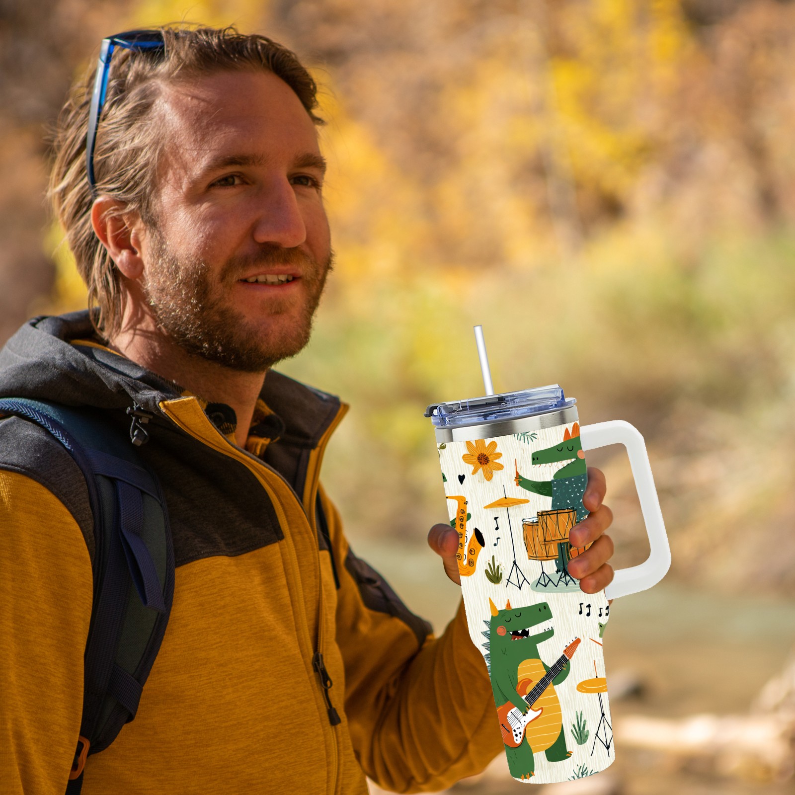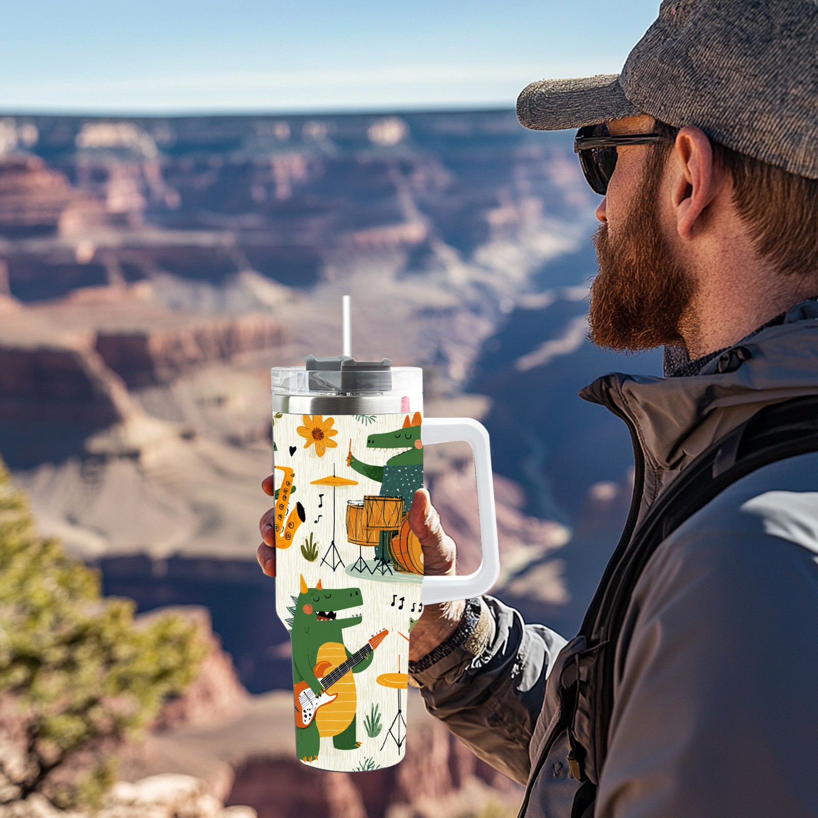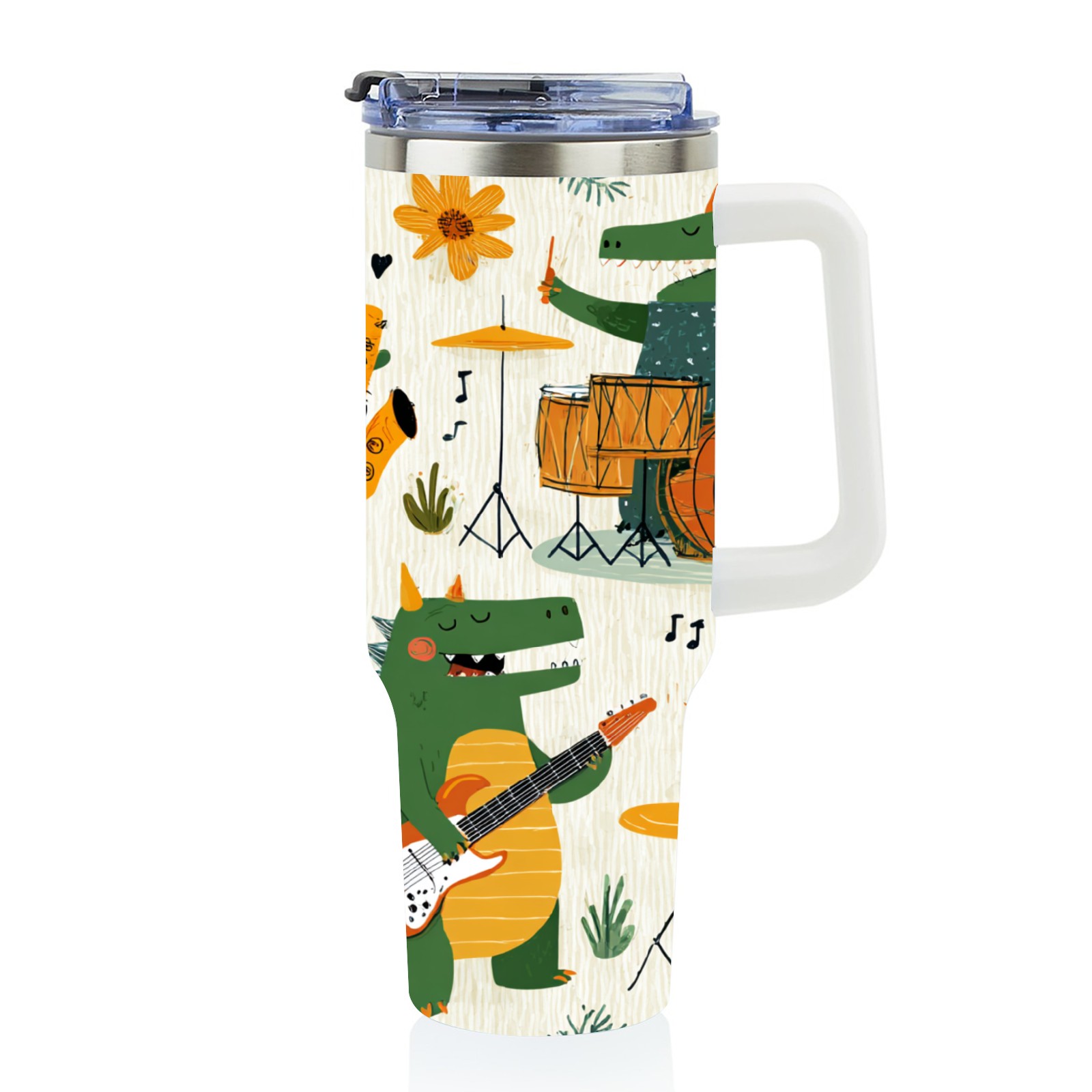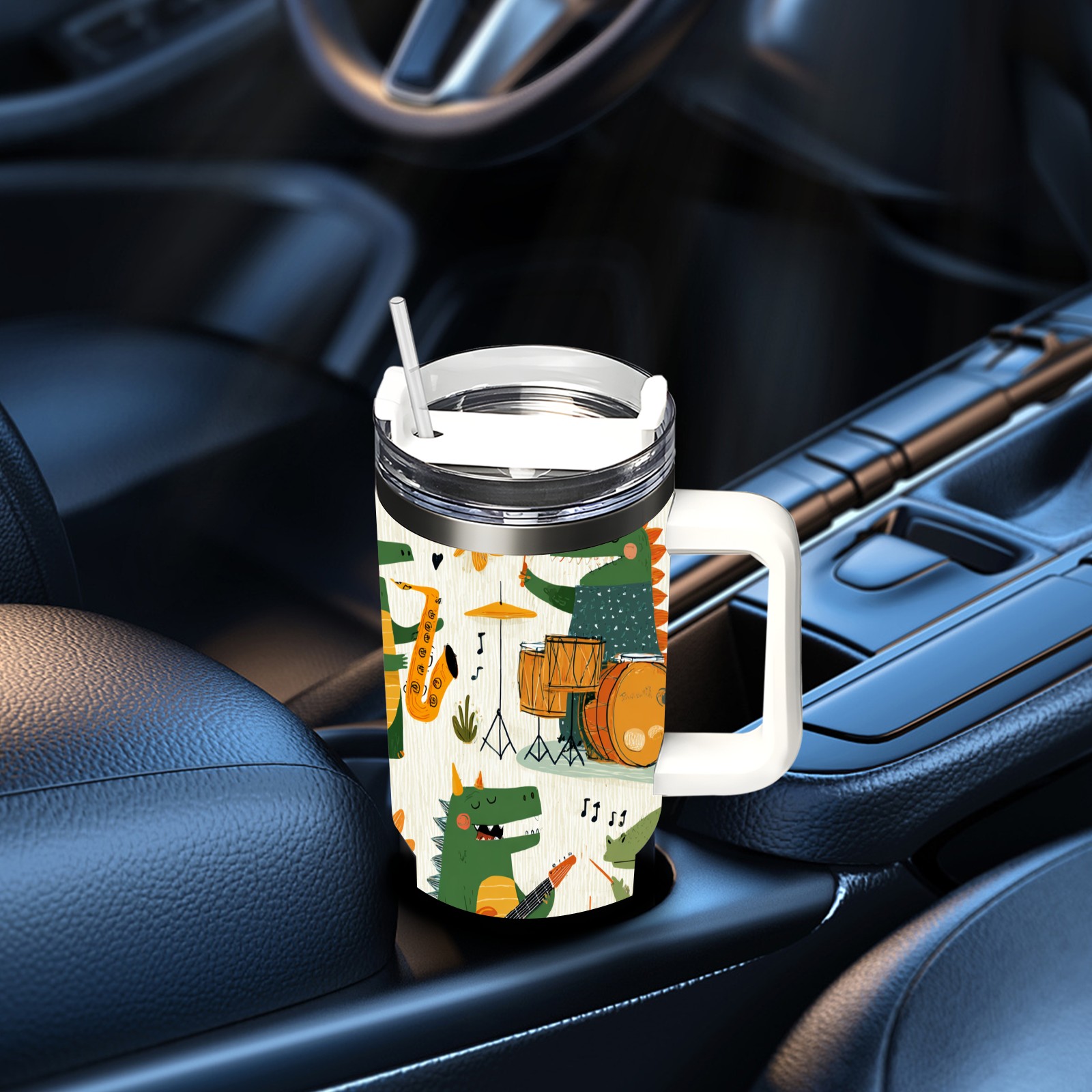 40 унций полностью напечатанный автомобильный стакан Cheerful Dinosaur Green