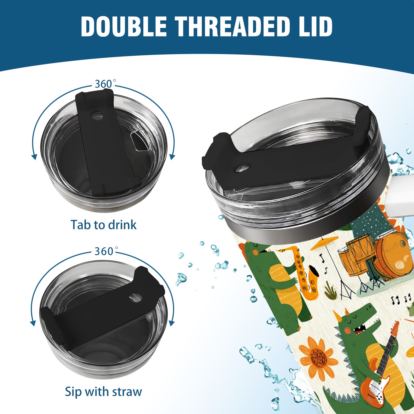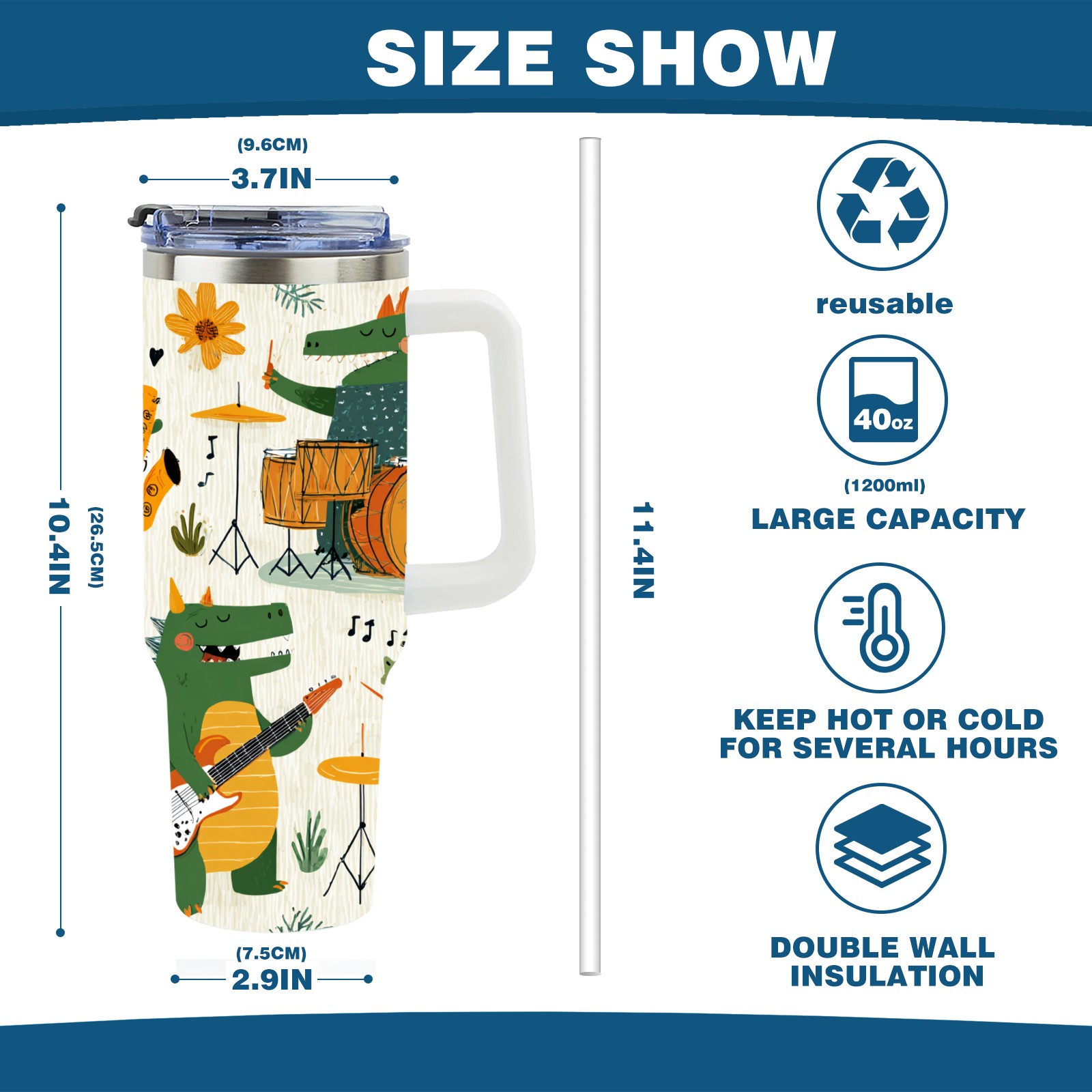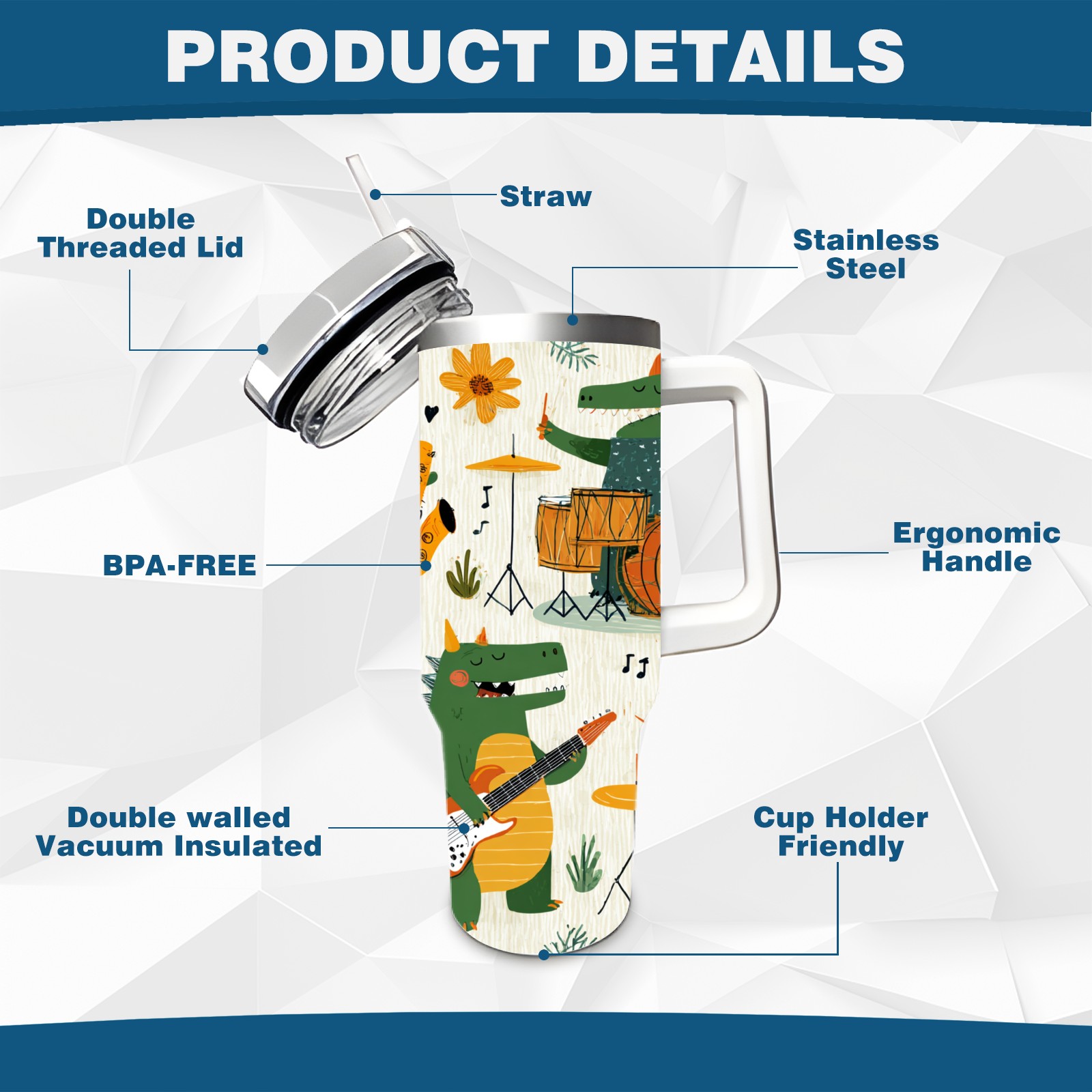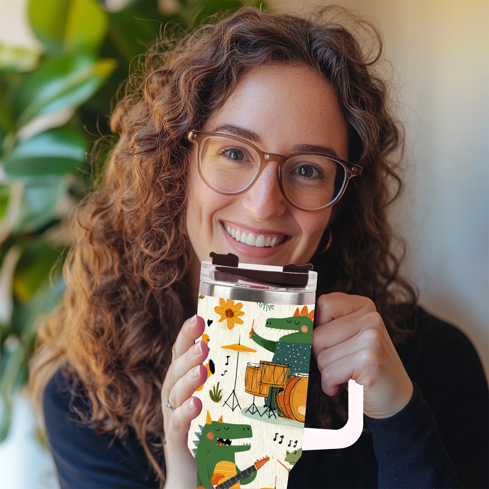 40 унций полностью напечатанный автомобильный стакан Cheerful Dinosaur Green