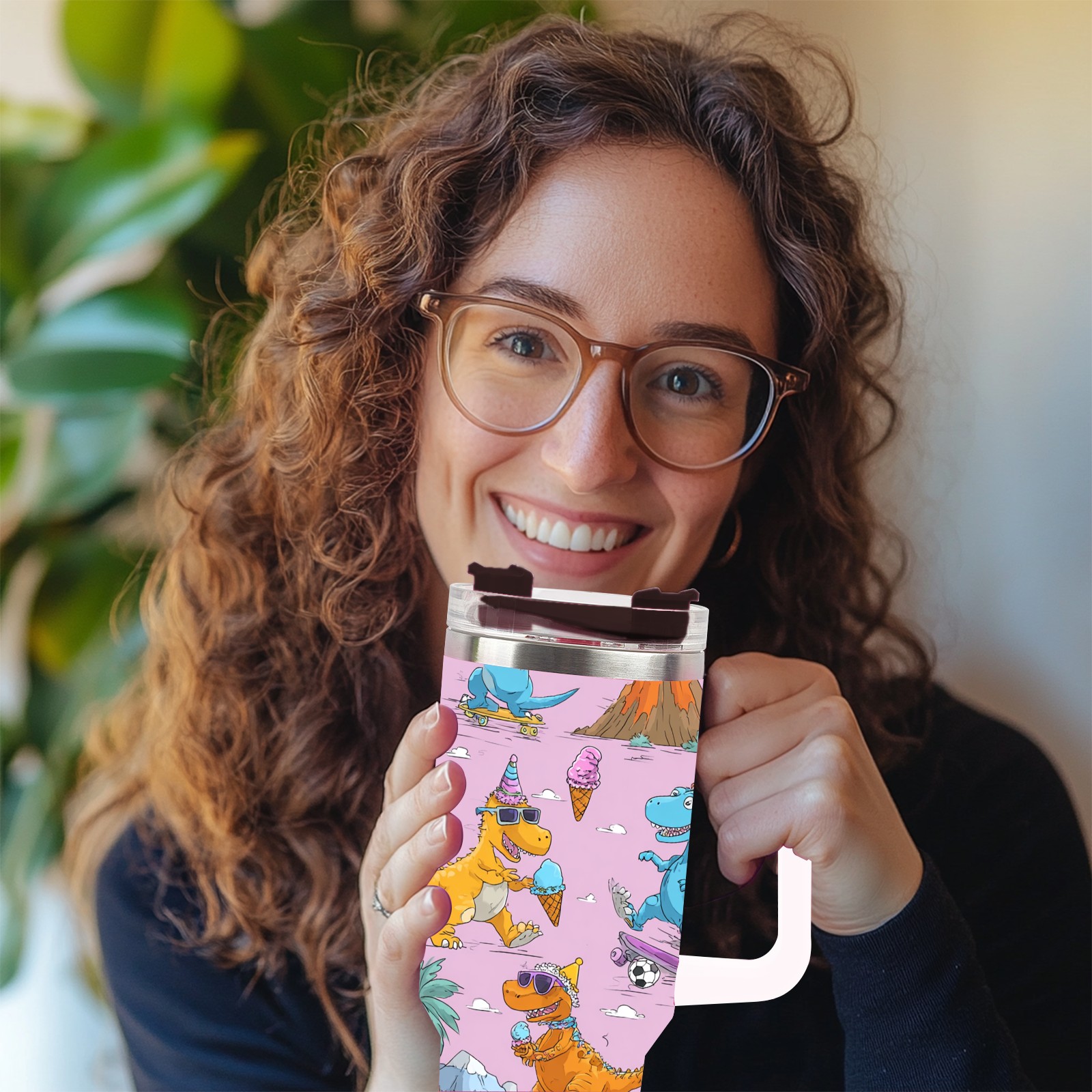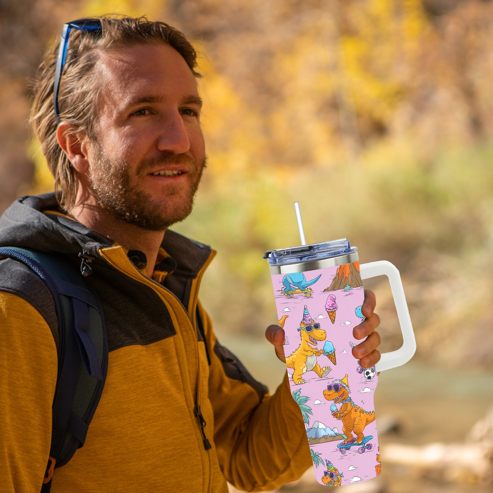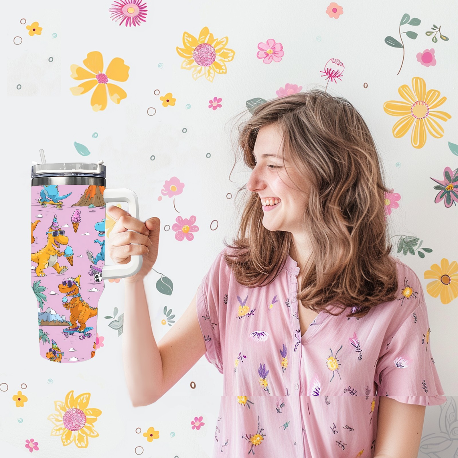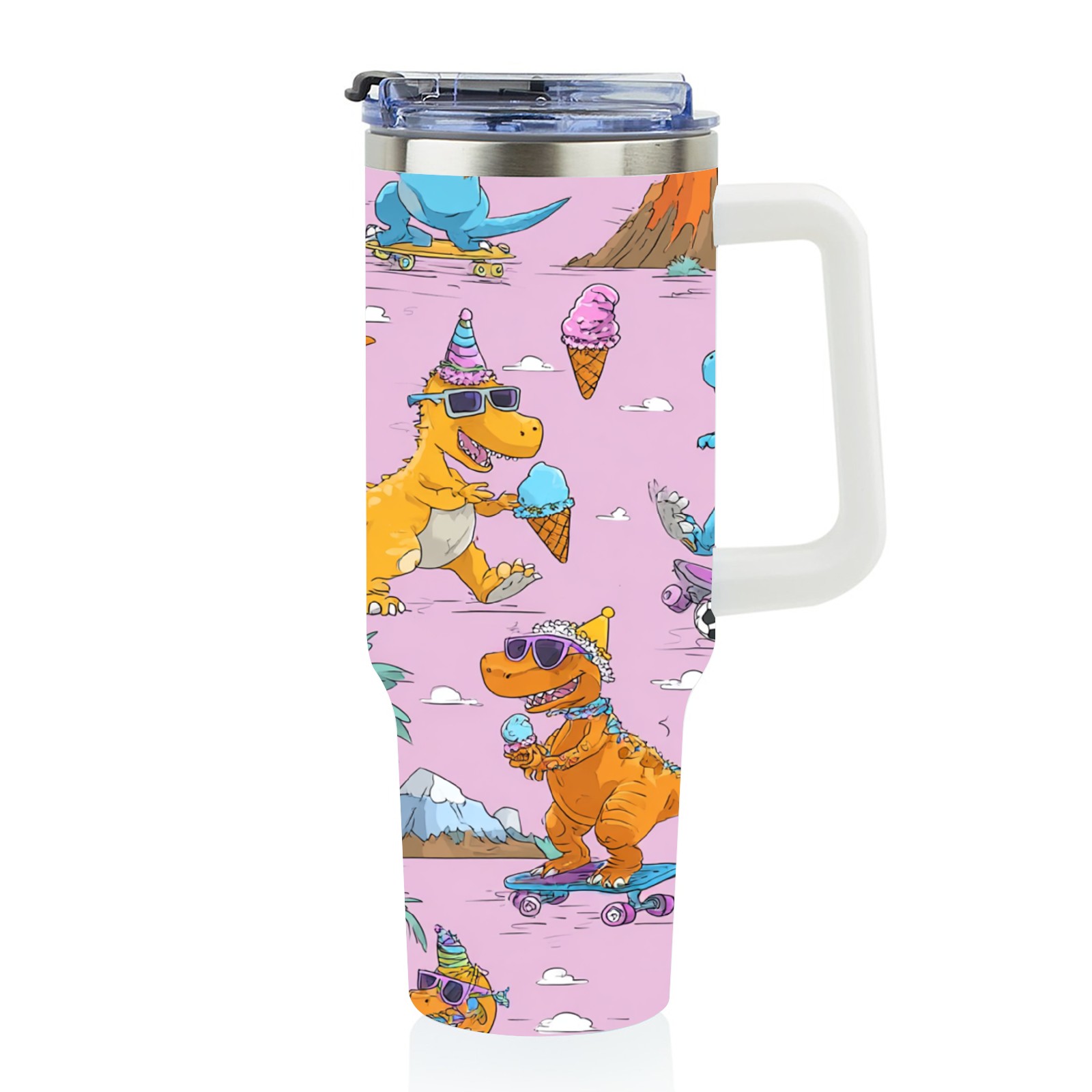 40 унций полностью напечатанный автомобильный стакан Playful Dinosaur Pink