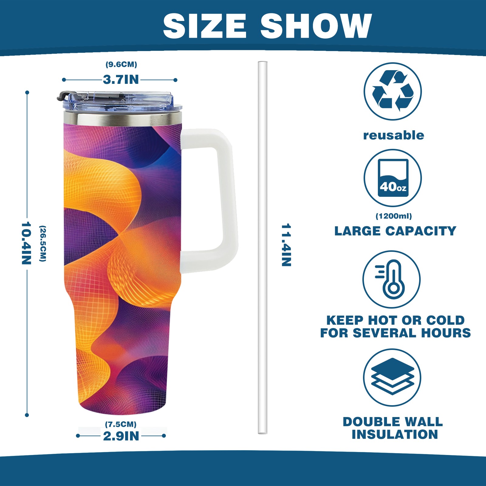 • С большой емкостью 40 унций, он обеспечивает вас гидратацией в течение всего дня, идеально подходит для воды, кофе, сока или других напитков. Эргономичный дизайн идеально вписывается в автомобильные держатели для бутылок, а прочный, герметичный колпачок предотвращает утечки во время передвижения. Путешествие. Антискользящее основание обеспечивает устойчивость, а гладкие поверхности делают уборку легкой — просто мойте вручную или кладите в посудомоечную машину (рекомендуется верхний поддон).