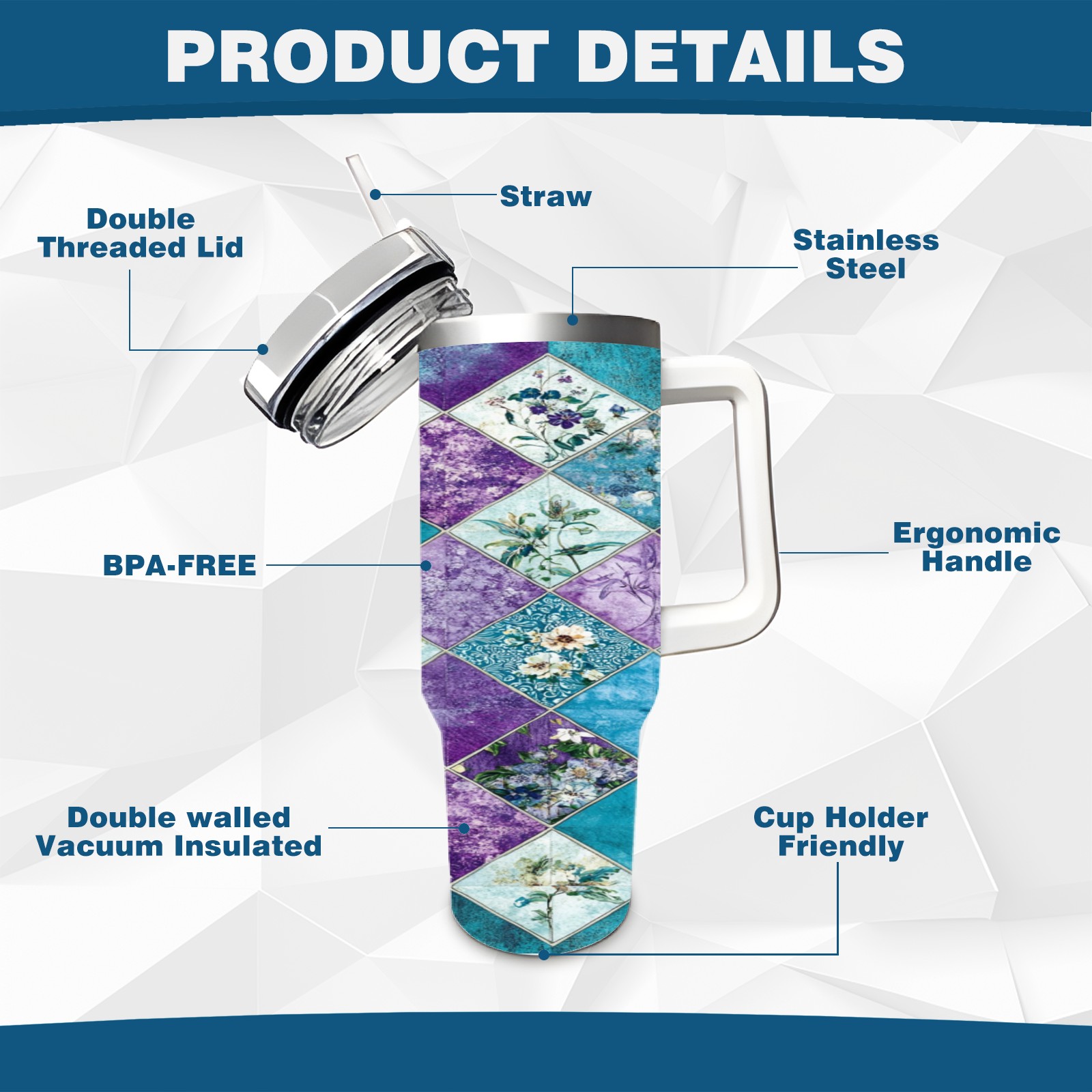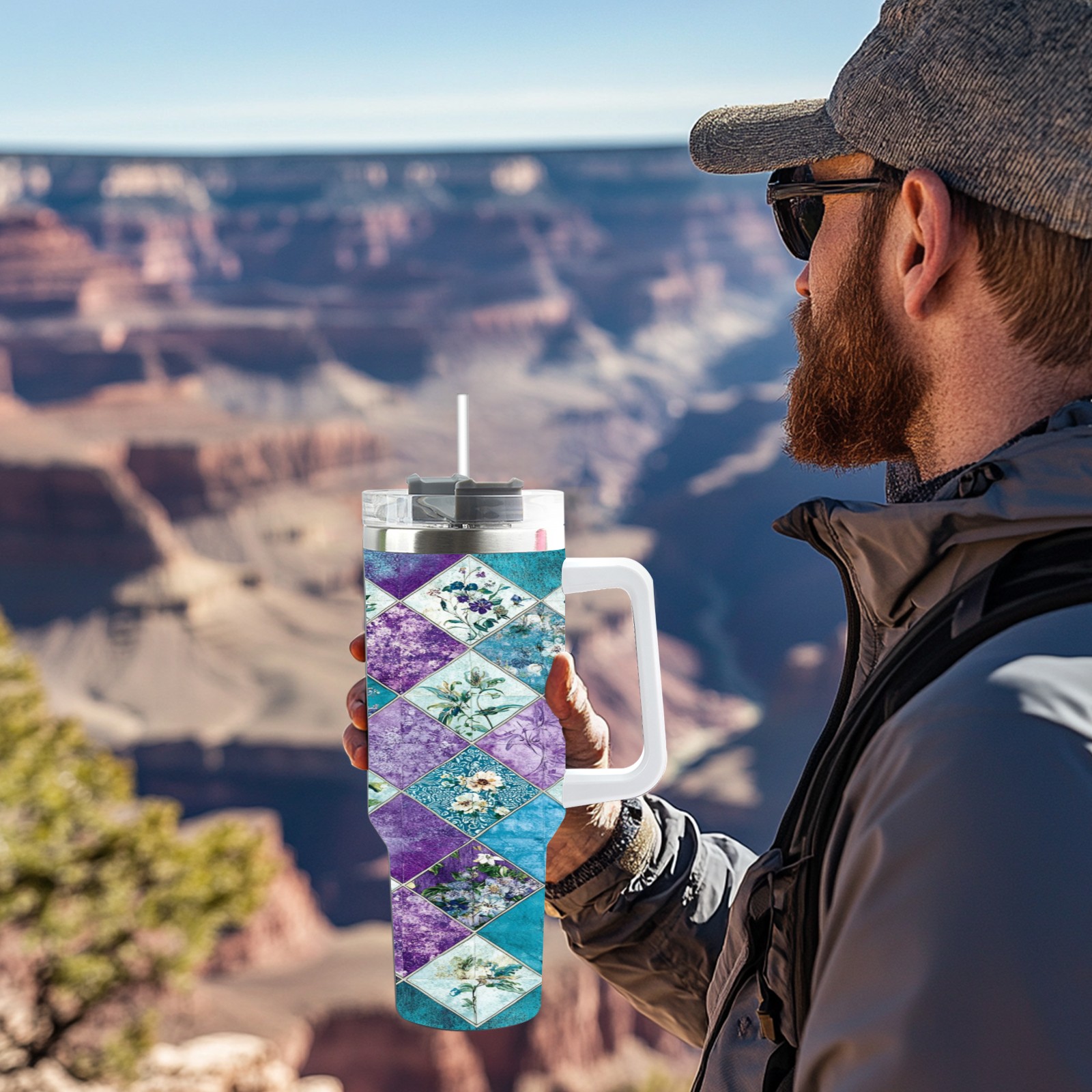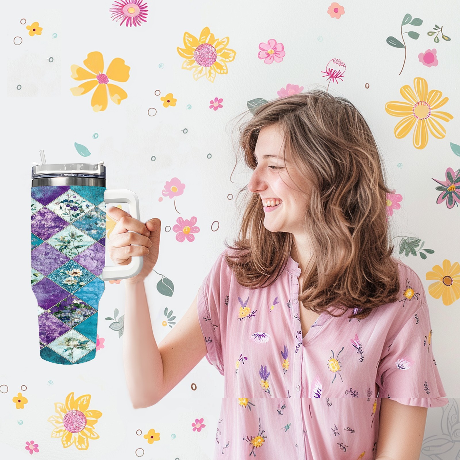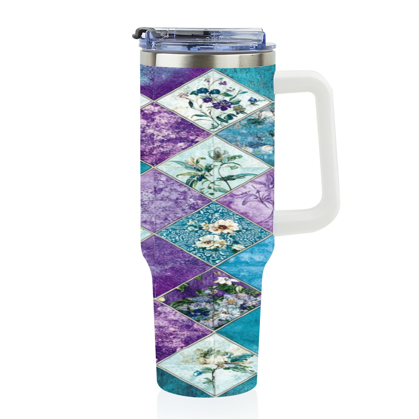 40 унций полностью напечатанный автомобильный стакан Checkered Floral Pattern