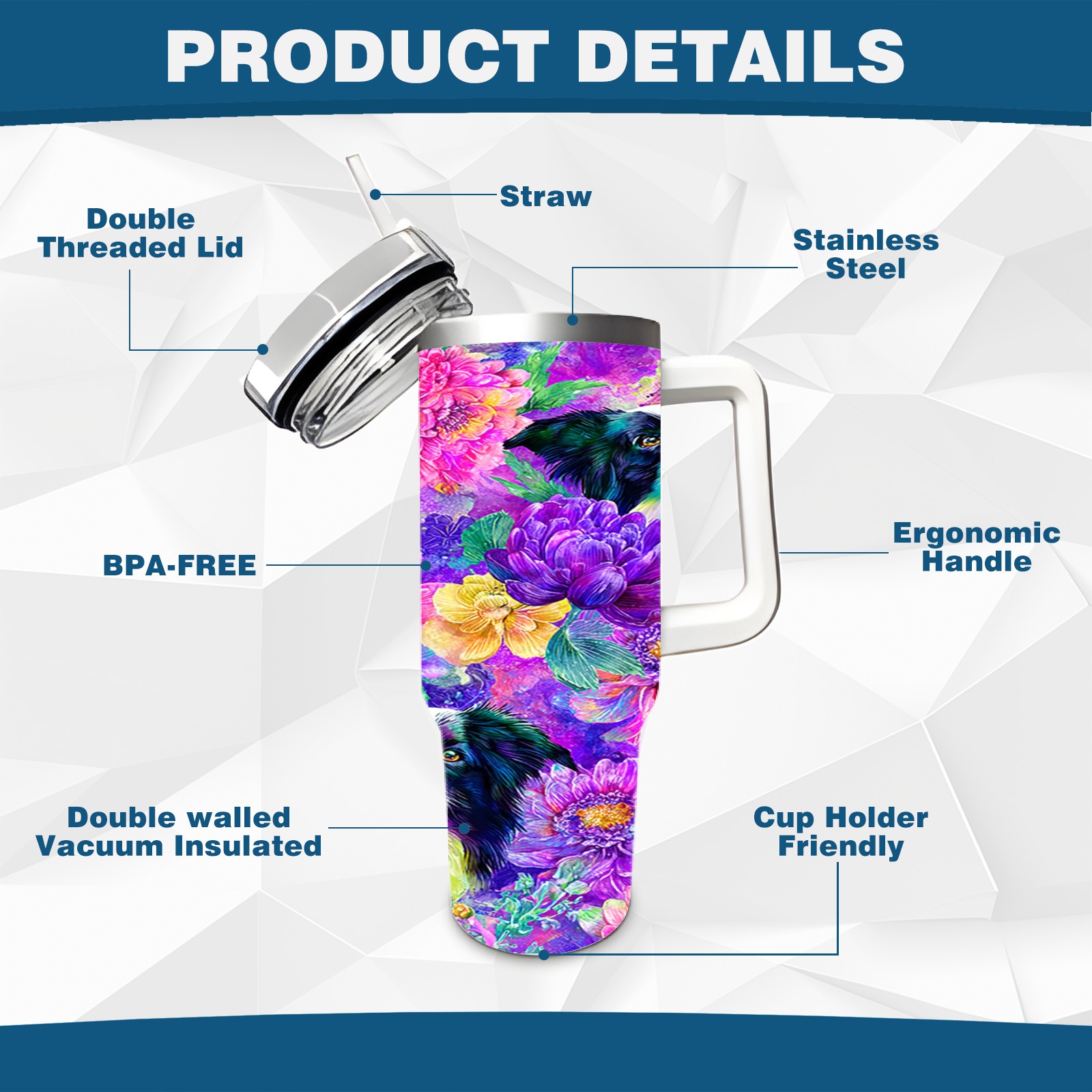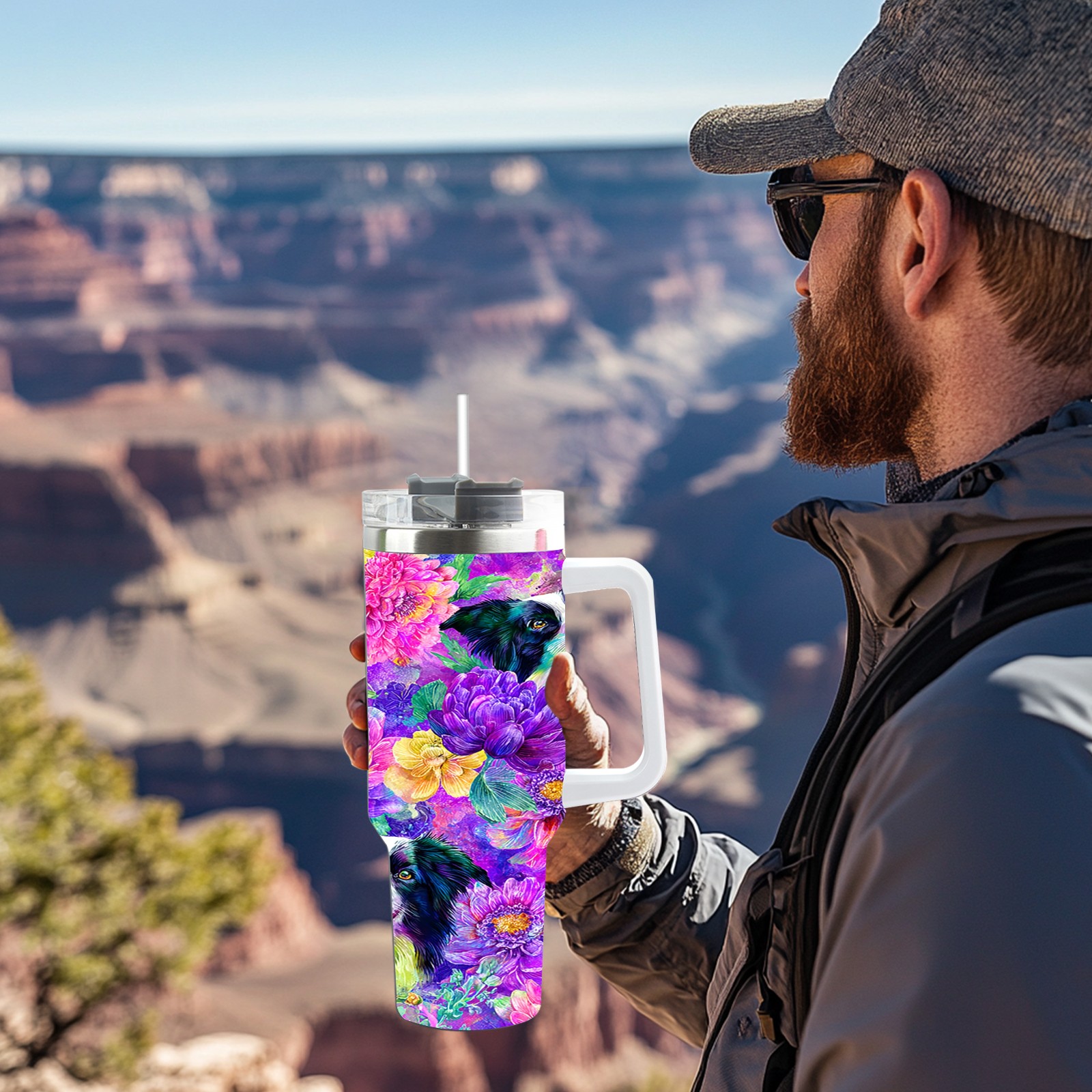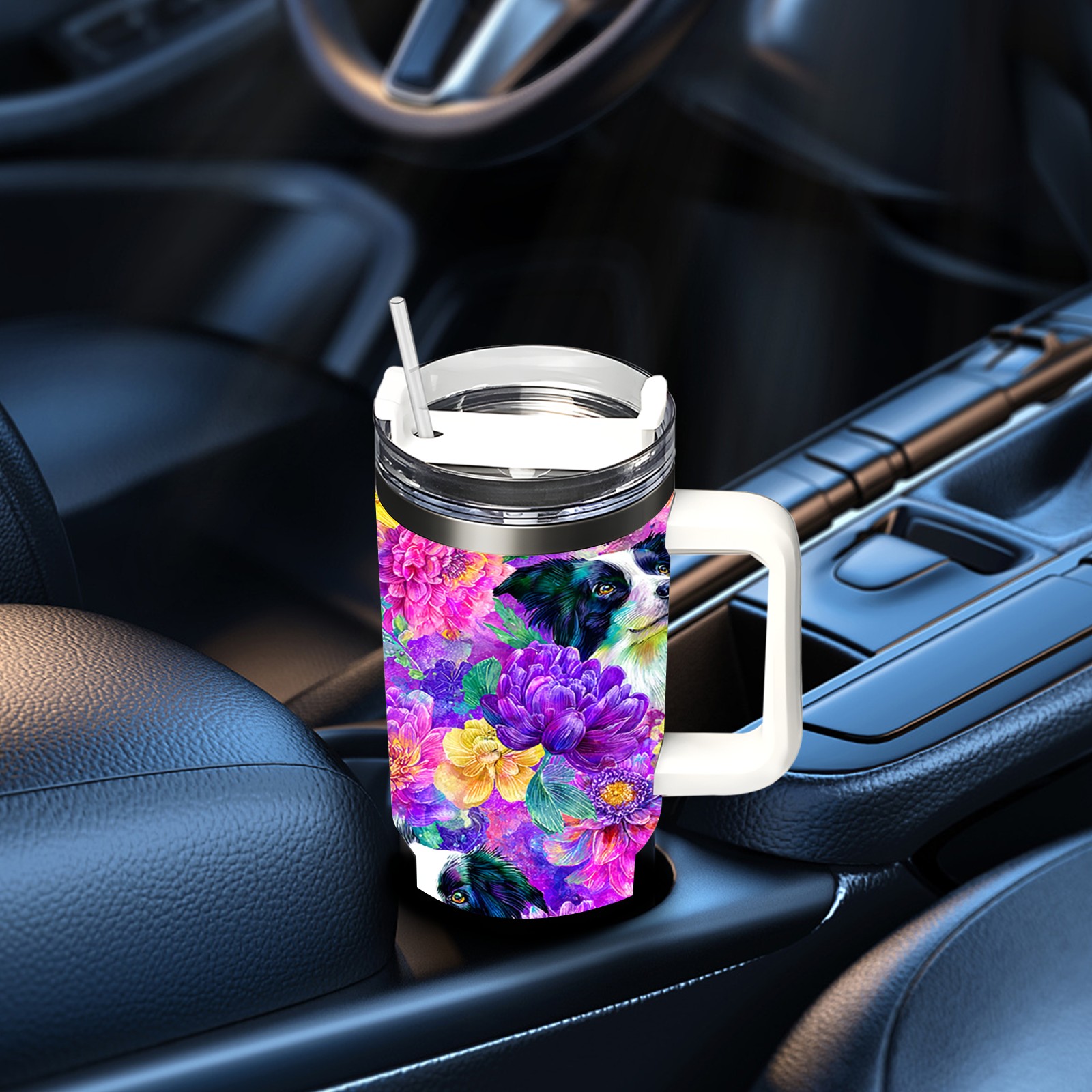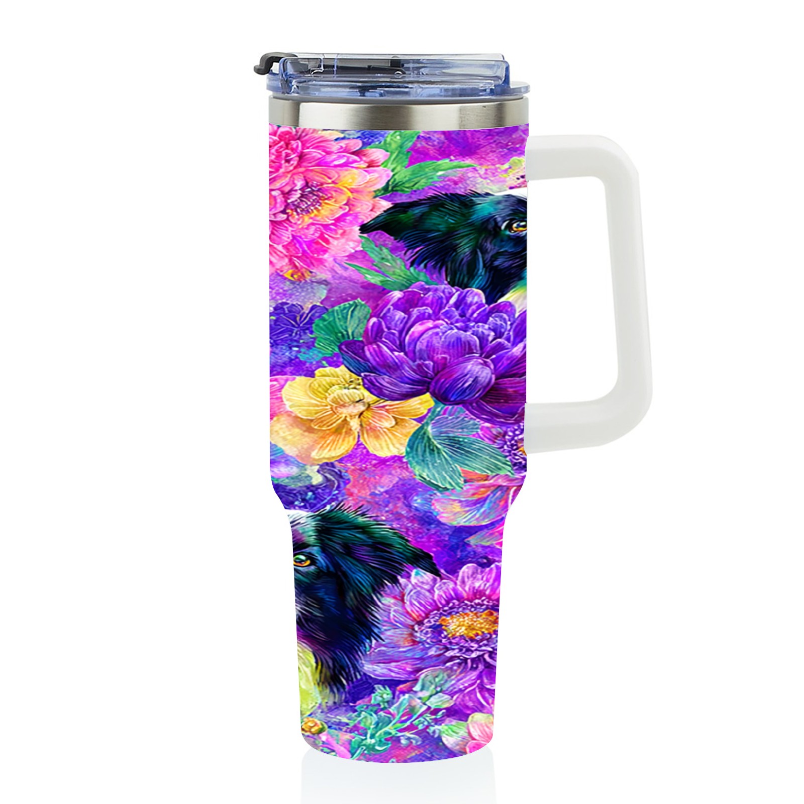 40 унций полностью напечатанный автомобильный стакан Dog Flower Multicolor
