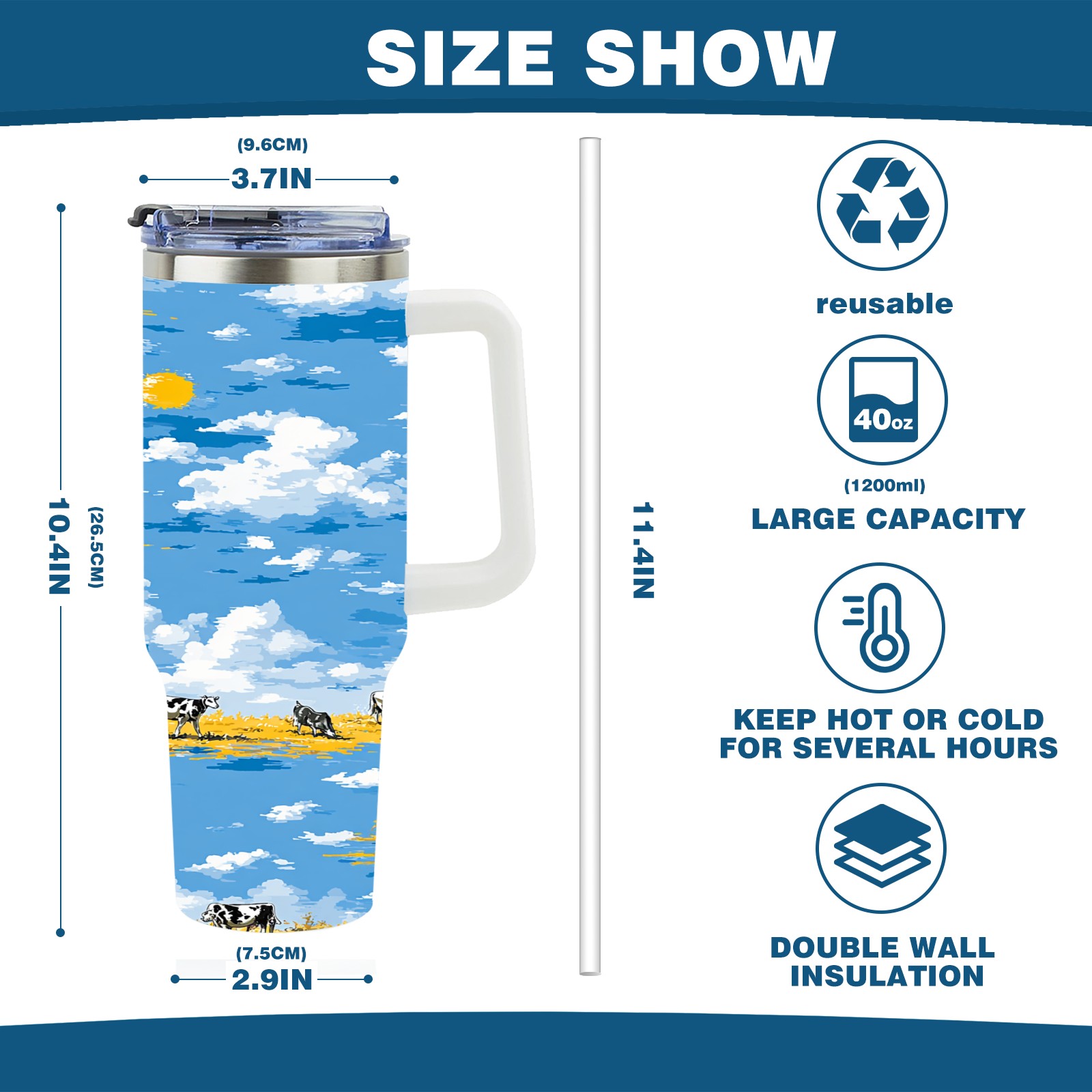 • С большой емкостью 40 унций, он обеспечивает вас гидратацией в течение всего дня, идеально подходит для воды, кофе, сока или других напитков. Эргономичный дизайн идеально вписывается в автомобильные держатели для бутылок, а прочный, герметичный колпачок предотвращает утечки во время передвижения. Путешествие. Антискользящее основание обеспечивает устойчивость, а гладкие поверхности делают уборку легкой — просто мойте вручную или кладите в посудомоечную машину (рекомендуется верхний поддон).
