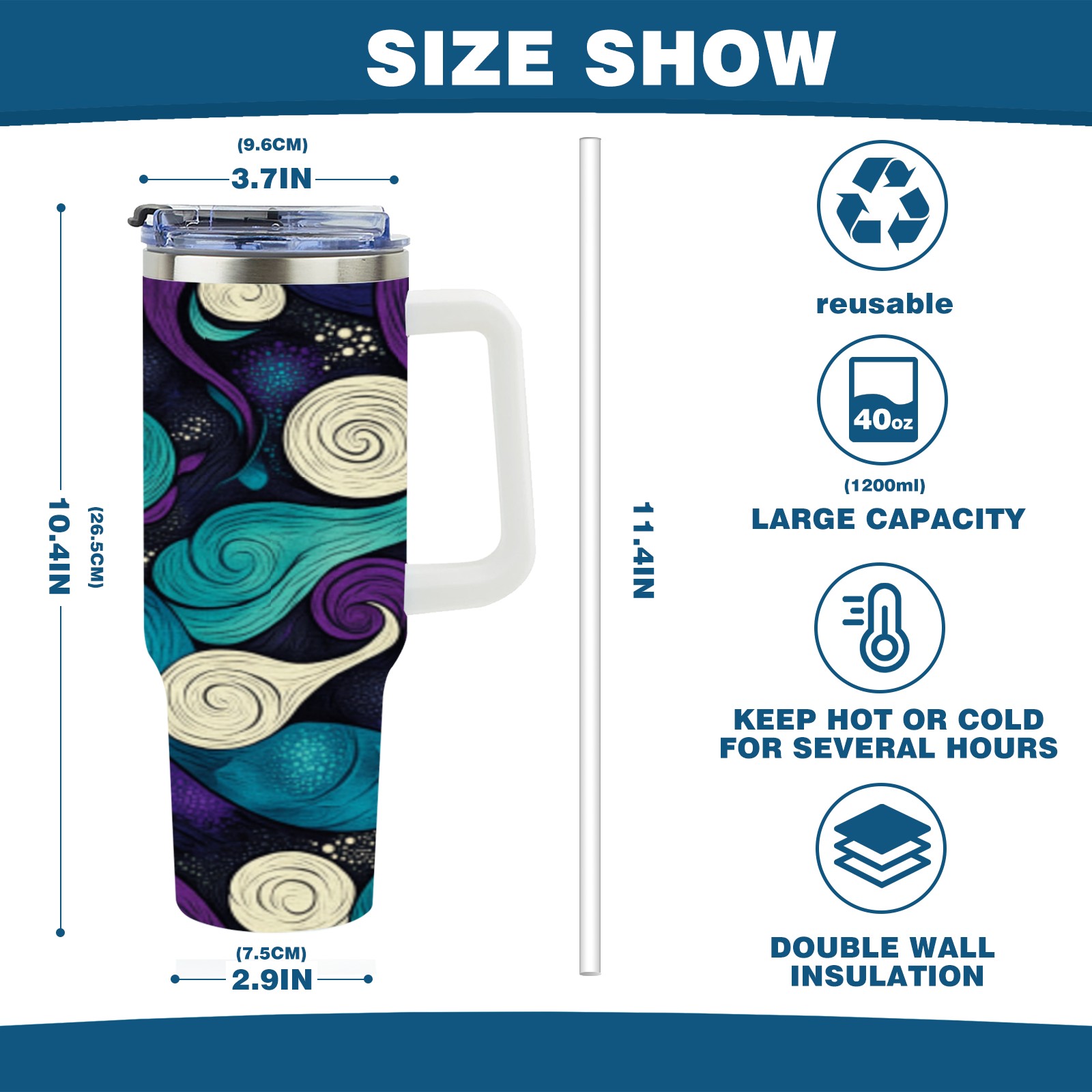 • С большой емкостью 40 унций, он обеспечивает вас гидратацией в течение всего дня, идеально подходит для воды, кофе, сока или других напитков. Эргономичный дизайн идеально вписывается в автомобильные держатели для бутылок, а прочный, герметичный колпачок предотвращает утечки во время передвижения. Путешествие. Антискользящее основание обеспечивает устойчивость, а гладкие поверхности делают уборку легкой — просто мойте вручную или кладите в посудомоечную машину (рекомендуется верхний поддон).