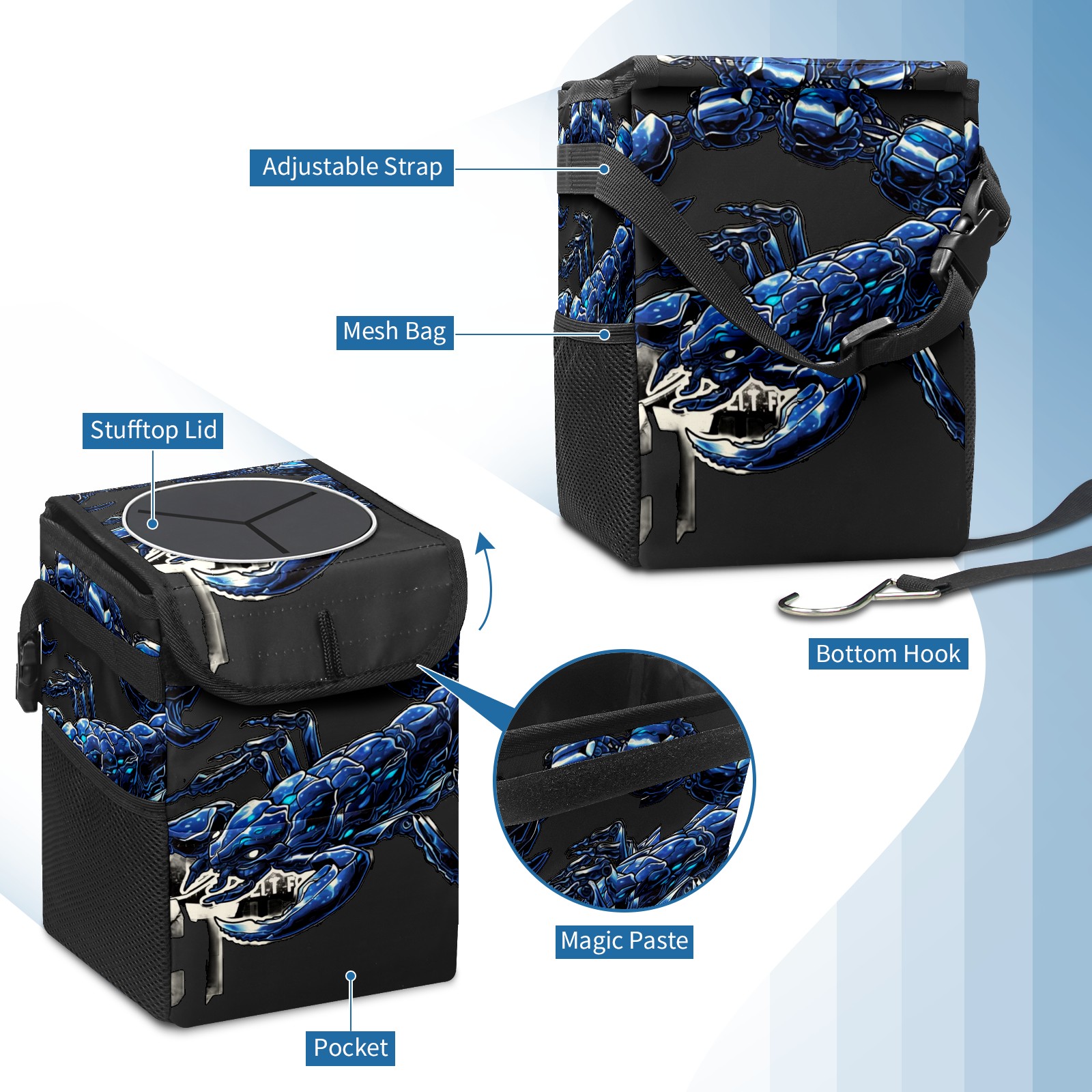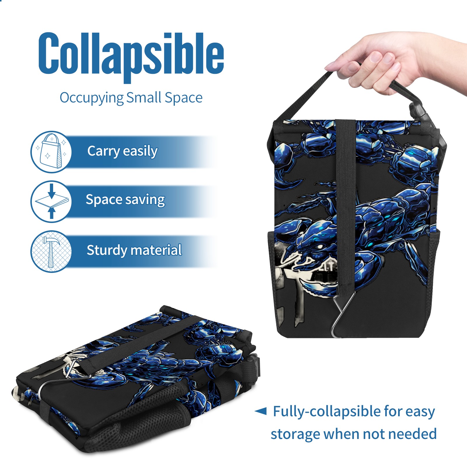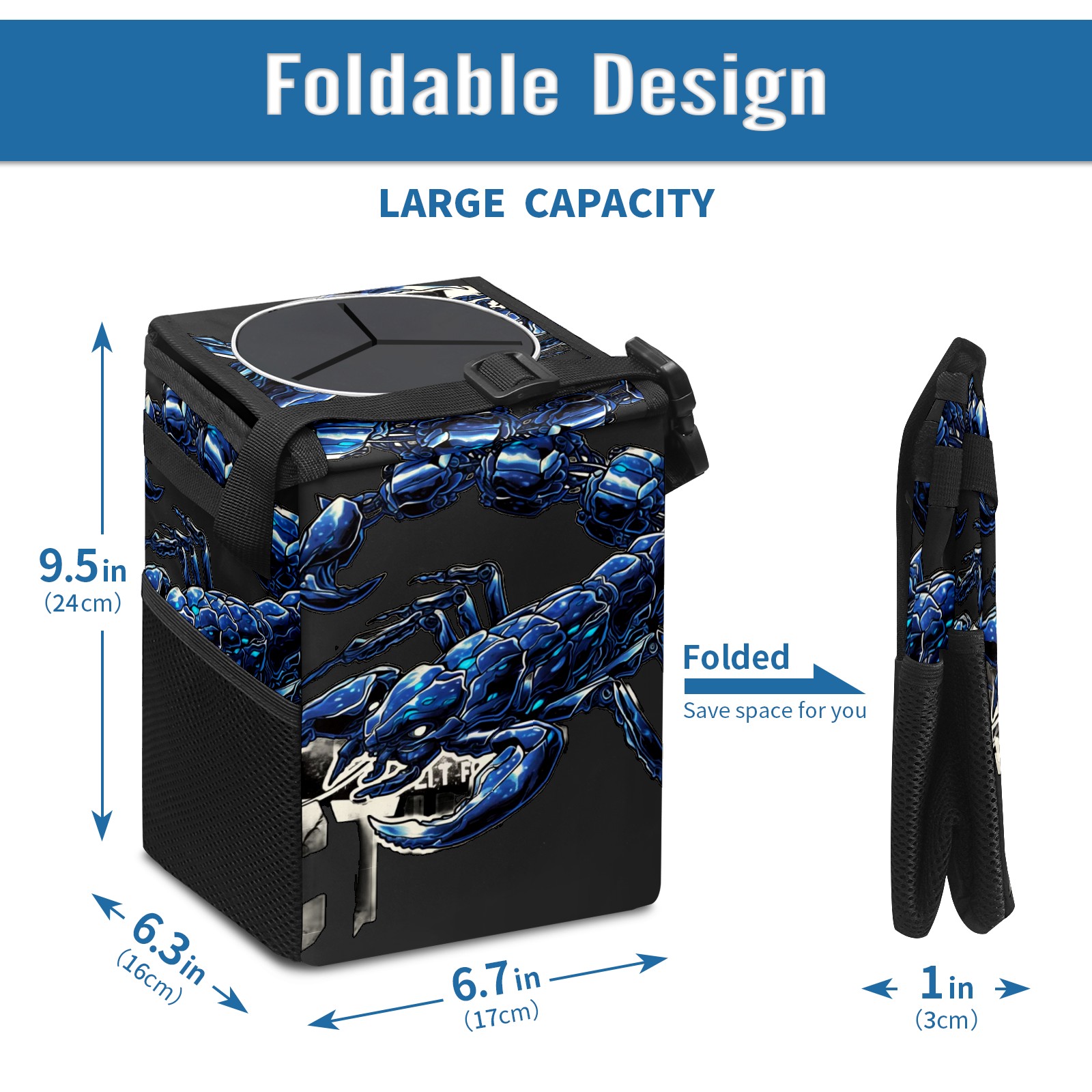 • Эта многофункциональная автомобильная мусорная корзина отличается стильным принтом, сочетающим в себе практичность и эстетику. Изготовленная из высококачественной саржевой ткани с плетеными ремнями, она прочная, долговечная и износостойкая. Размеры корзины составляют 24×17×16 см (9,5×6,7×6,3 дюйма). Верхнее отверстие имеет прорезиненное покрытие для удобной утилизации мусора; боковые сетчатые карманы и передний карман обеспечивают удобное хранение закусок, телефонов и других мелких предметов.