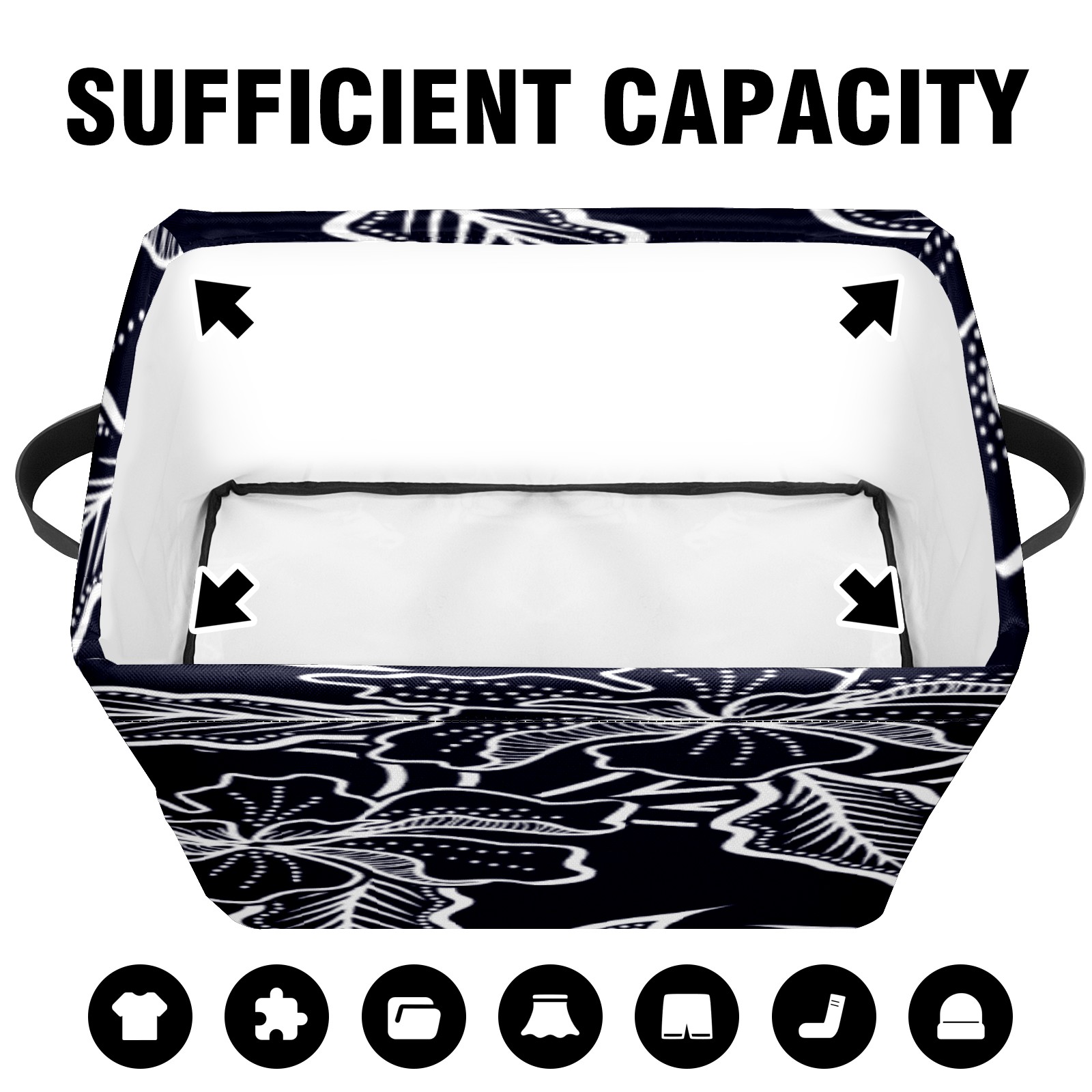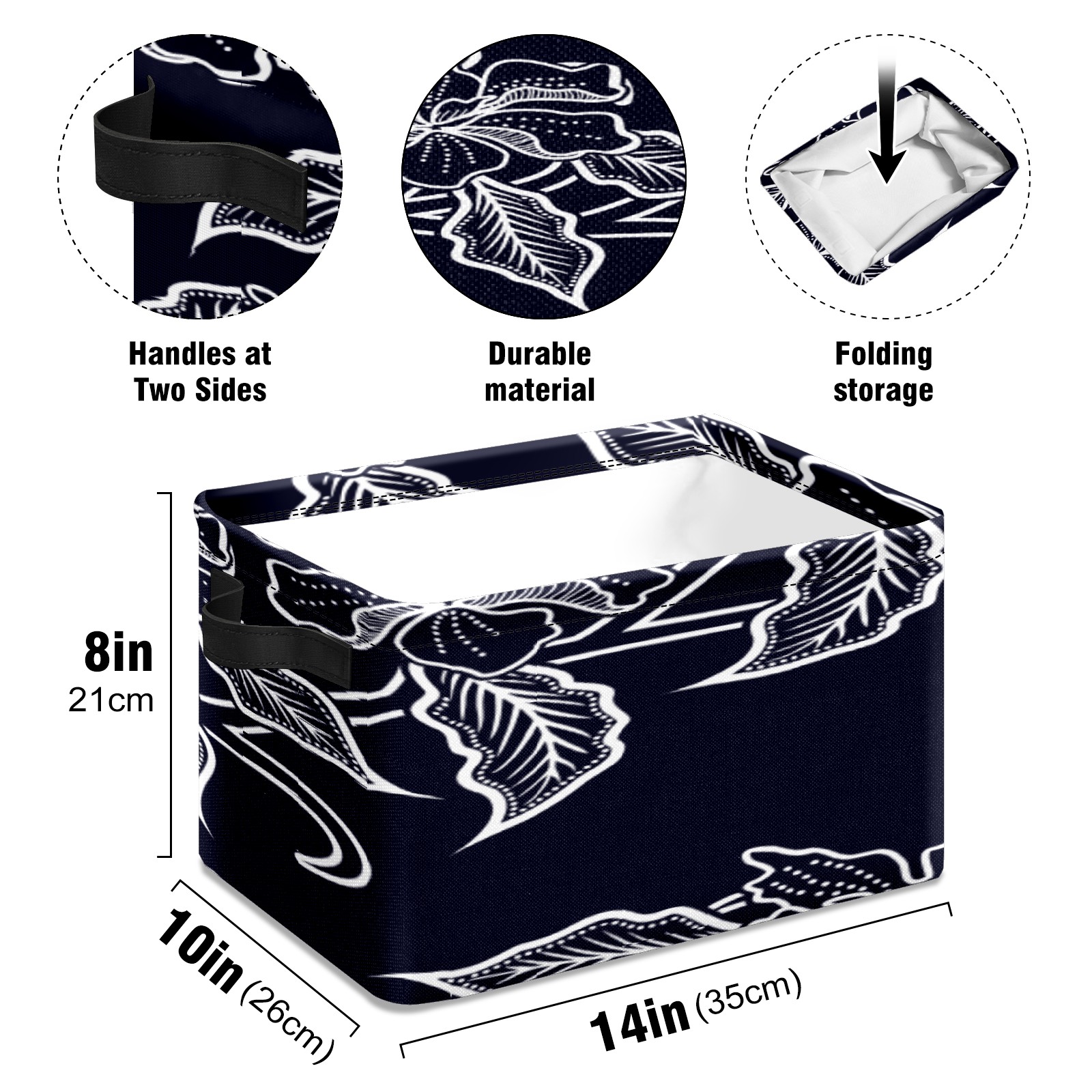 【Материал】Оксфордская ткань из полиэстера 600D; ручки изготовлены из полиэстера. 【Описание материала】Внешняя ткань: Оксфордская ткань полотняного переплетения высокой плотности 300D (ПВХ); Подкладка: белая ткань 750D; Ручки: черная композитная ткань 290T. 【Размер】26x35x21 см (10x14x8 дюймов) 【Описание продукта】Эта корзина для хранения с ручками с обеих сторон предлагает достаточно места для хранения предметов разных размеров, что делает ее подходящей для различных случаев, таких как дом, офис и школа. Ручки с обеих сторон закреплены гвоздями для долговечности. Прочный металлический каркас окружает корзину, поддерживая ее форму. Складная корзина для хранения: Наши корзины для хранения легко складываются, когда не используются. Эти ящики для хранения изготовлены из легко моющейся оксфордской ткани и при необходимости могут быть аккуратно протерты мягким мылом и водой. Из-за внутреннего металлического каркаса и жесткого дна машинная стирка не рекомендуется. 【Подходящие сценарии использования】Дом, офис и школа 【Инструкции по стирке】Рекомендуется ручная стирка; избегайте длительного воздействия прямых солнечных лучей.