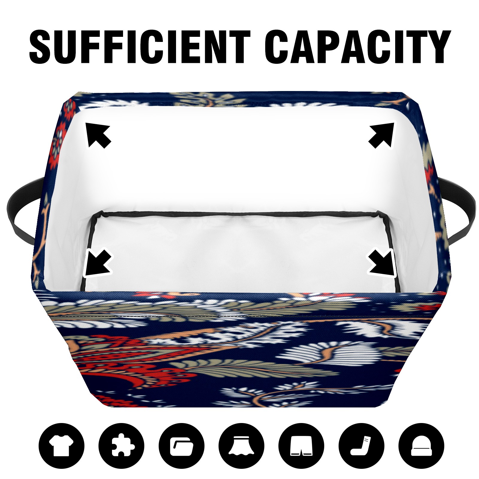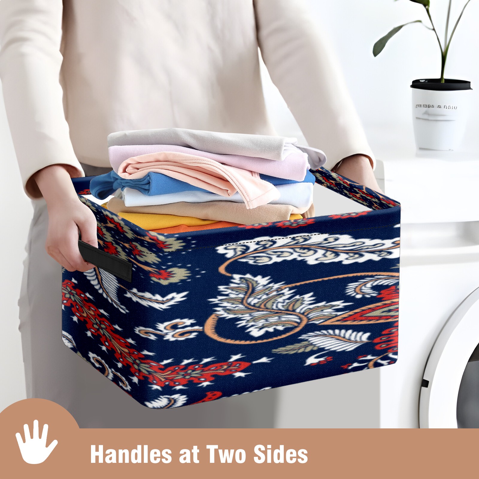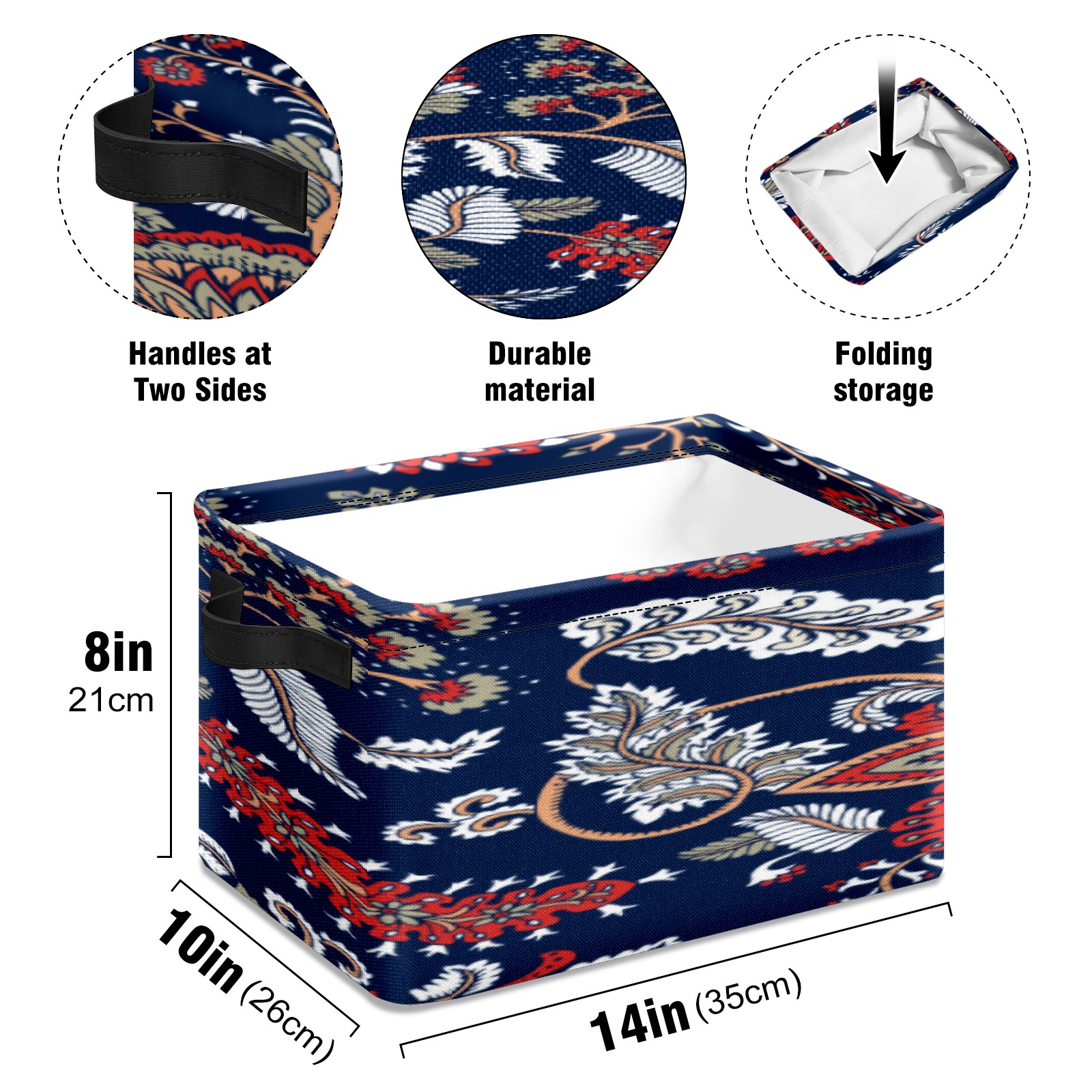 【Материал】Оксфордская ткань из полиэстера 600D; ручки изготовлены из полиэстера. 【Описание материала】Внешняя ткань: Оксфордская ткань полотняного переплетения высокой плотности 300D (ПВХ); Подкладка: белая ткань 750D; Ручки: черная композитная ткань 290T. 【Размер】26x35x21 см (10x14x8 дюймов) 【Описание продукта】Эта корзина для хранения с ручками с обеих сторон предлагает достаточно места для хранения предметов разных размеров, что делает ее подходящей для различных случаев, таких как дом, офис и школа. Ручки с обеих сторон закреплены гвоздями для долговечности. Прочный металлический каркас окружает корзину, поддерживая ее форму. Складная корзина для хранения: Наши корзины для хранения легко складываются, когда не используются. Эти ящики для хранения изготовлены из легко моющейся оксфордской ткани и при необходимости могут быть аккуратно протерты мягким мылом и водой. Из-за внутреннего металлического каркаса и жесткого дна машинная стирка не рекомендуется. 【Подходящие сценарии использования】Дом, офис и школа 【Инструкции по стирке】Рекомендуется ручная стирка; избегайте длительного воздействия прямых солнечных лучей.