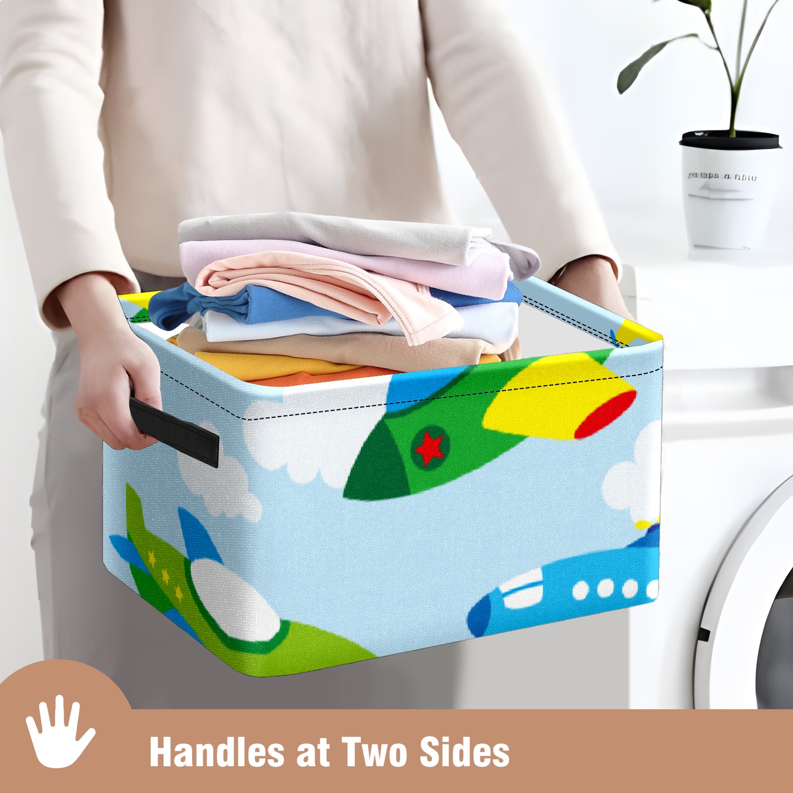 Collapsible 600D Oxford Storage Basket with Cute Airplane Blue - Metal Frame 10"x14"x8" Reinforced Handles, Multi-Purpose Organizer