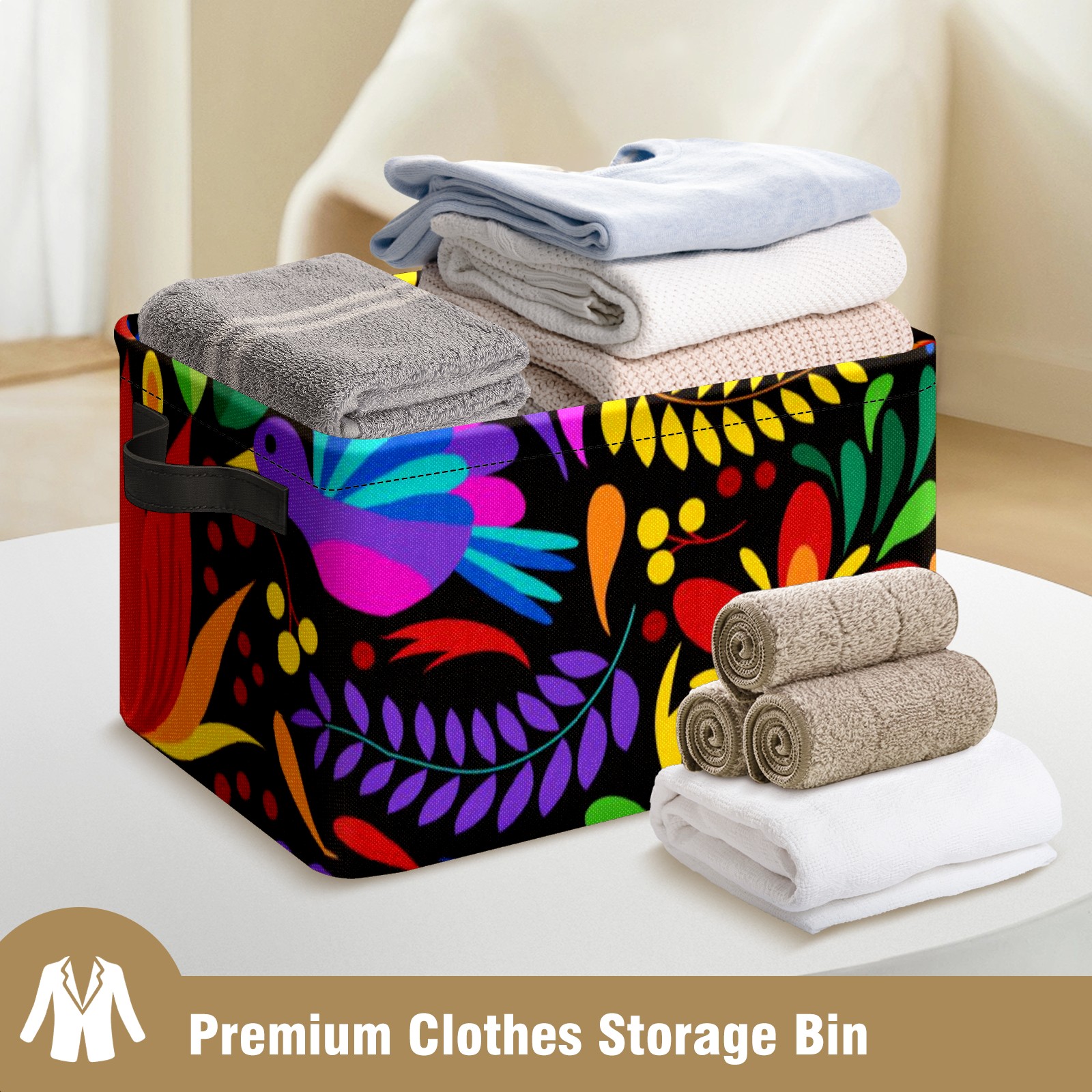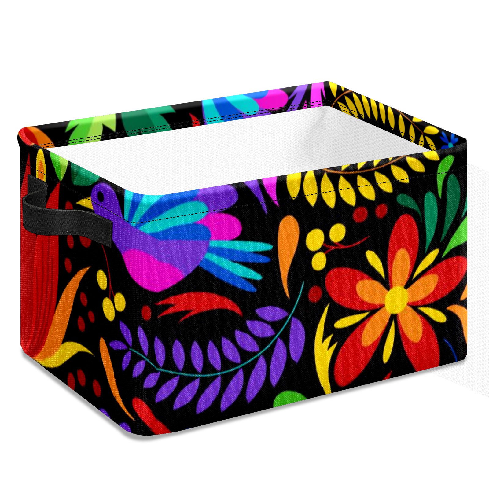 Collapsible 600D Oxford Storage Basket with Mexican Flower Boho - Metal Frame 10"x14"x8" Reinforced Handles, Multi-Purpose Organizer