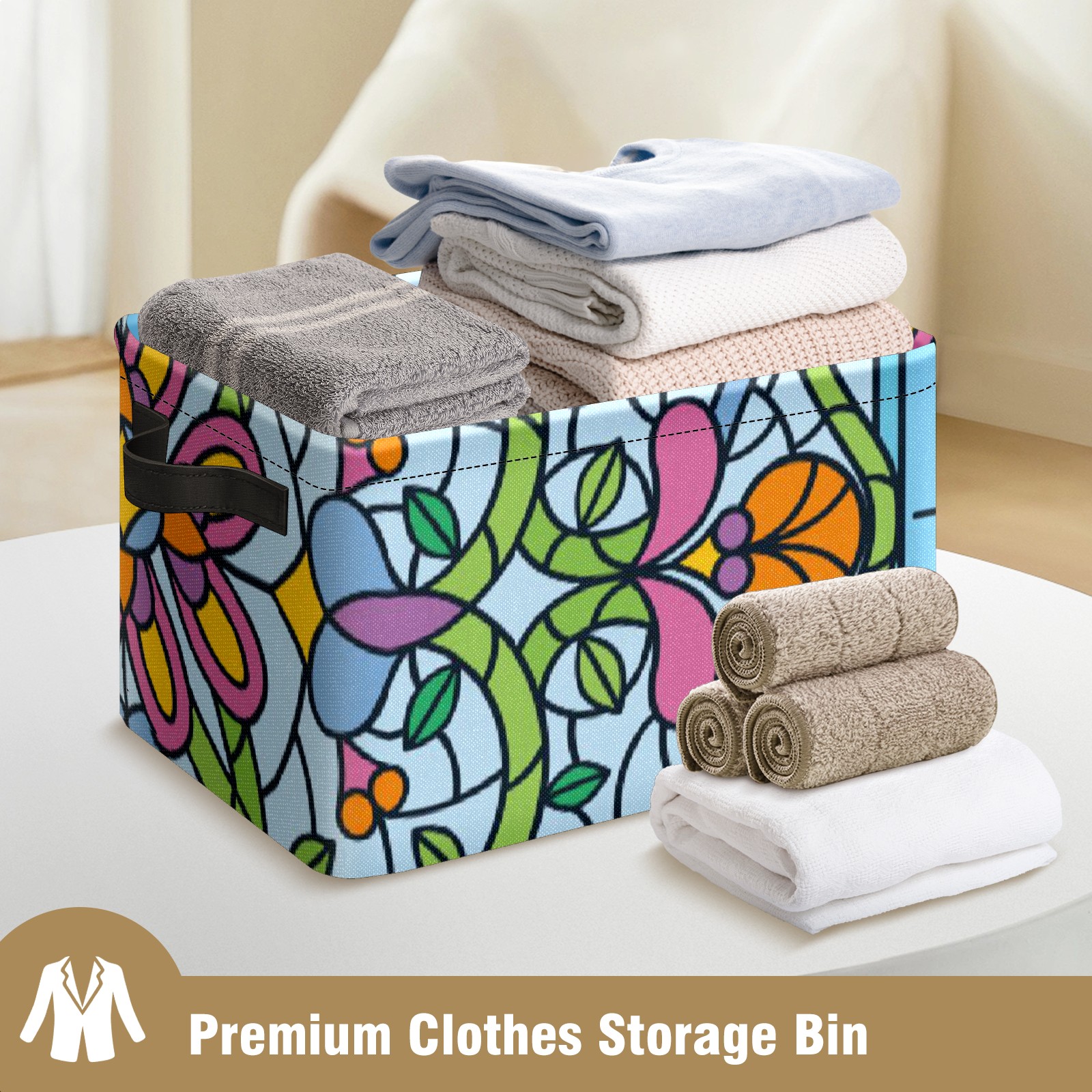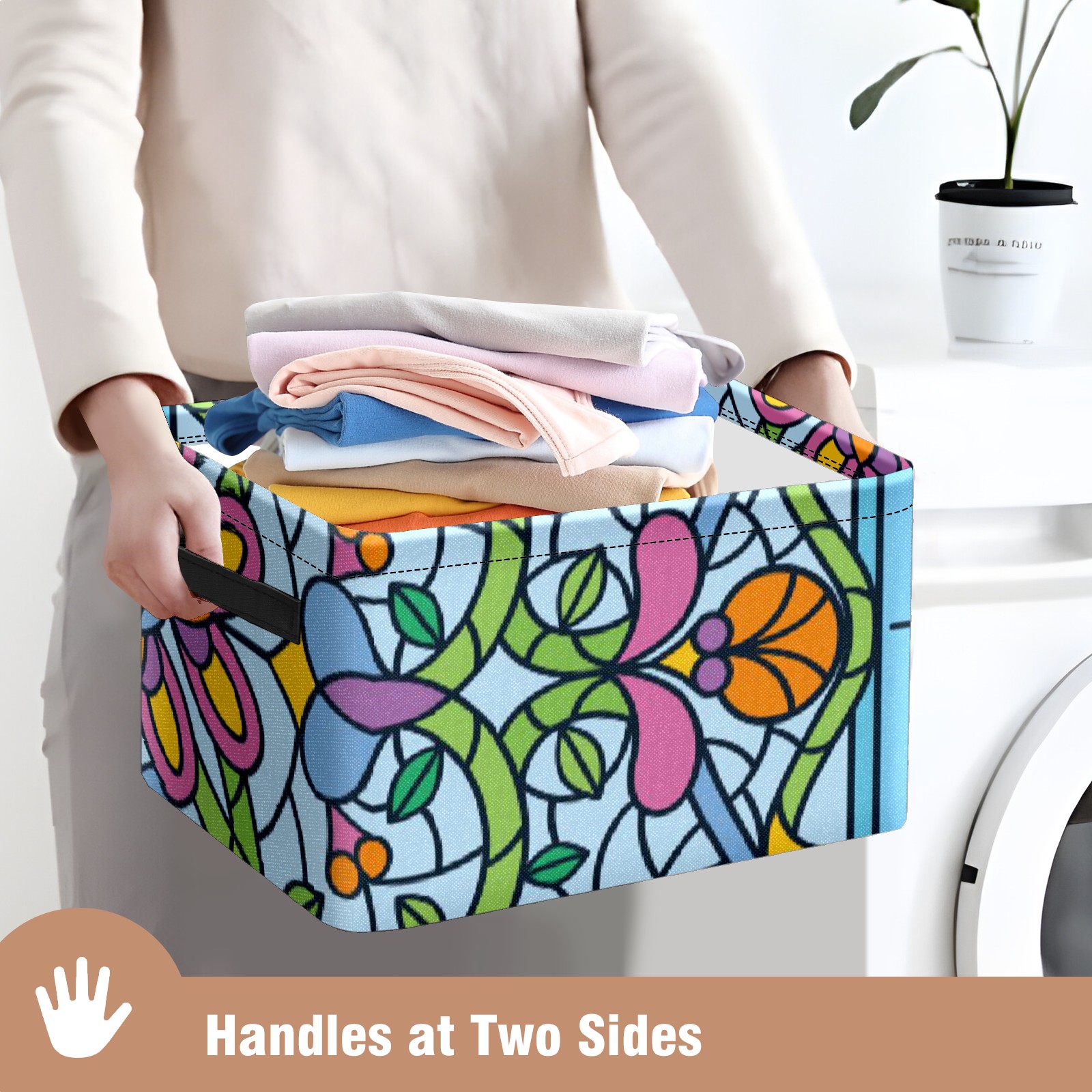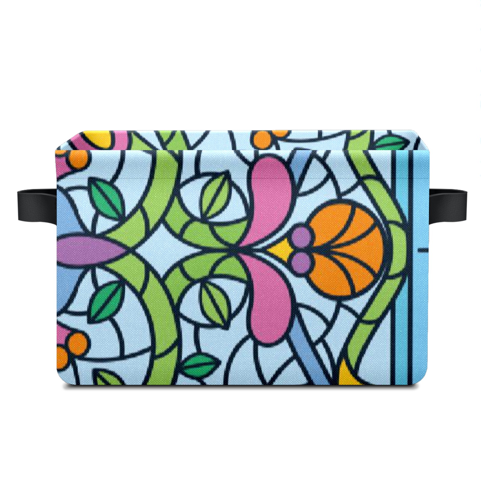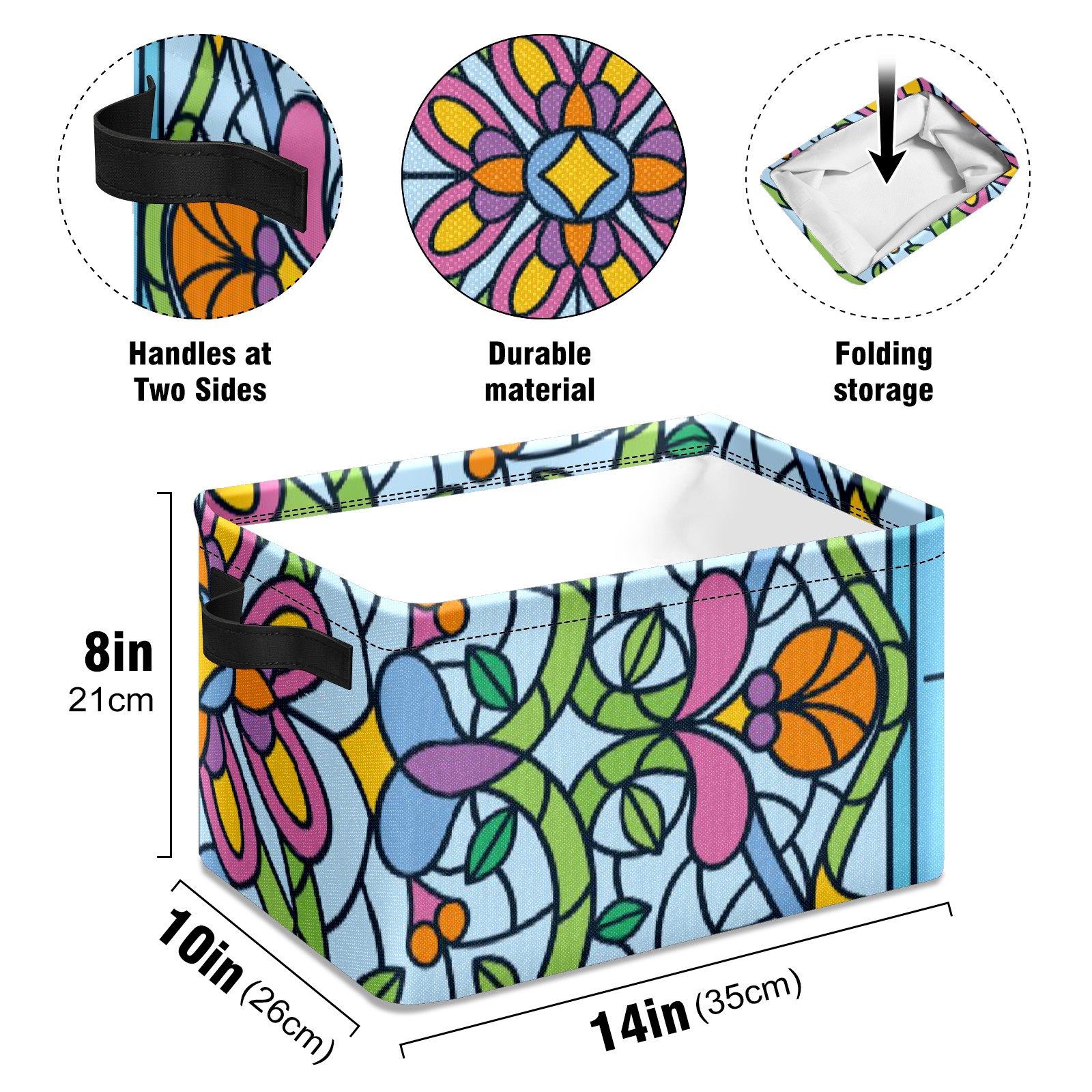 Collapsible 600D Oxford Storage Basket with Stained Glass Pink Floral Pattern Green Leaves - Metal Frame 10"x14"x8" Reinforced Handles, Multi-Purpose Organizer