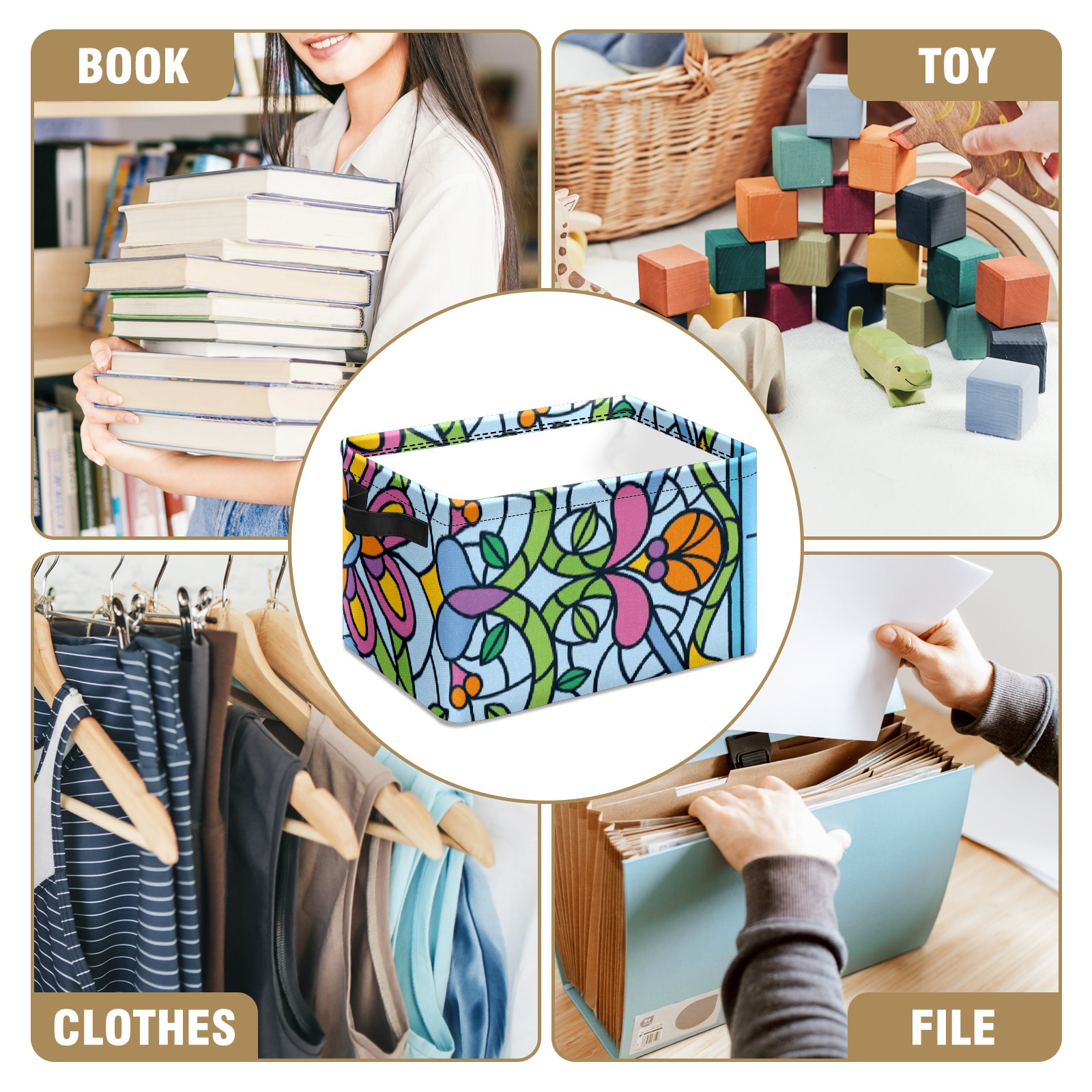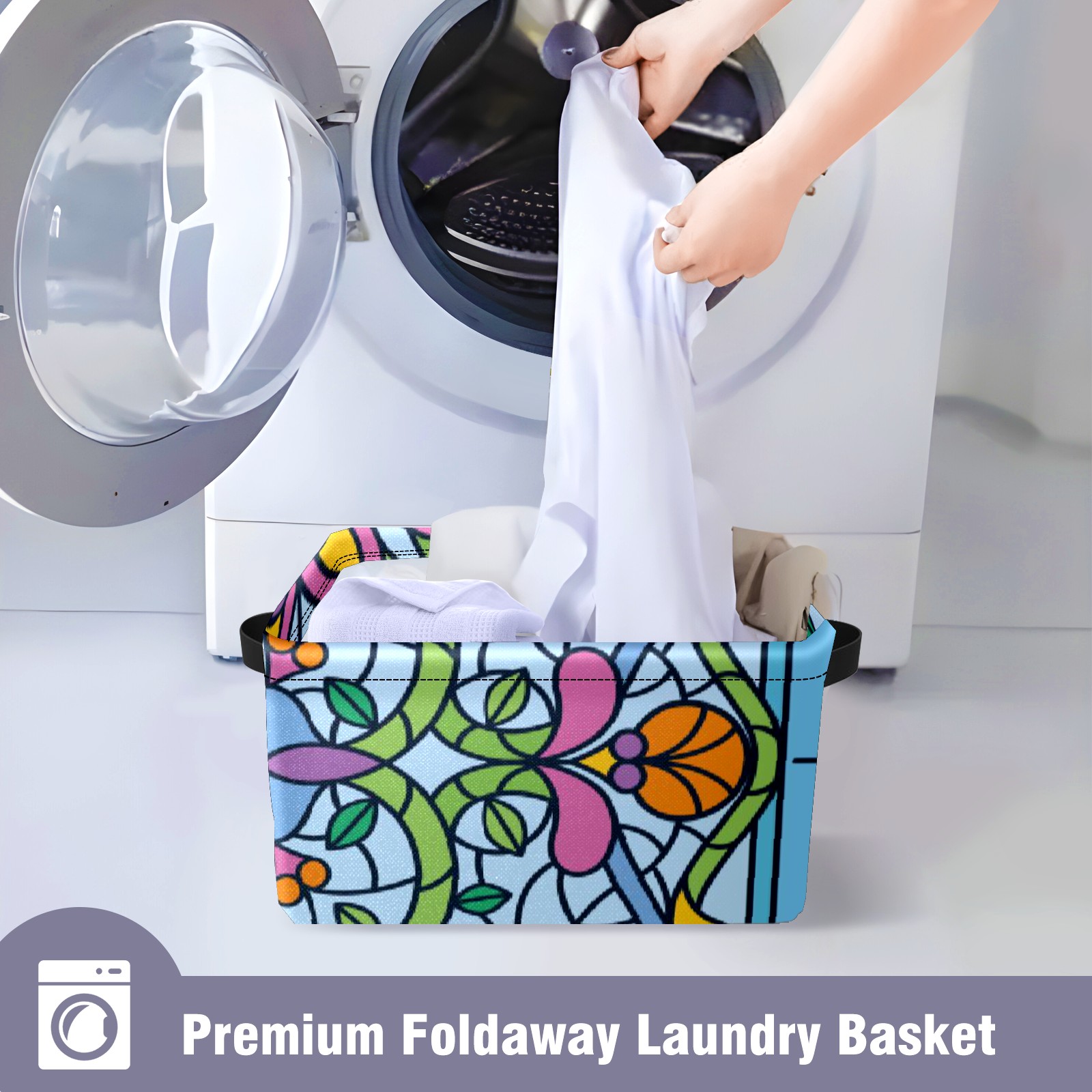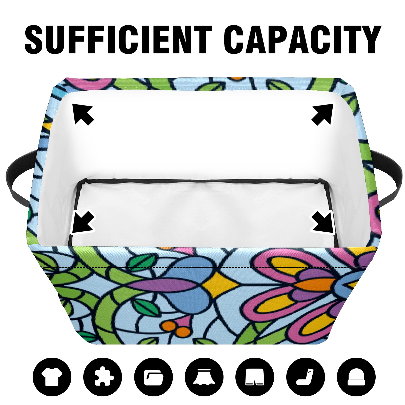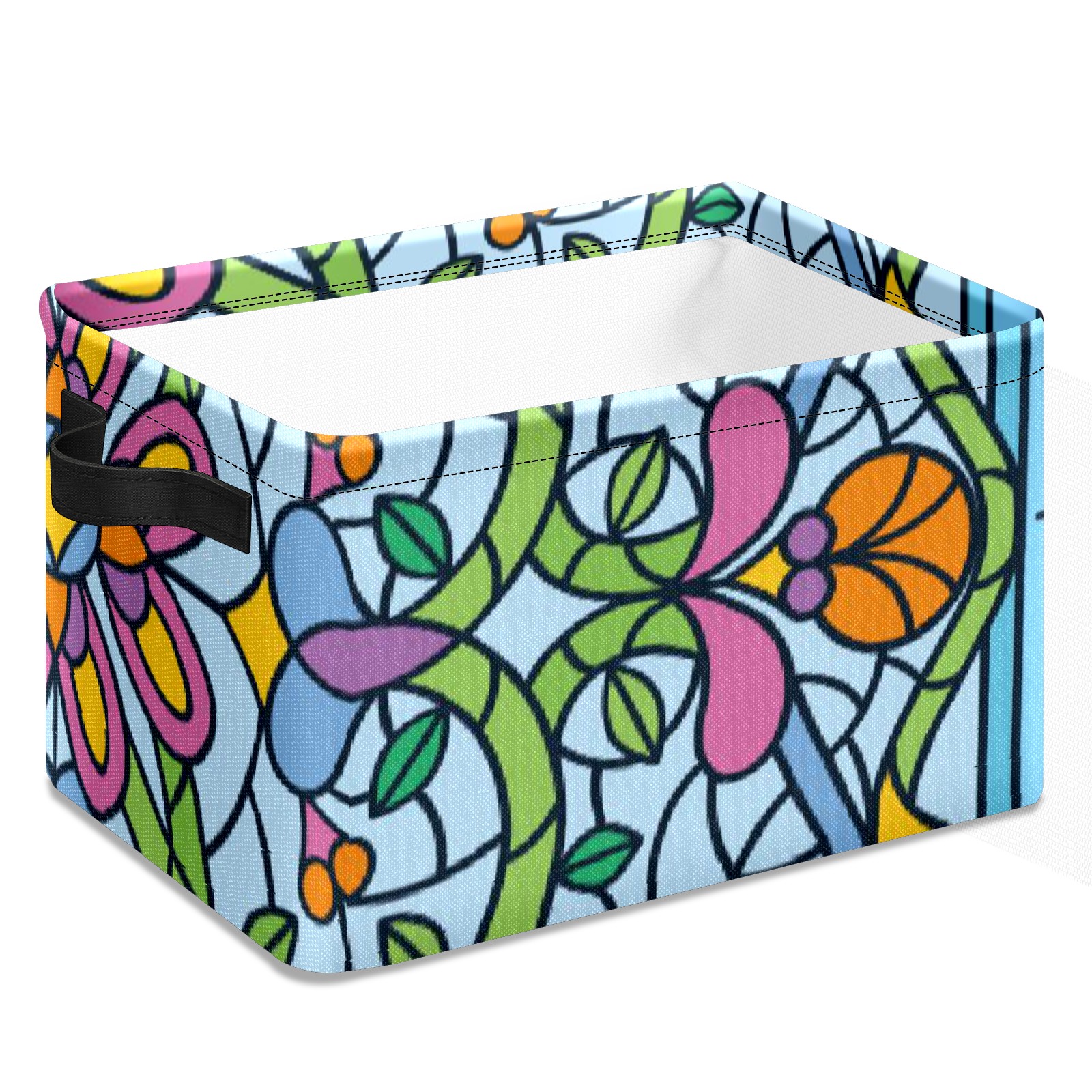 Collapsible 600D Oxford Storage Basket with Stained Glass Pink Floral Pattern Green Leaves - Metal Frame 10"x14"x8" Reinforced Handles, Multi-Purpose Organizer