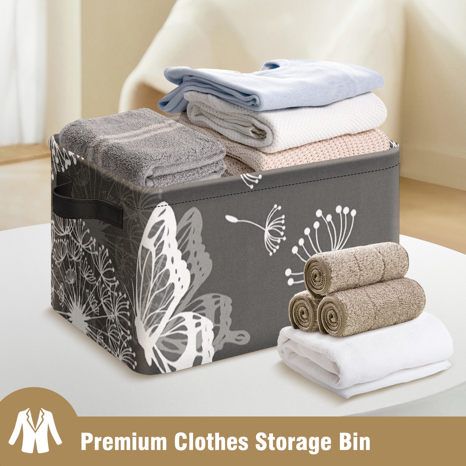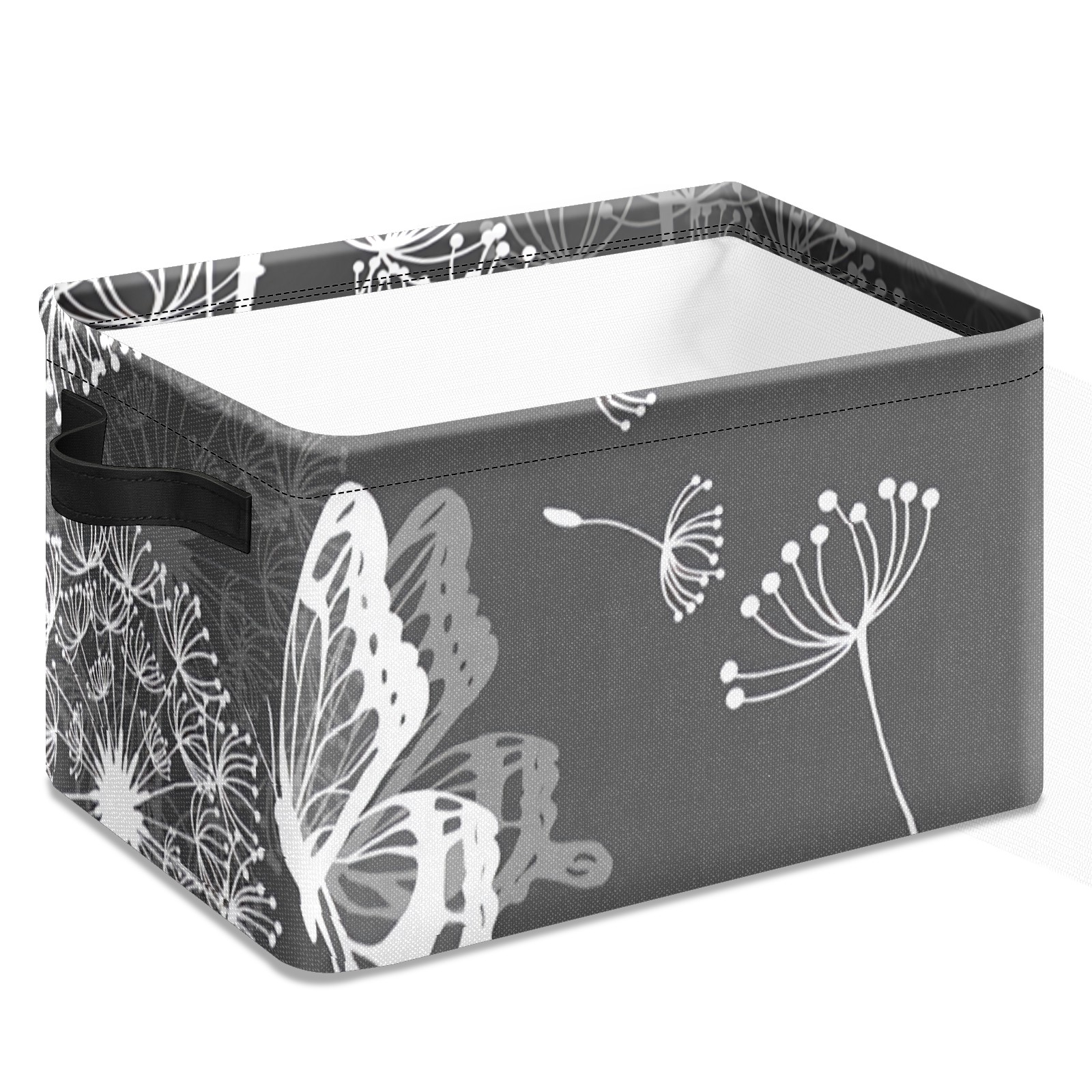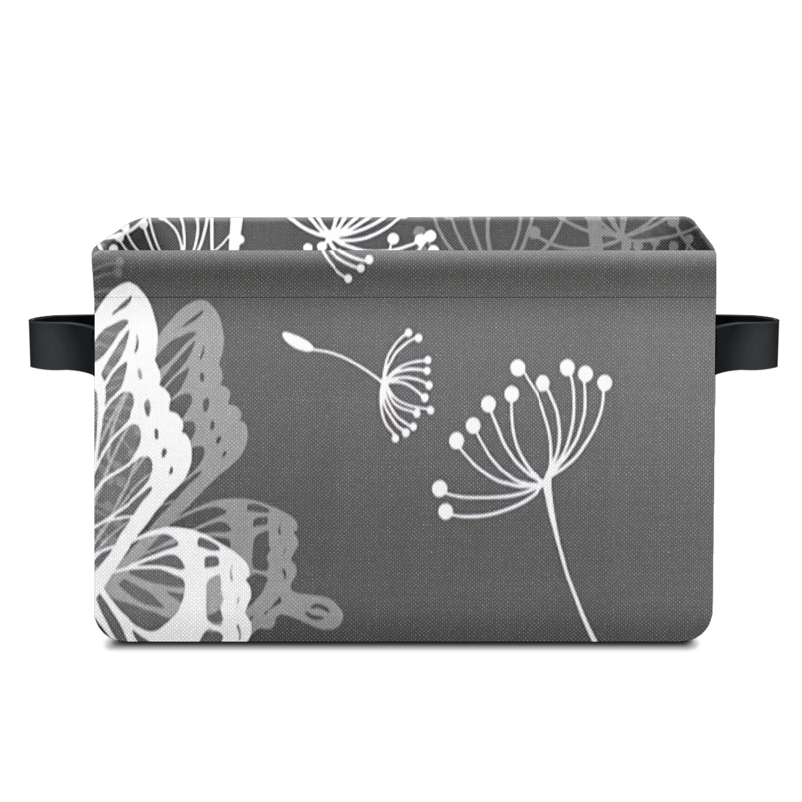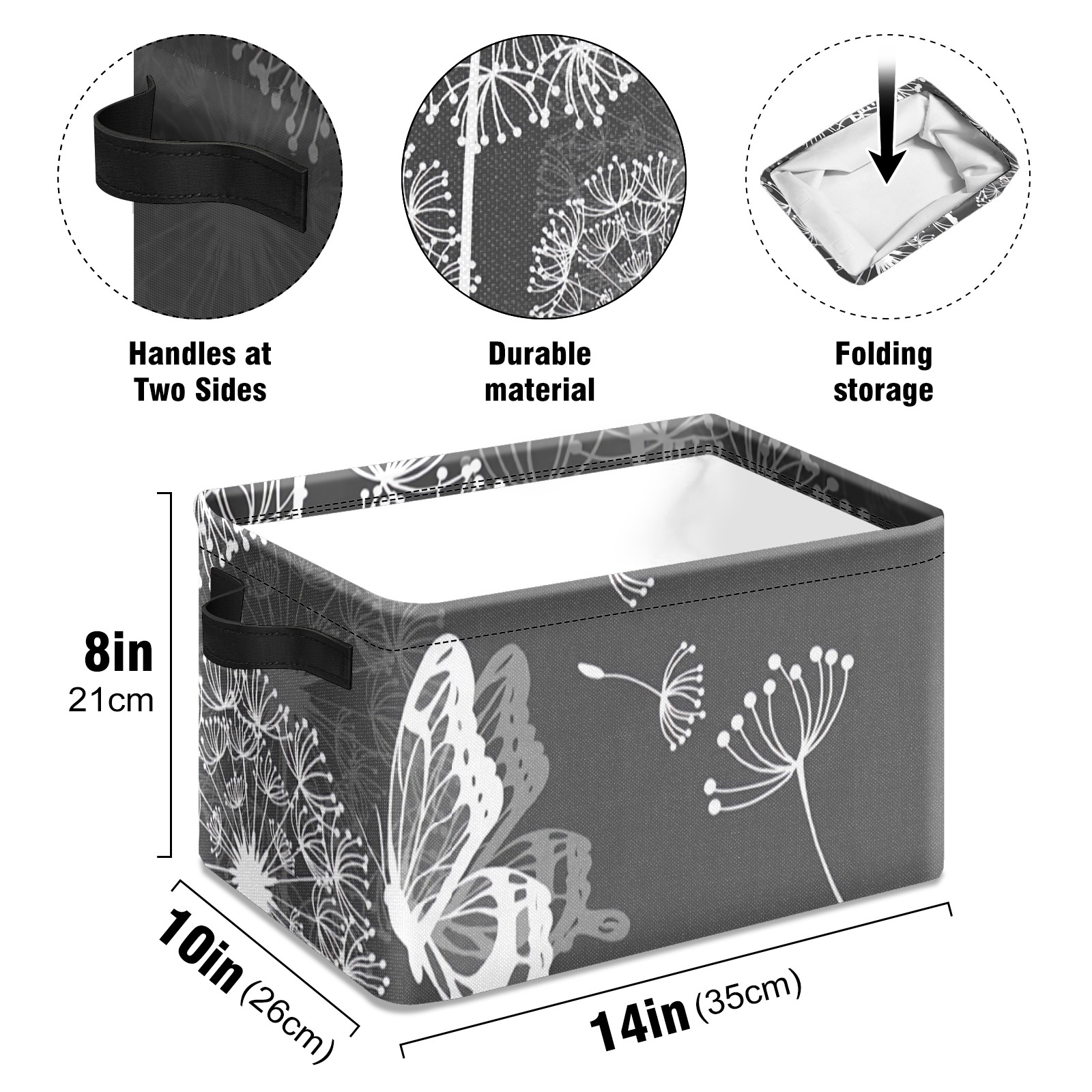 Collapsible 600D Oxford Storage Basket with Dandelion Butterfly Grey - Metal Frame 10"x14"x8" Reinforced Handles, Multi-Purpose Organizer