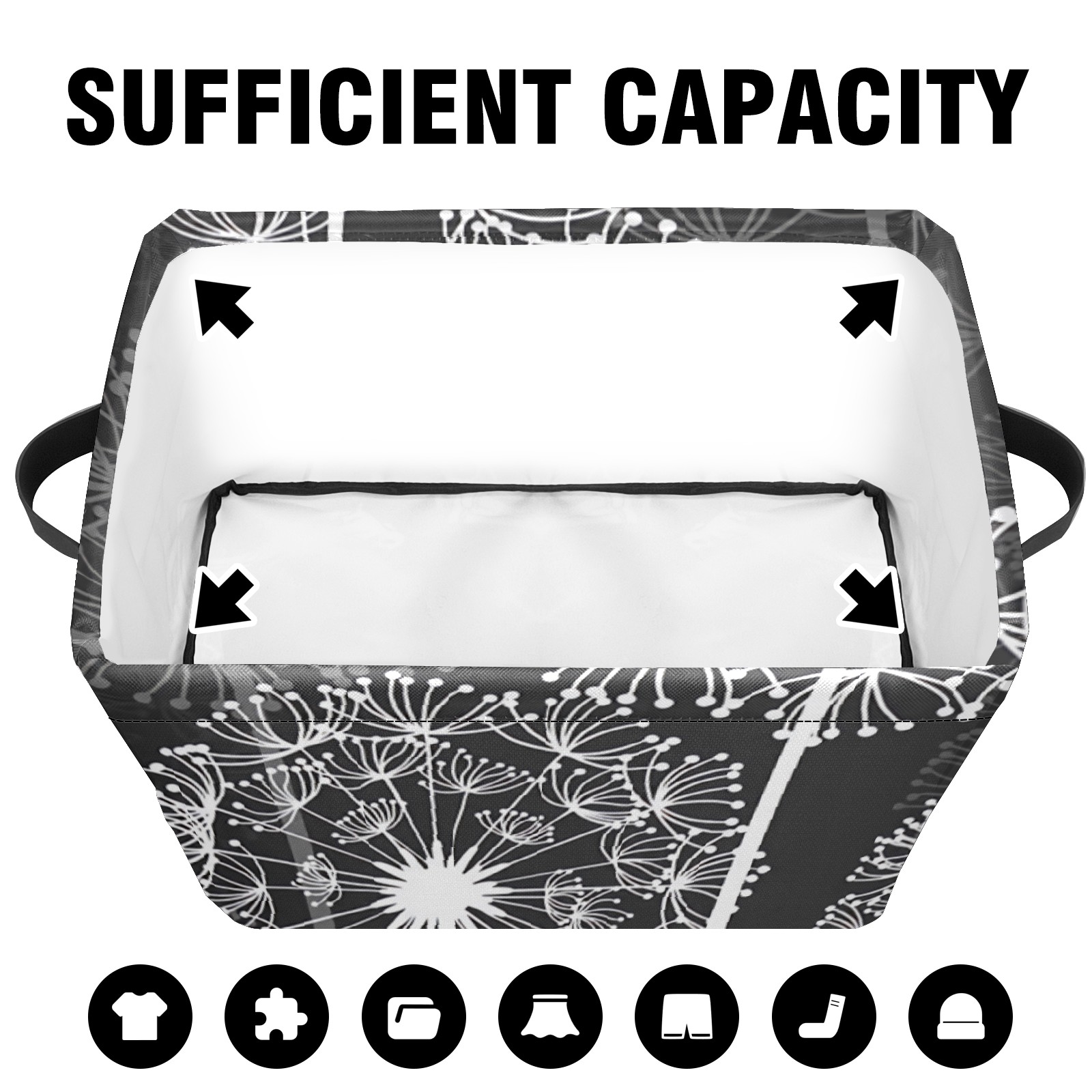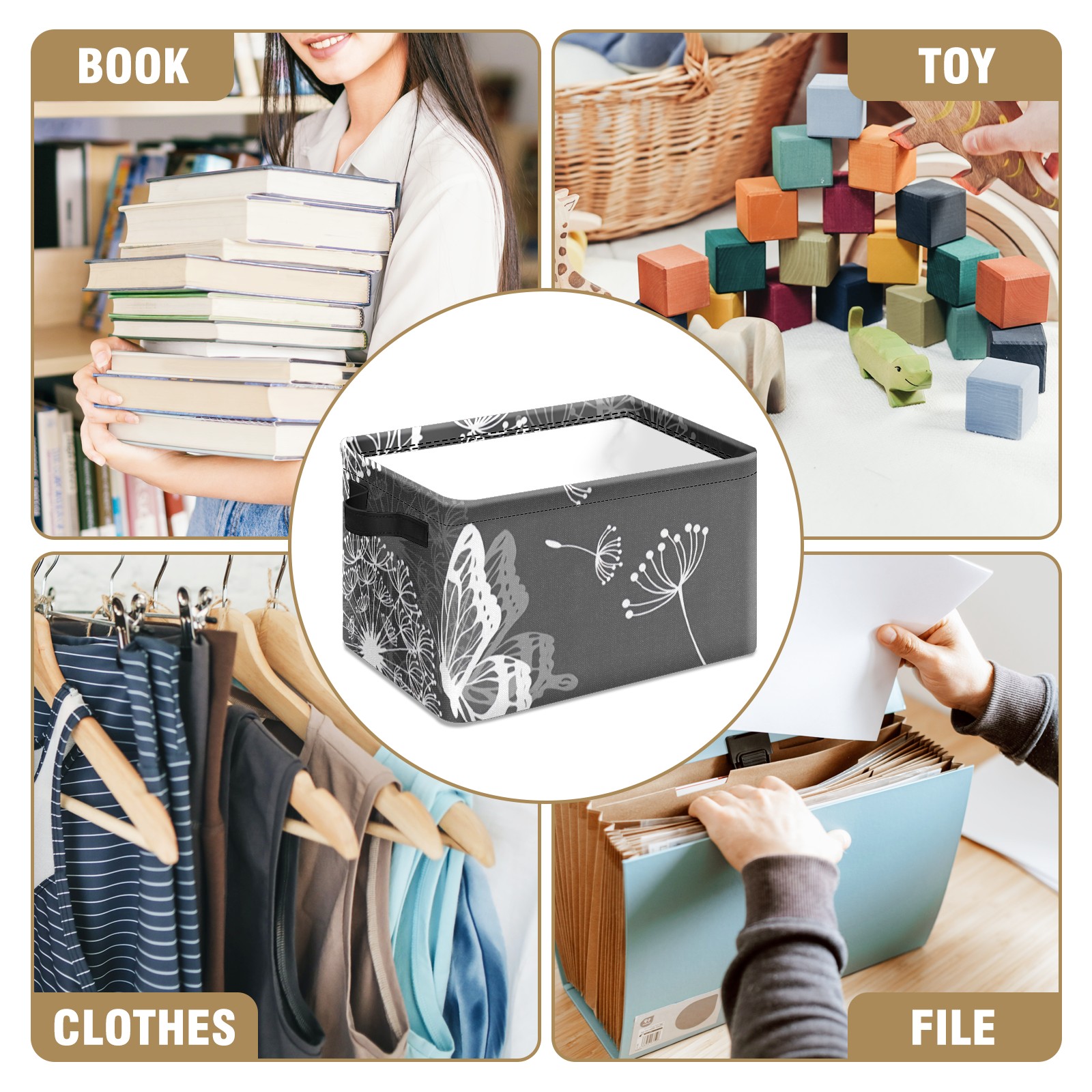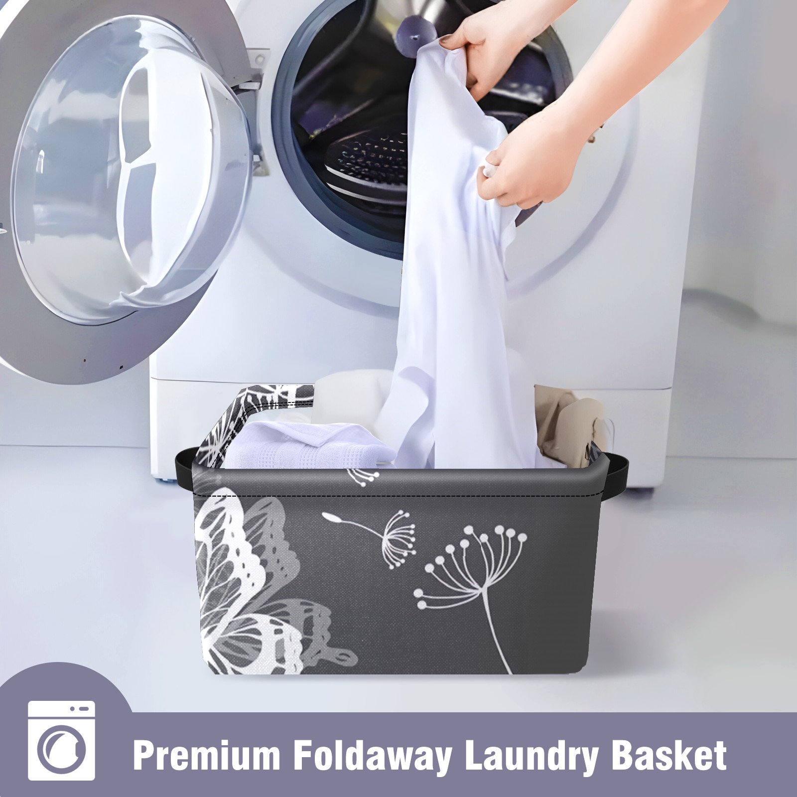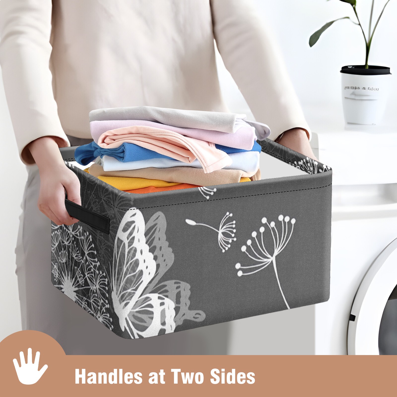 Collapsible 600D Oxford Storage Basket with Dandelion Butterfly Grey - Metal Frame 10"x14"x8" Reinforced Handles, Multi-Purpose Organizer