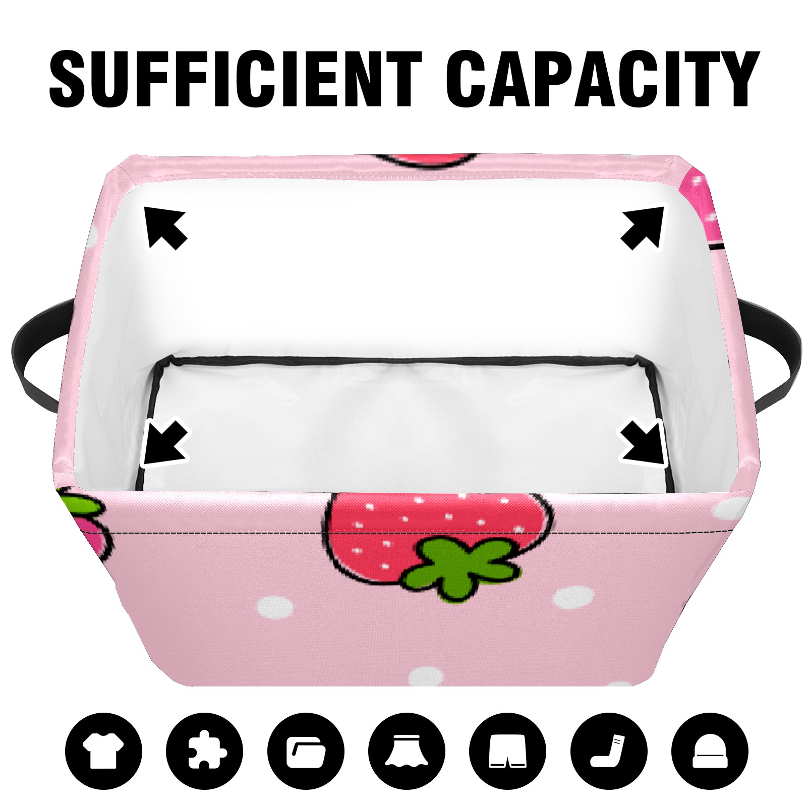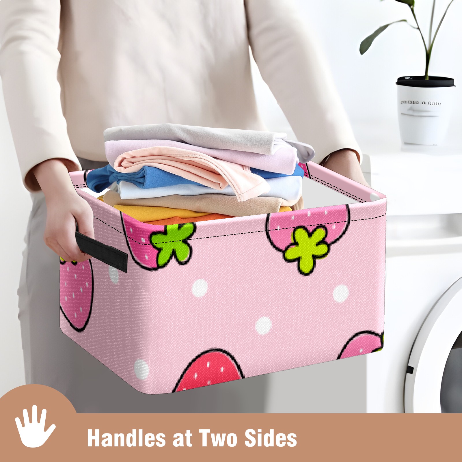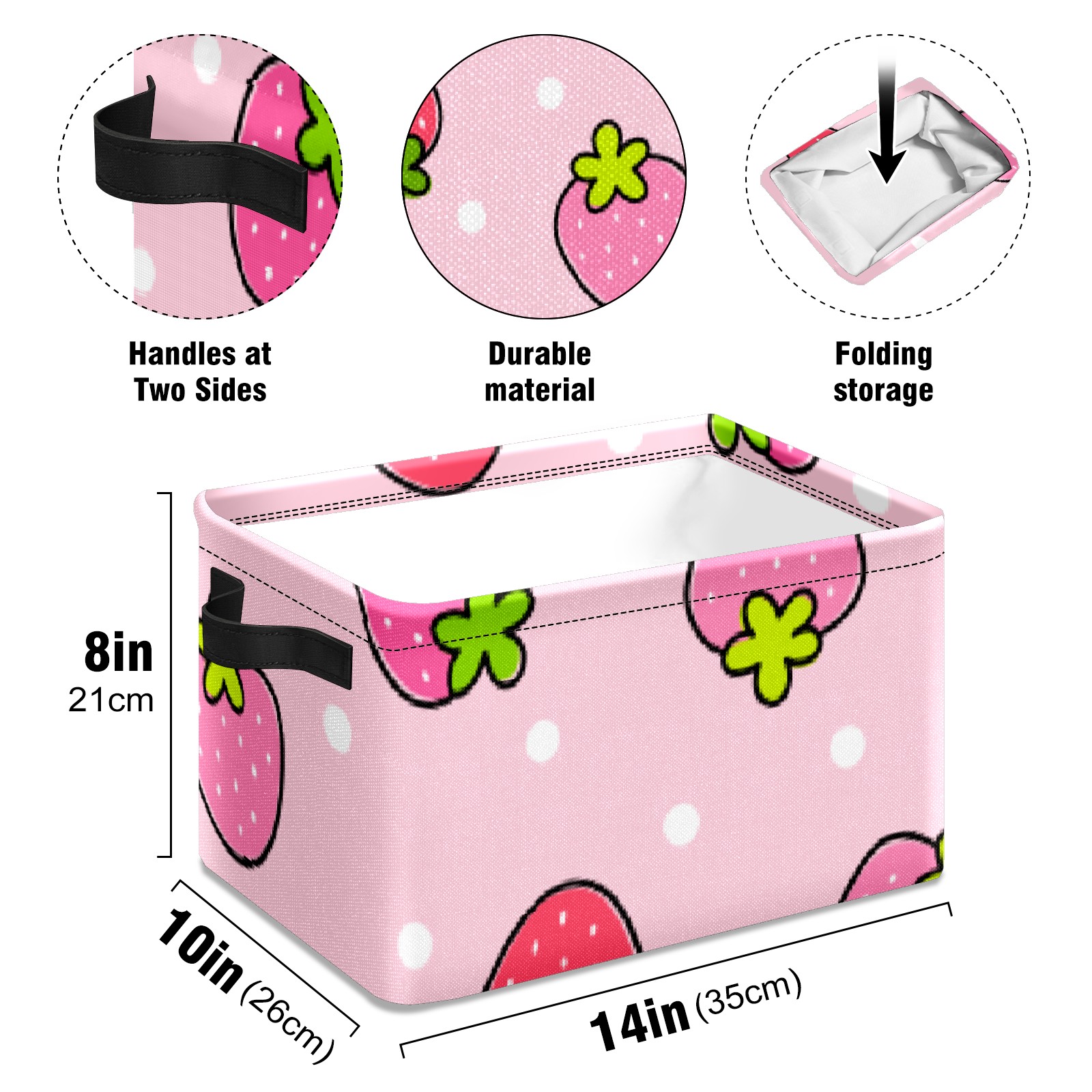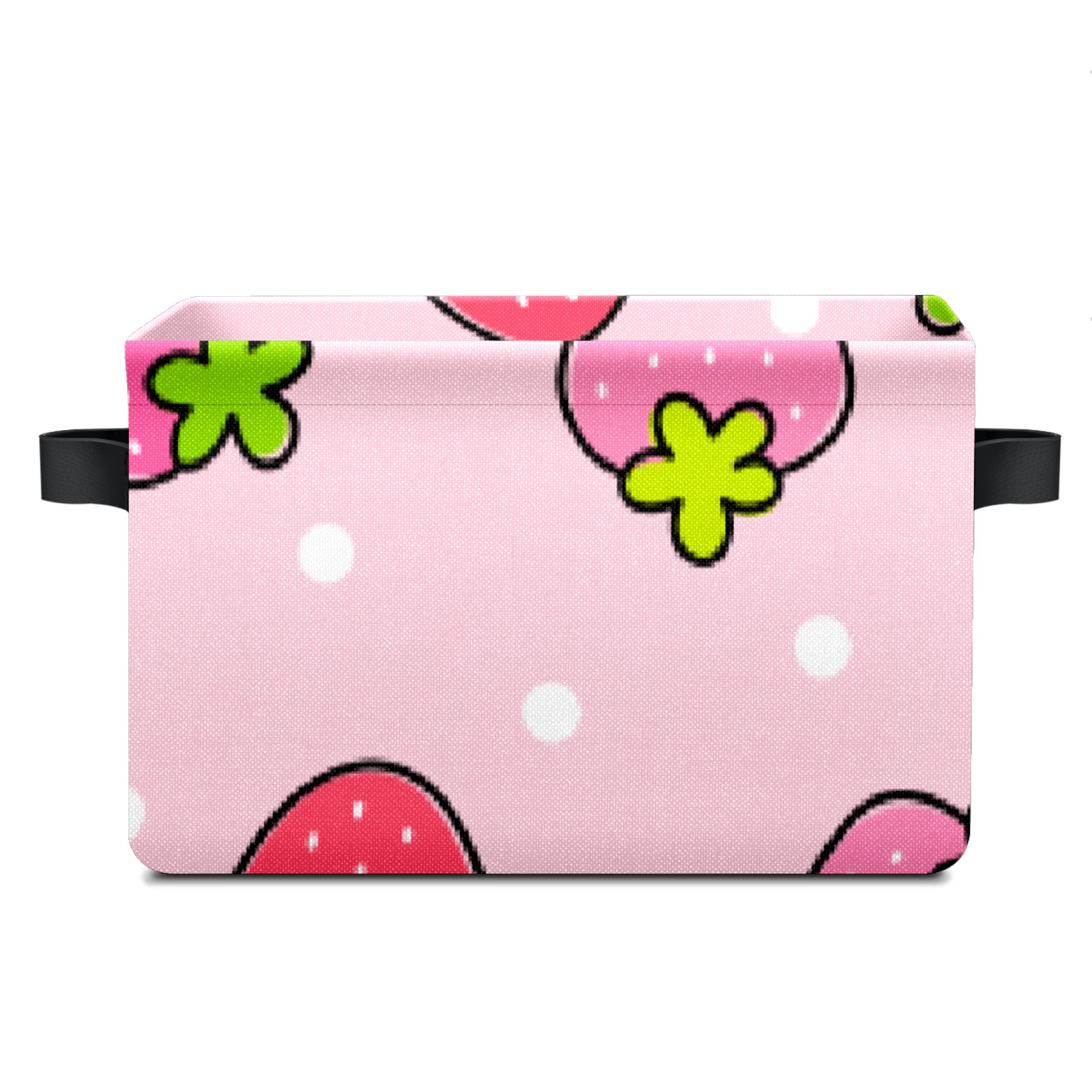 Collapsible 600D Oxford Storage Basket with Pink Strawberry - Metal Frame 10"x14"x8" Reinforced Handles, Multi-Purpose Organizer