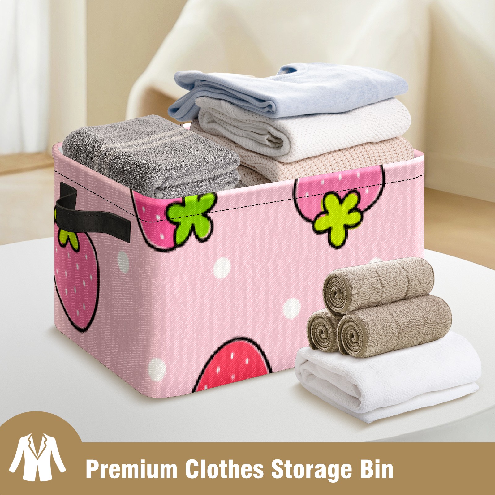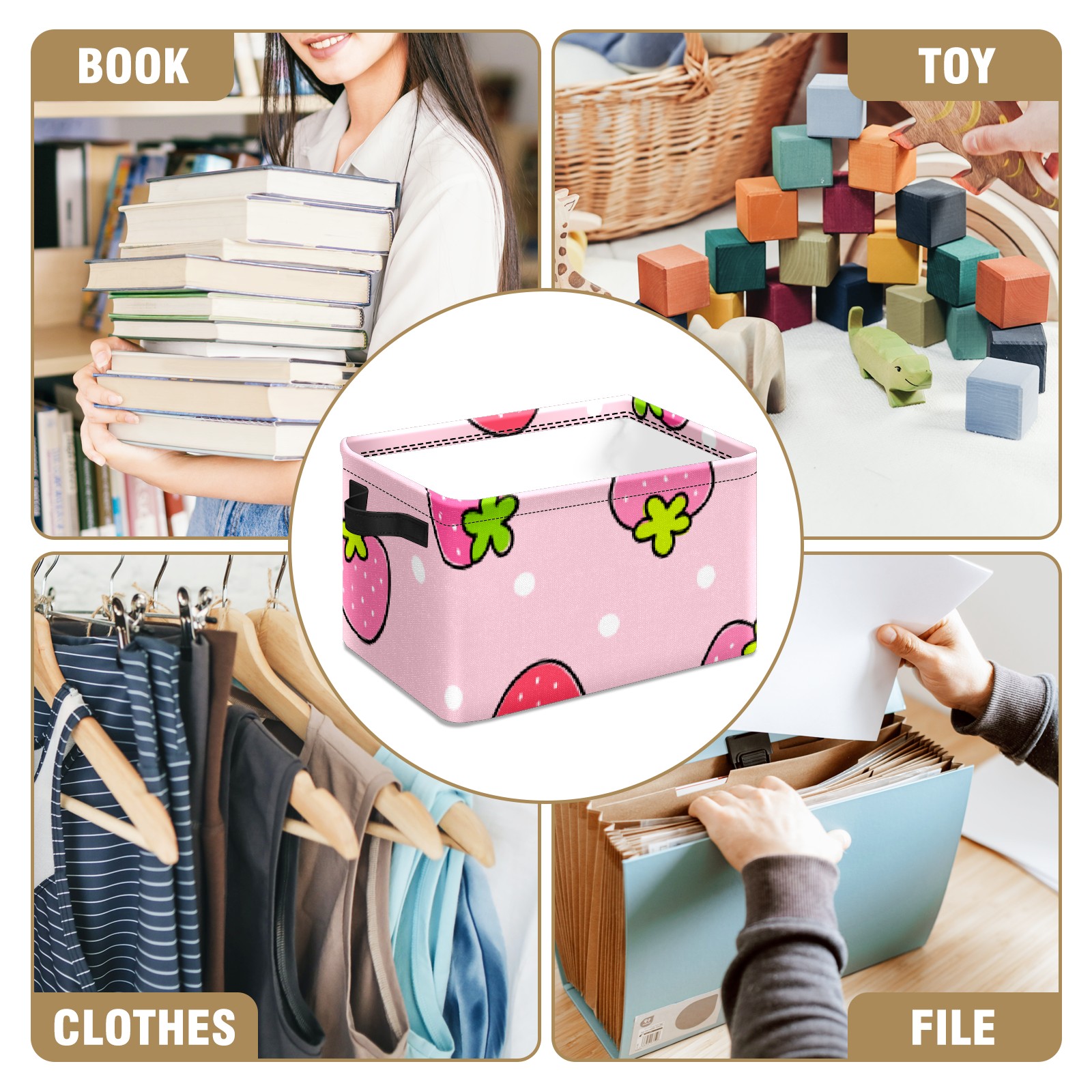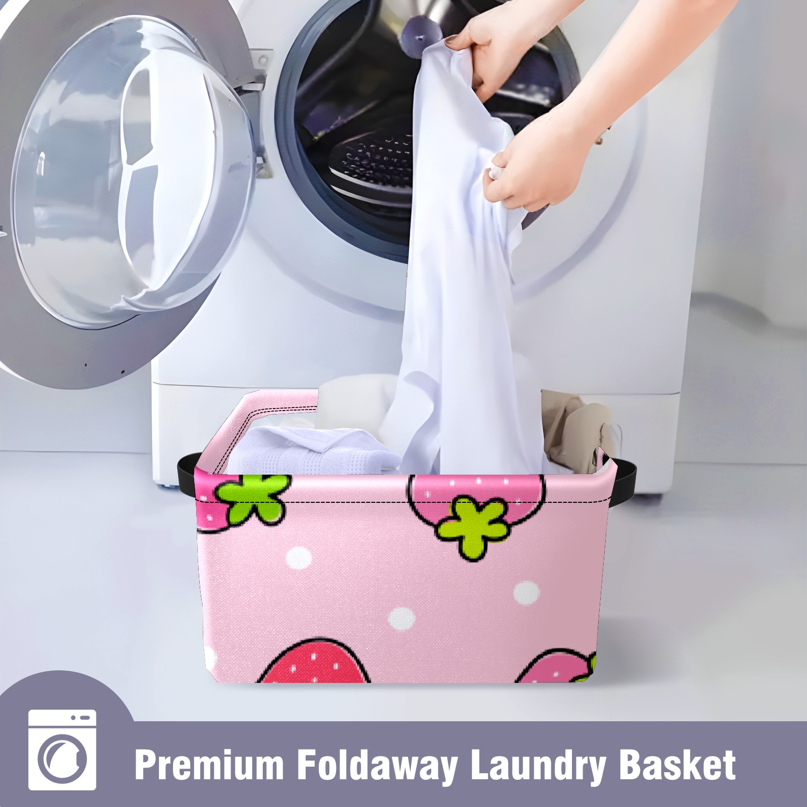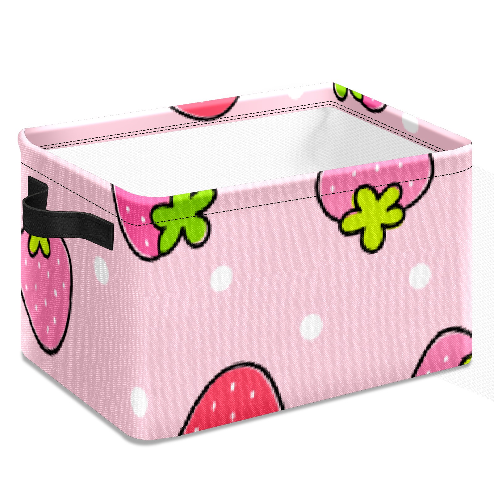 Collapsible 600D Oxford Storage Basket with Pink Strawberry - Metal Frame 10"x14"x8" Reinforced Handles, Multi-Purpose Organizer