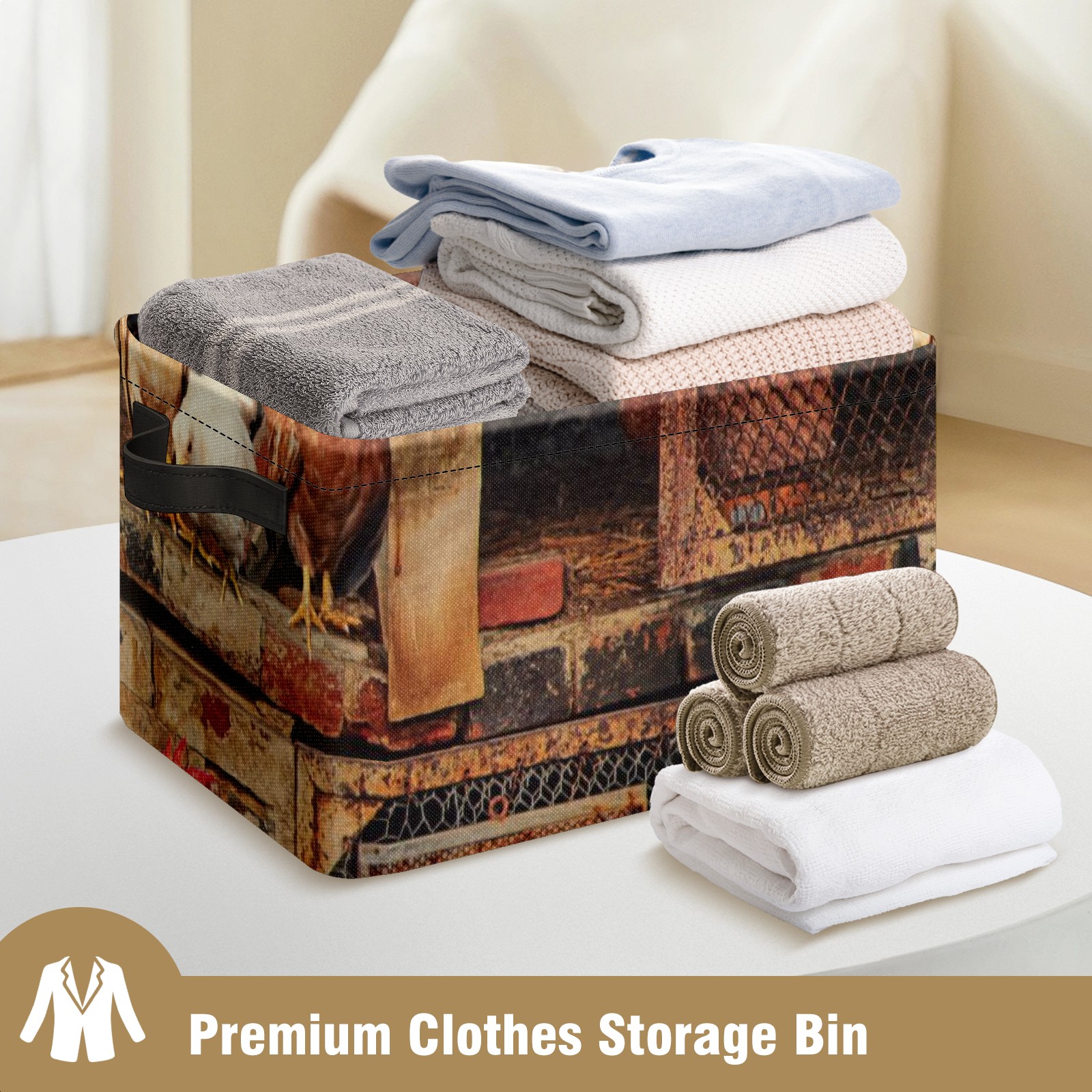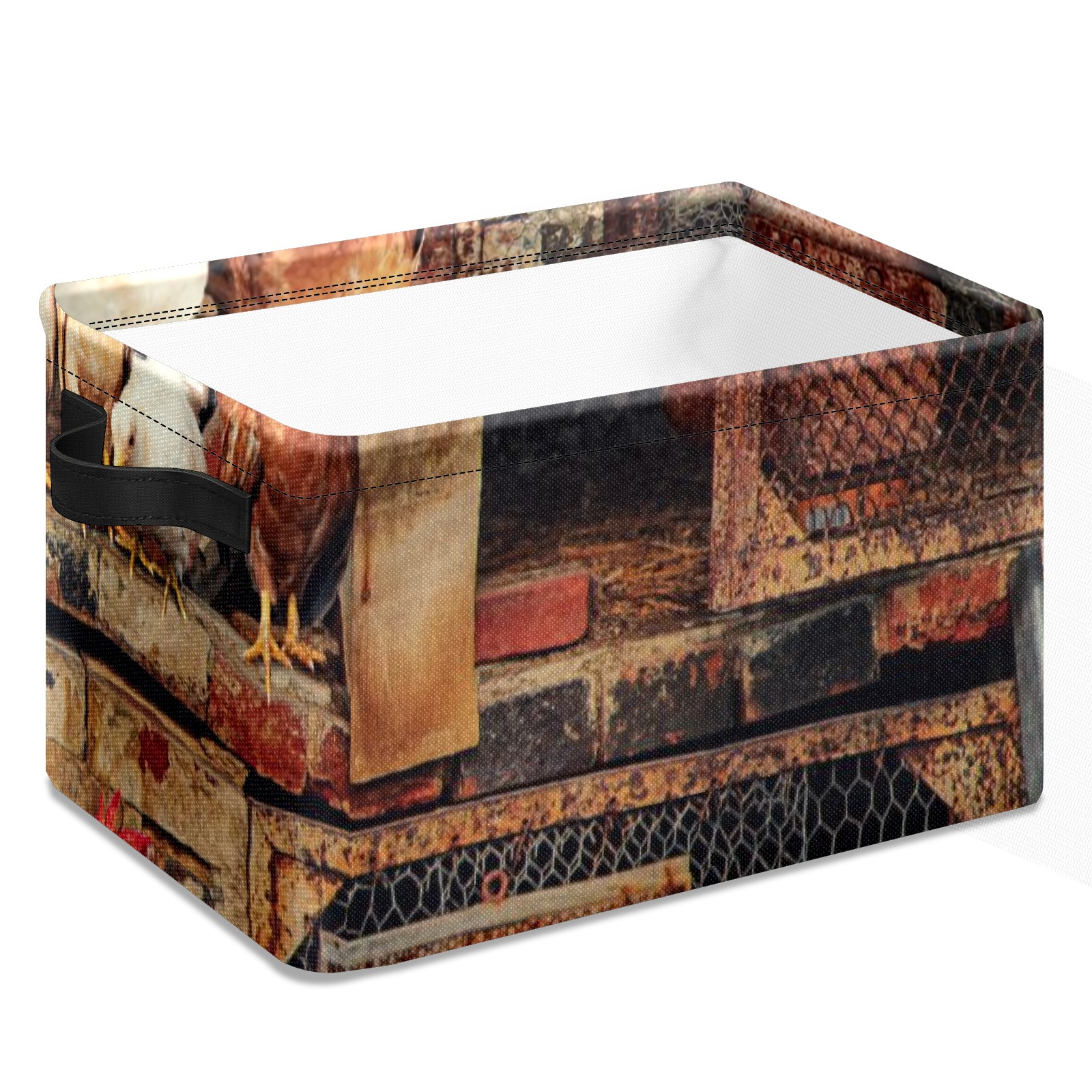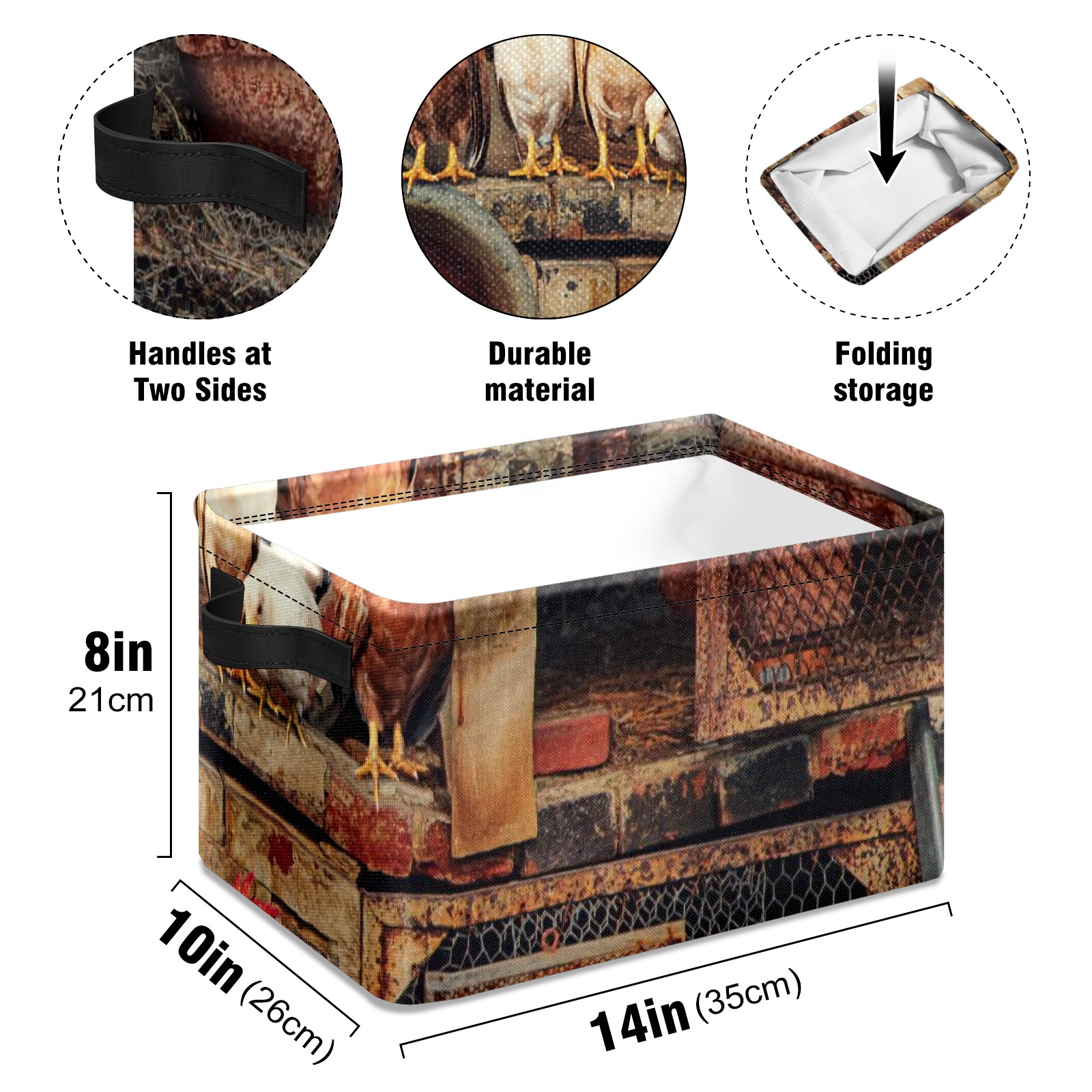 Collapsible 600D Oxford Storage Basket with Retro Roosters Hens Chicken Cock - Metal Frame 10"x14"x8" Reinforced Handles, Multi-Purpose Organizer