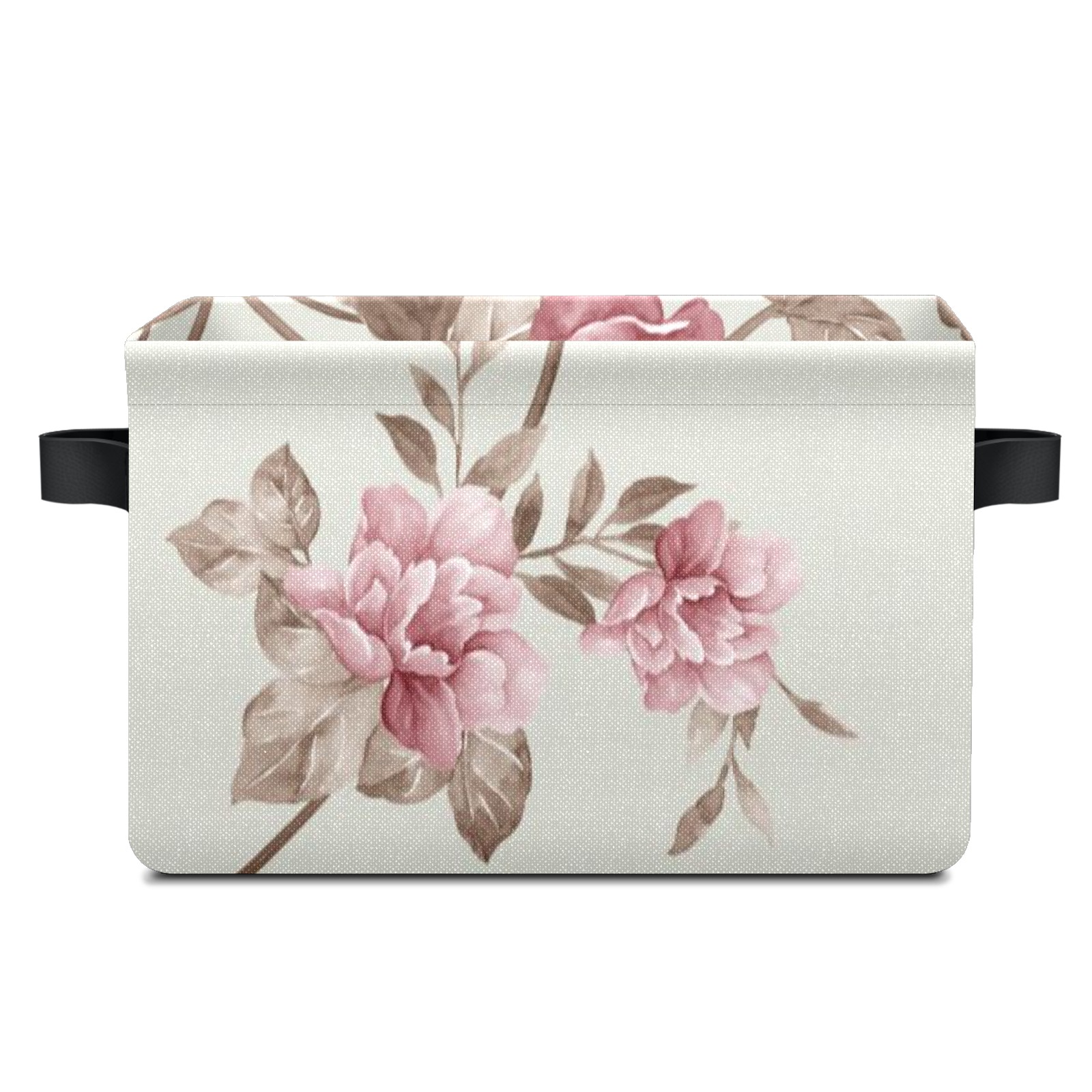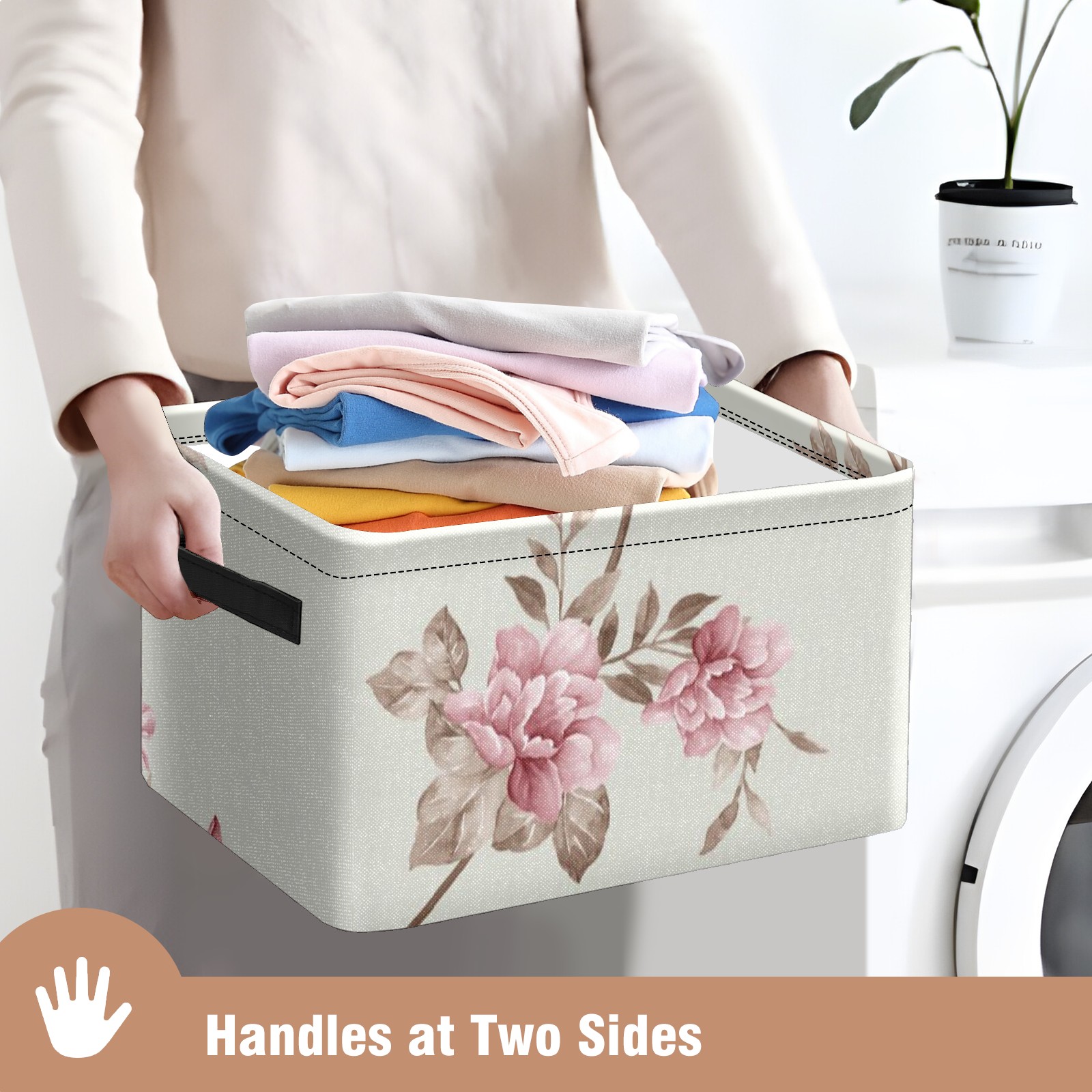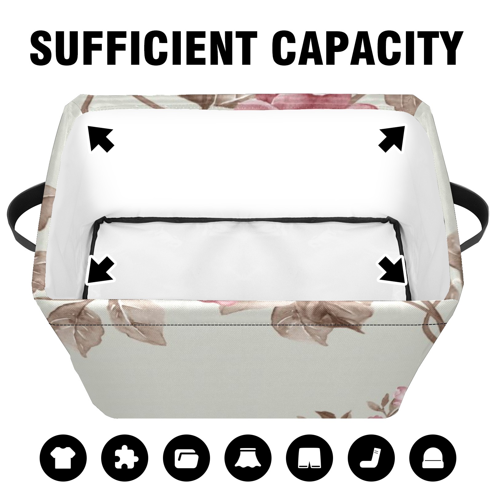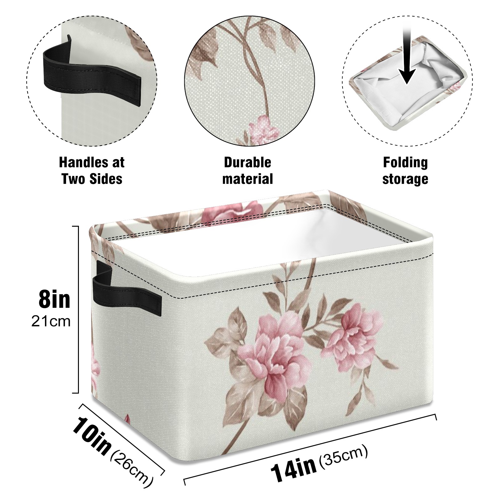 Collapsible 600D Oxford Storage Basket with Rose Flower - Metal Frame 10"x14"x8" Reinforced Handles, Multi-Purpose Organizer