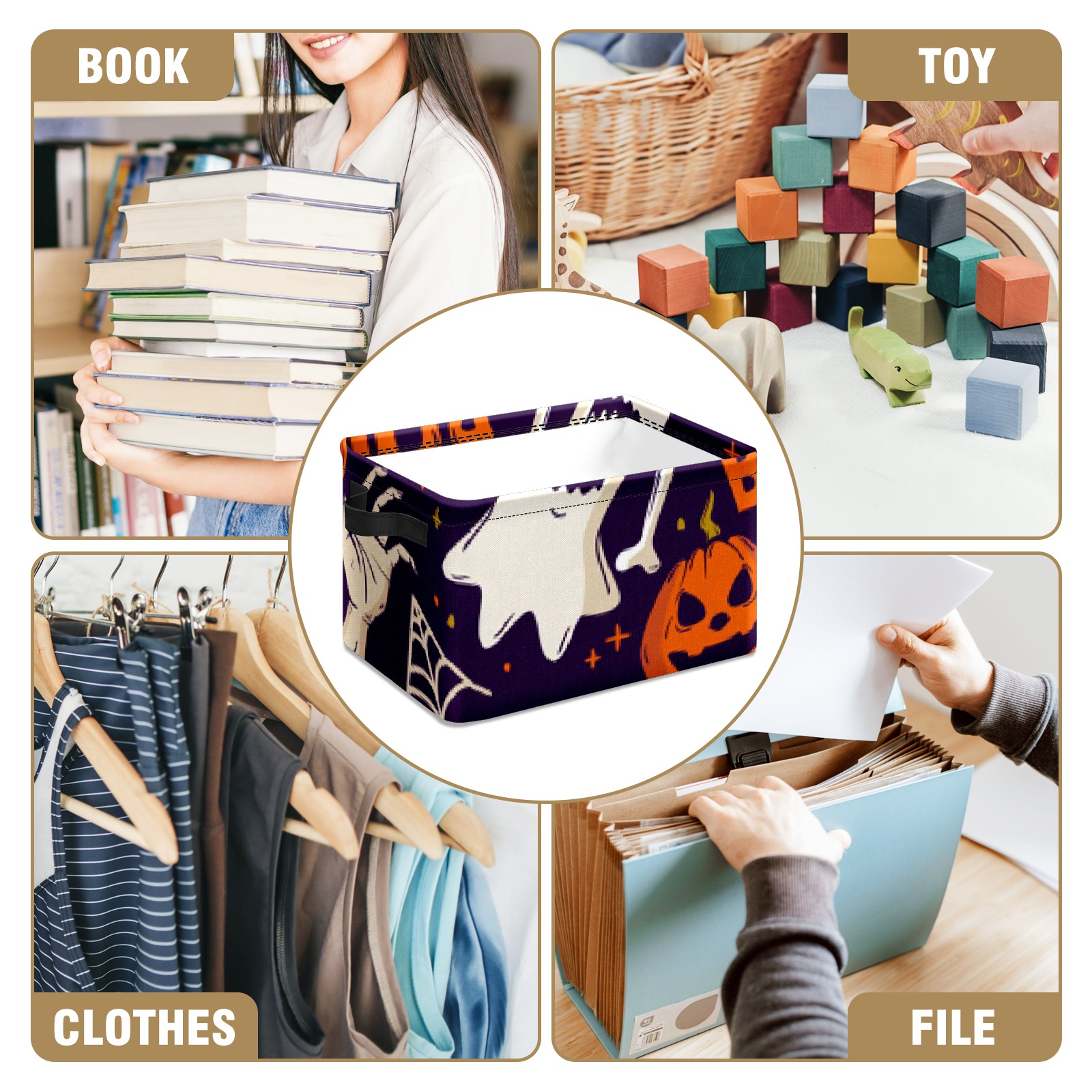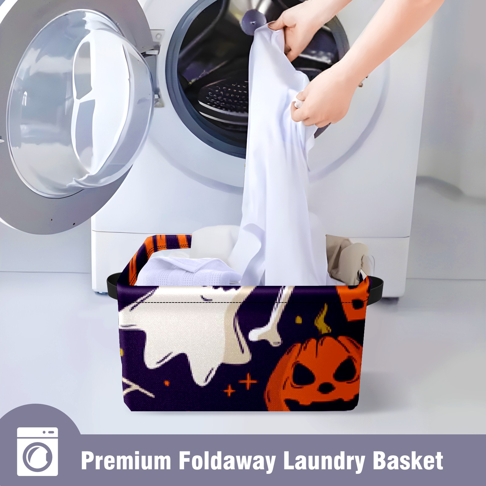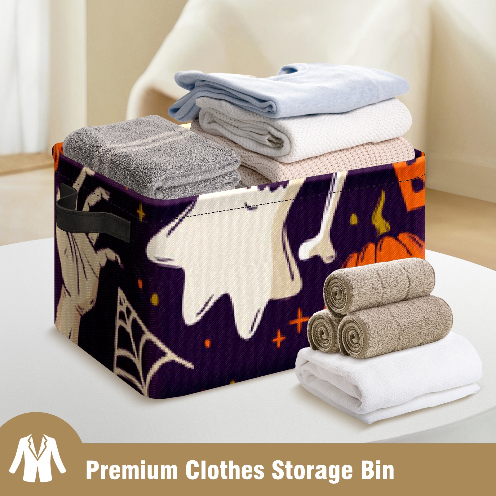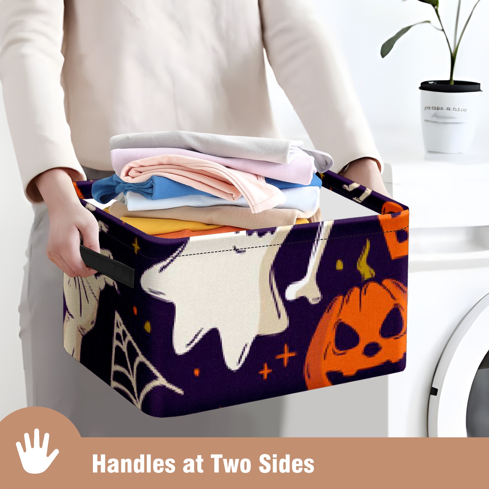 Collapsible 600D Oxford Storage Basket with Pumpkin Ghost - Metal Frame 10"x14"x8" Reinforced Handles, Multi-Purpose Organizer