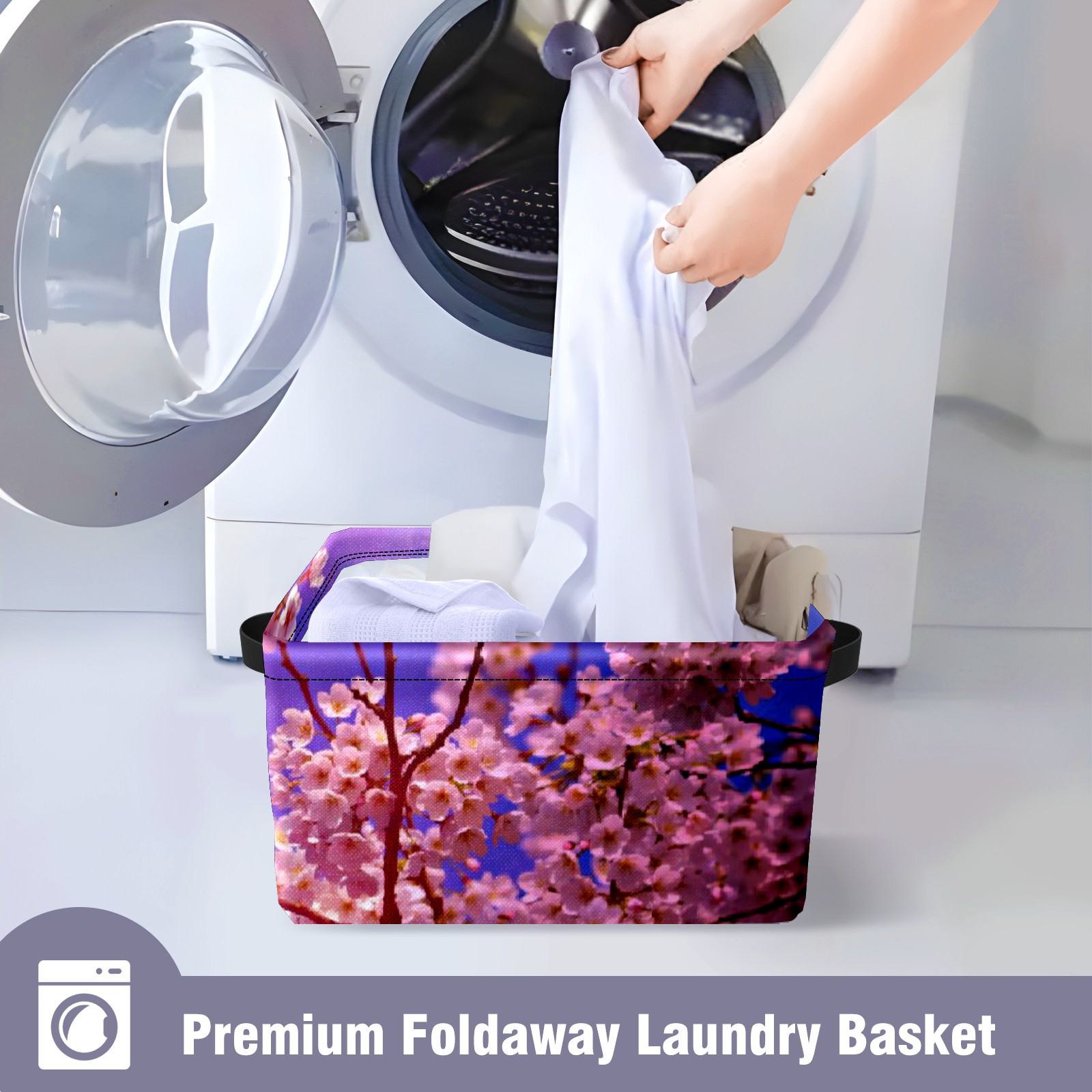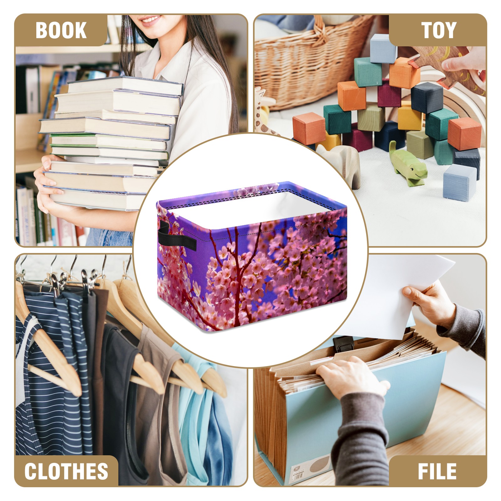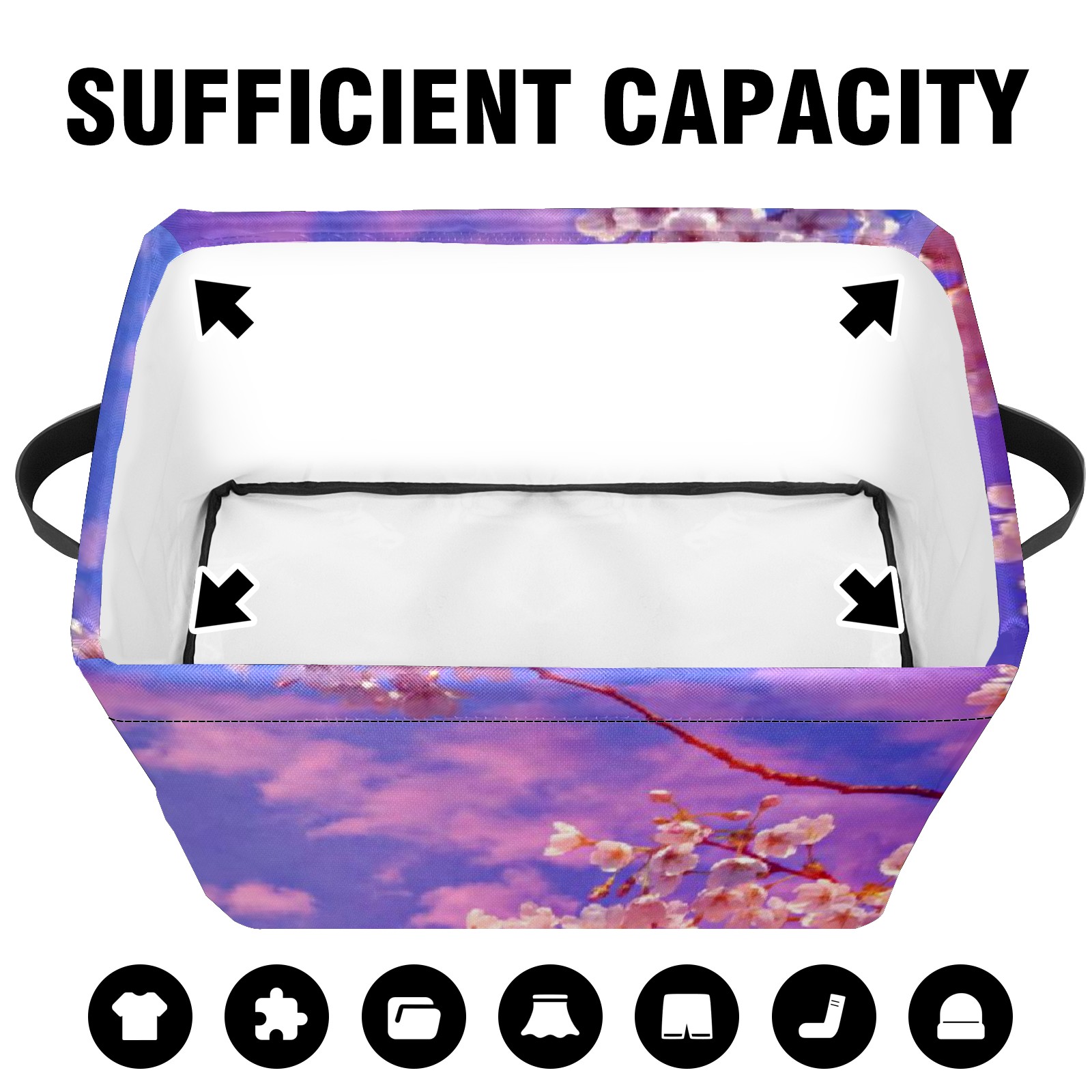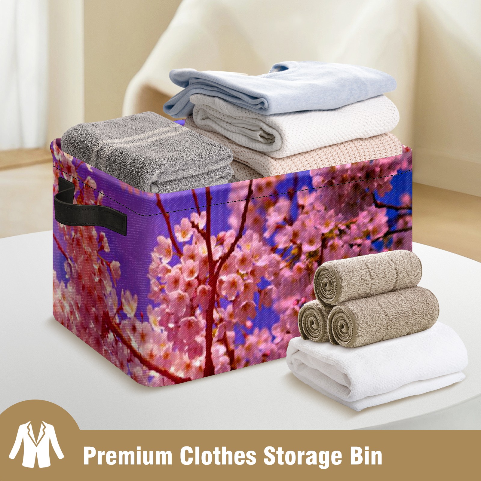 Collapsible 600D Oxford Storage Basket with Pink Cloud Clear Sky Cherry Blossom Tree - Metal Frame 10"x14"x8" Reinforced Handles, Multi-Purpose Organizer