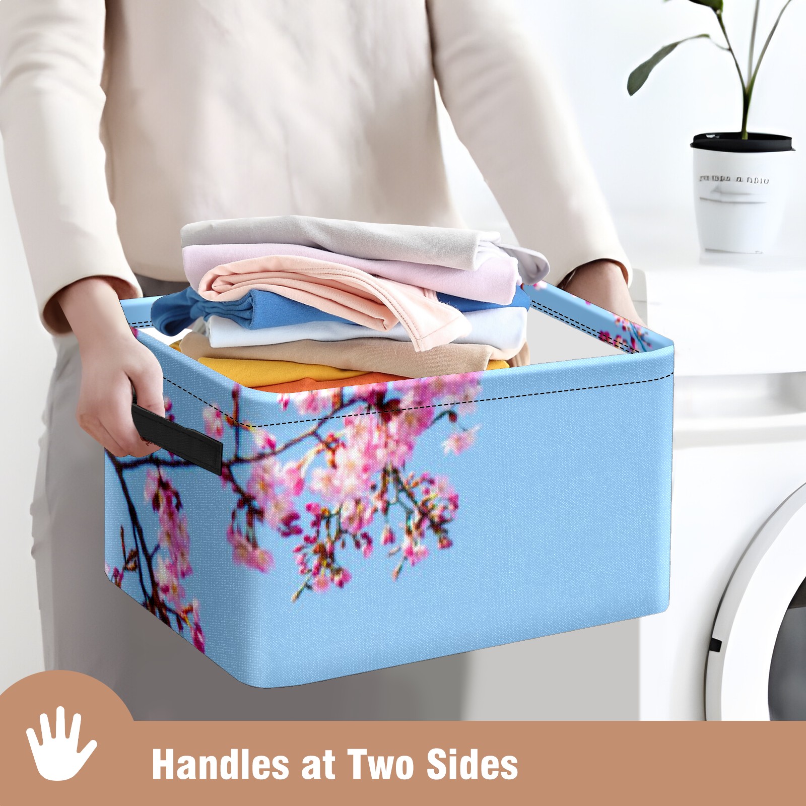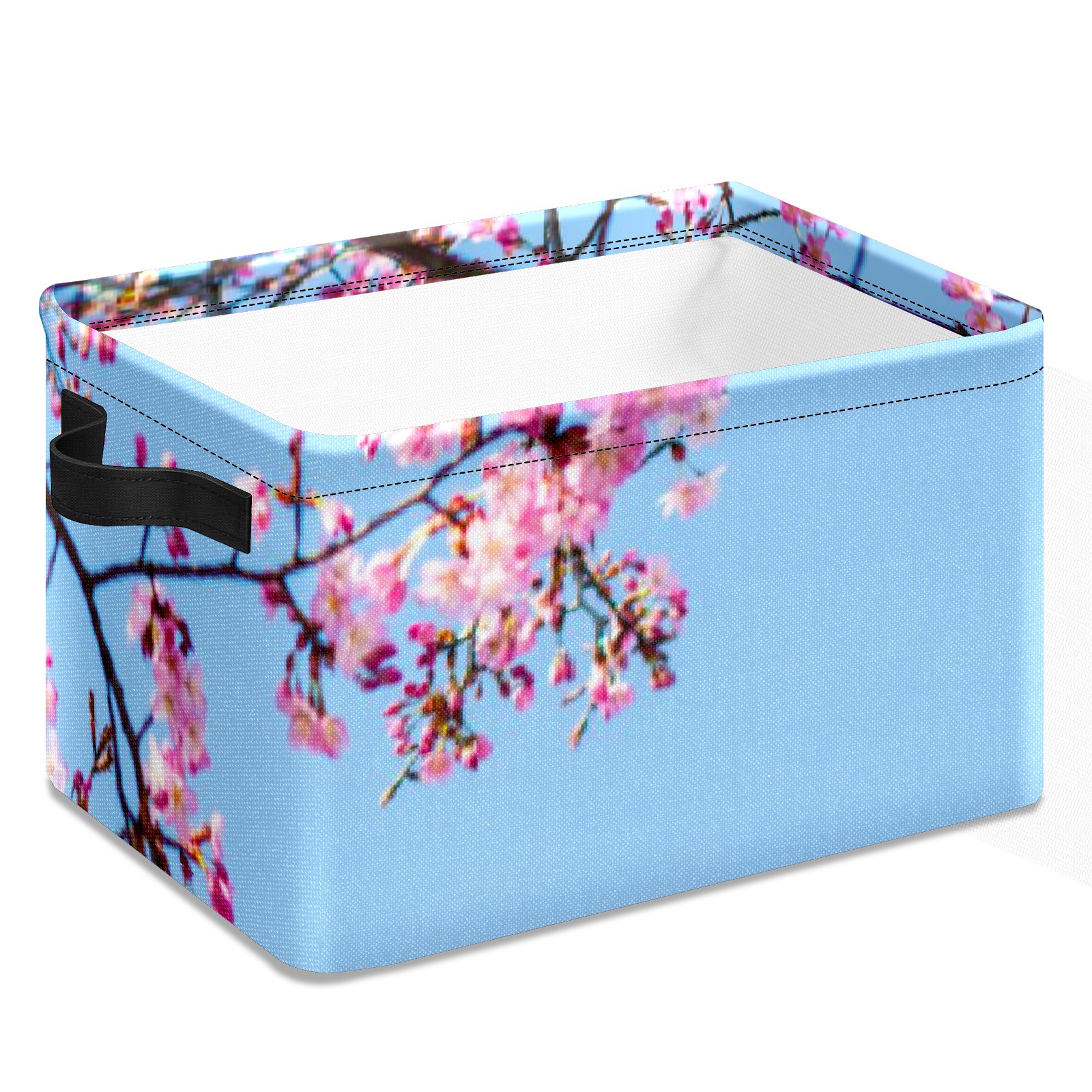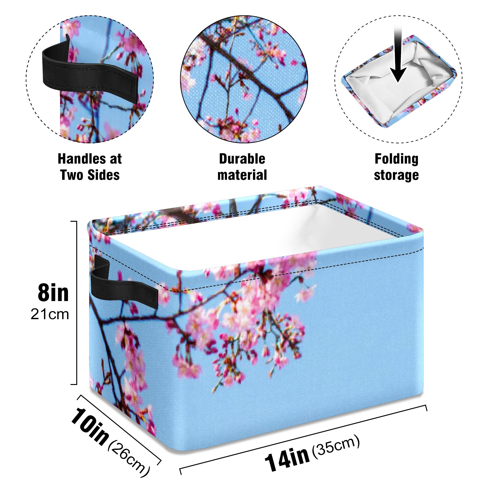 Collapsible 600D Oxford Storage Basket with Cherry Blossom Pink Flowers Blue Sky Spring - Metal Frame 10"x14"x8" Reinforced Handles, Multi-Purpose Organizer