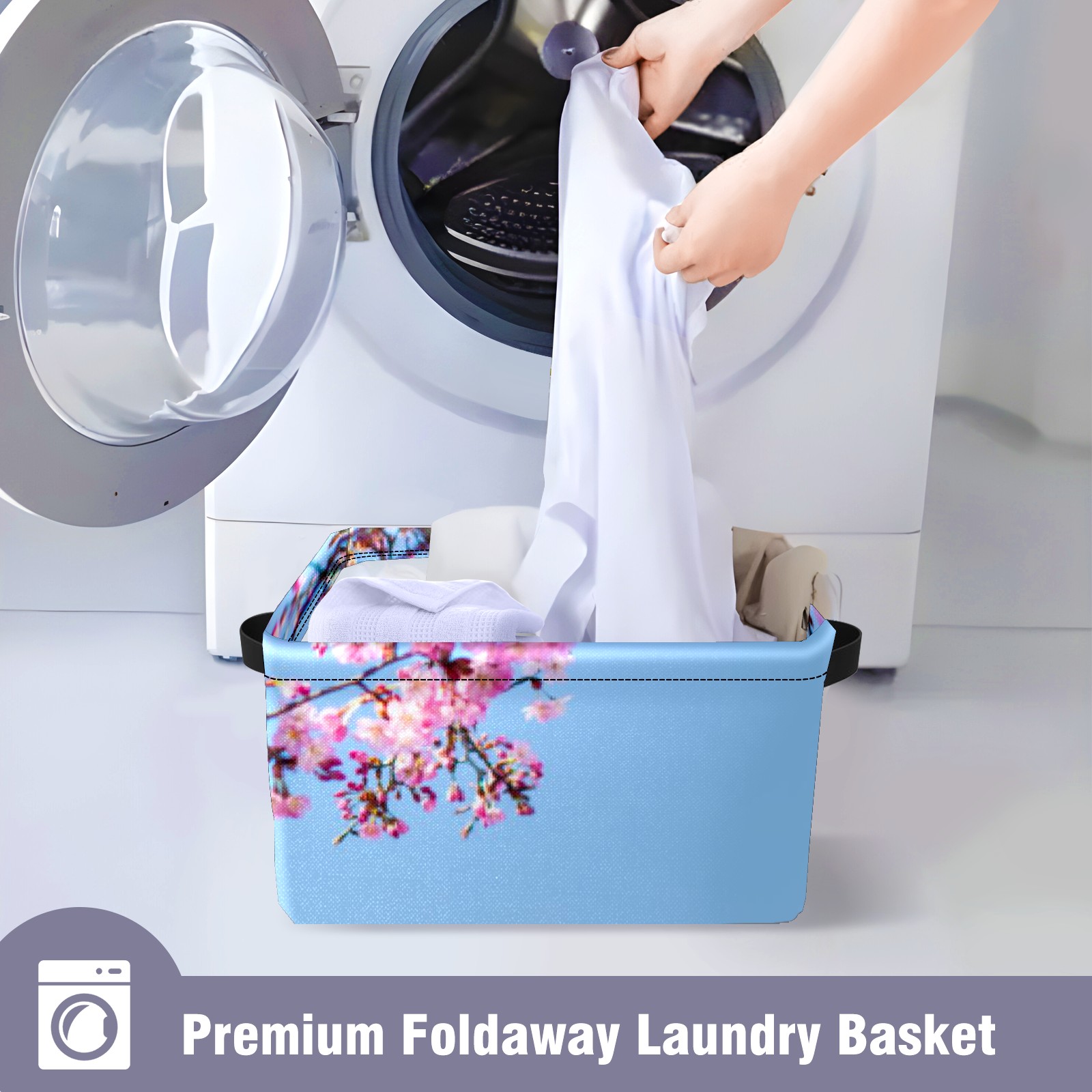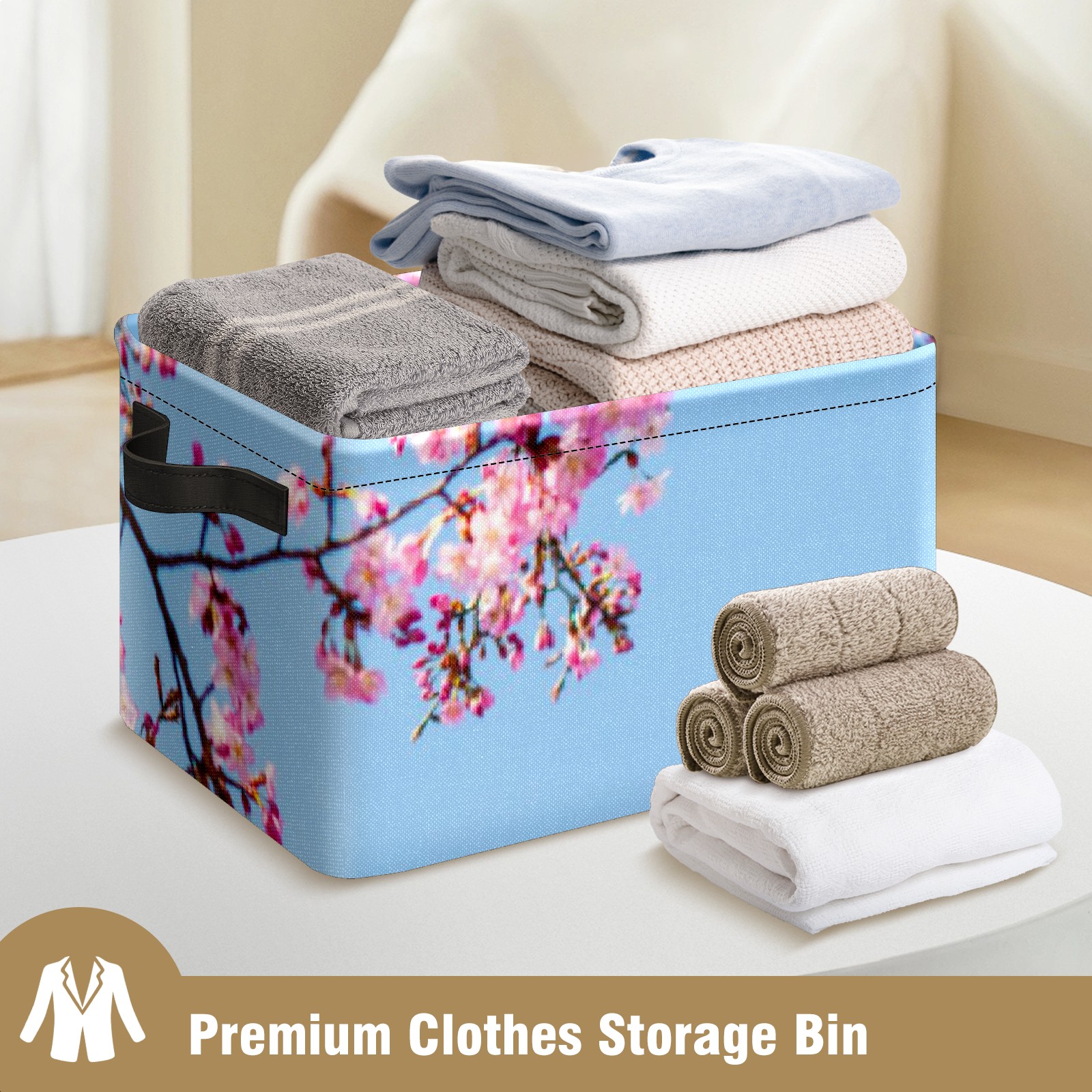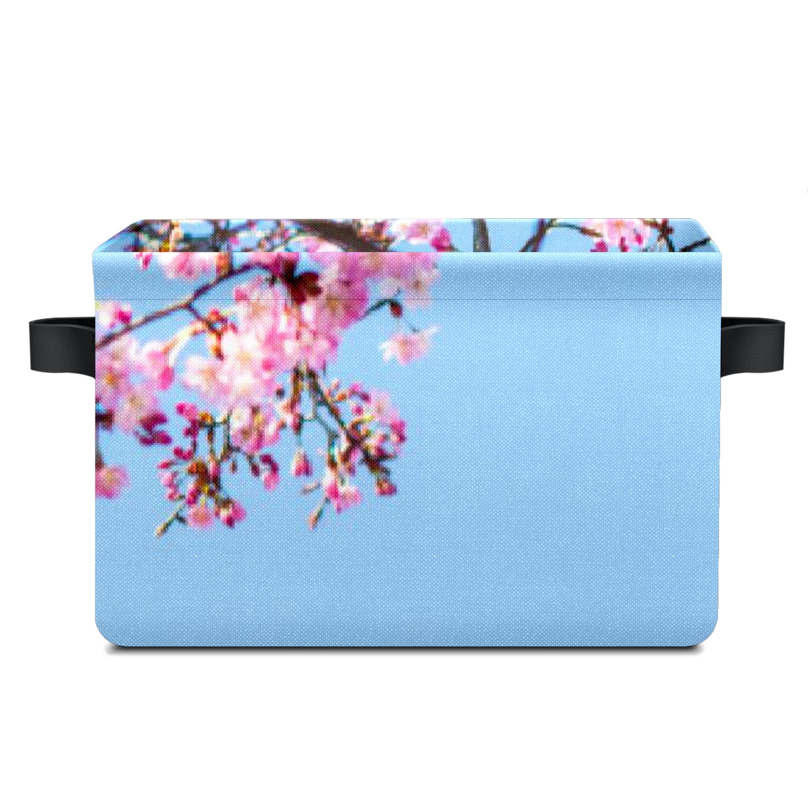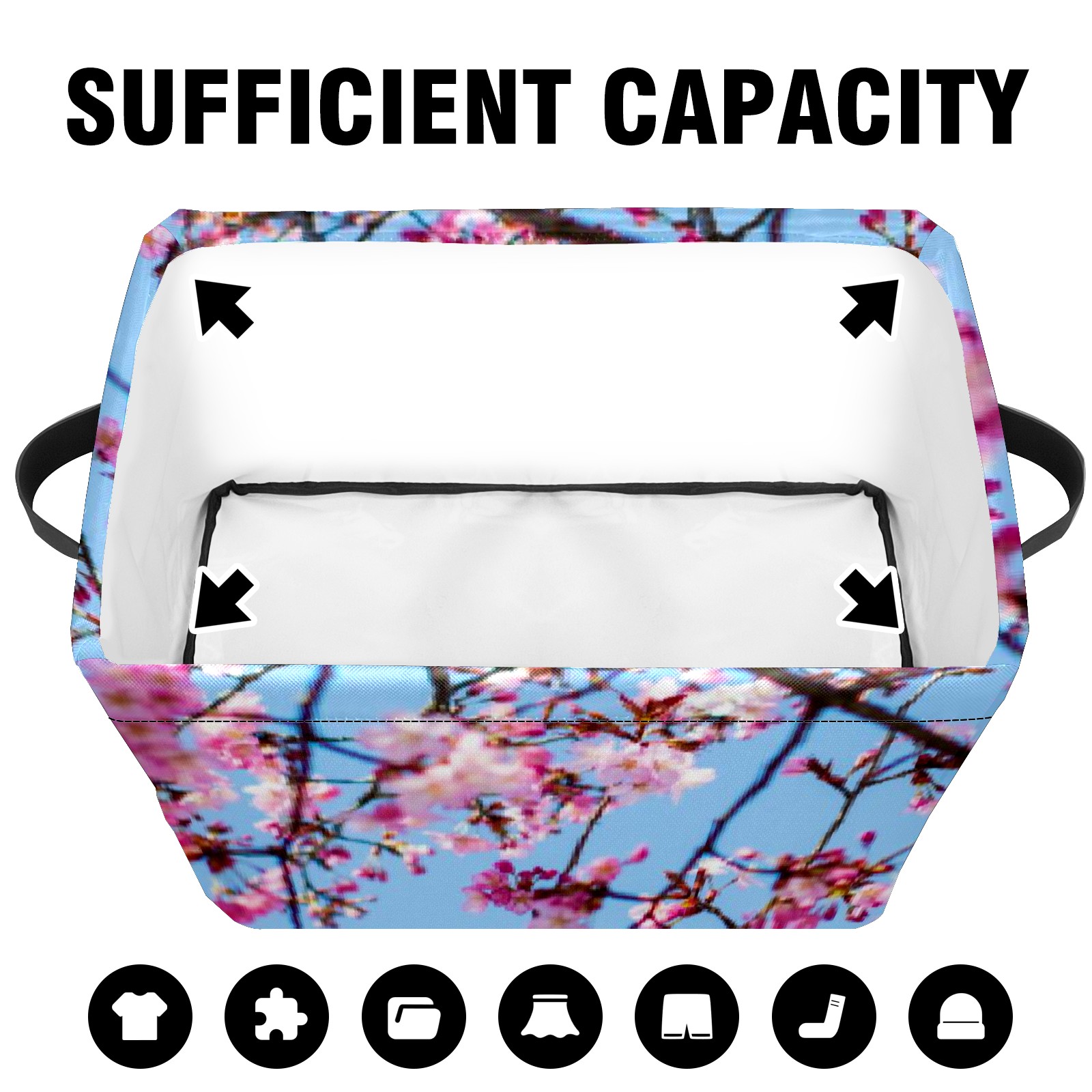 Collapsible 600D Oxford Storage Basket with Cherry Blossom Pink Flowers Blue Sky Spring - Metal Frame 10"x14"x8" Reinforced Handles, Multi-Purpose Organizer