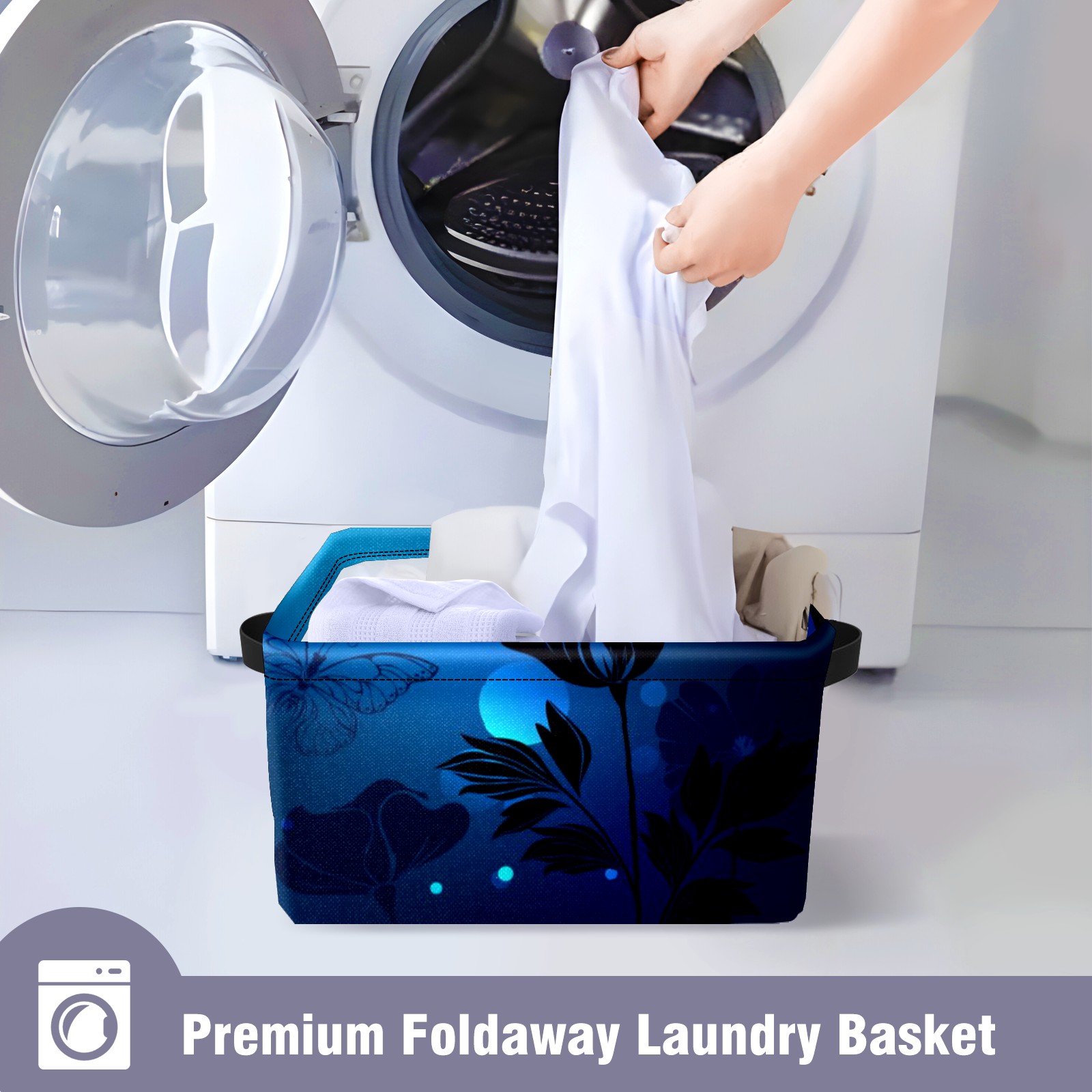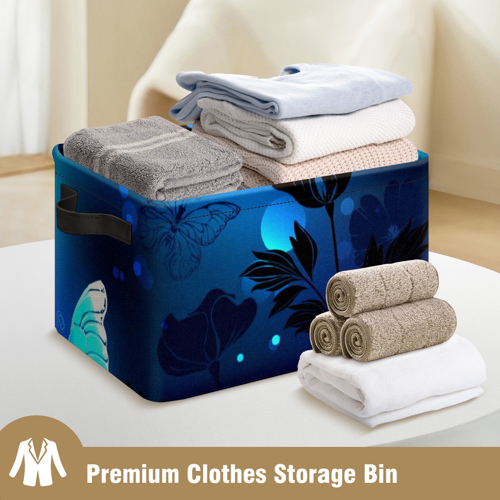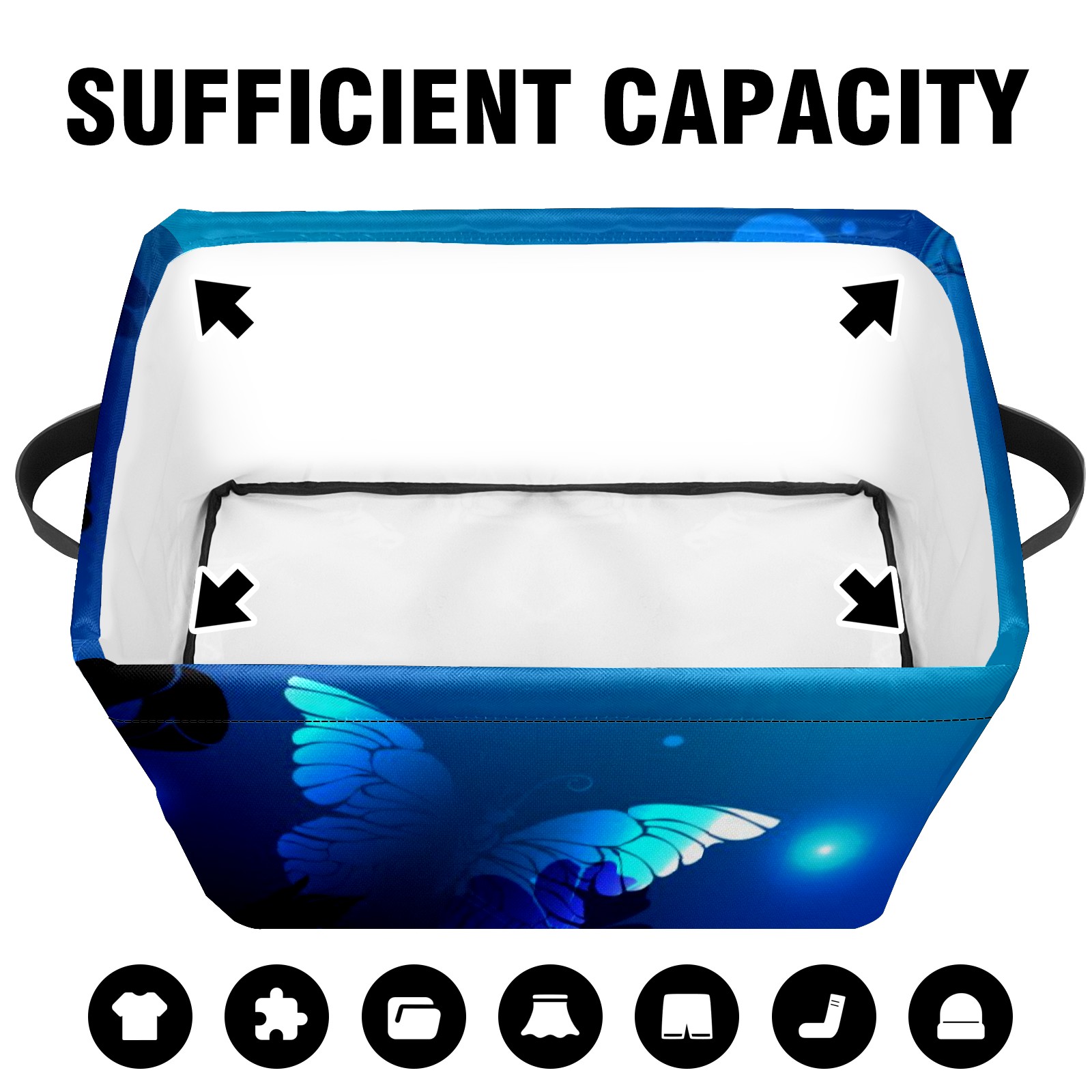 Collapsible 600D Oxford Storage Basket with Blue Butterfly Glowing - Metal Frame 10"x14"x8" Reinforced Handles, Multi-Purpose Organizer