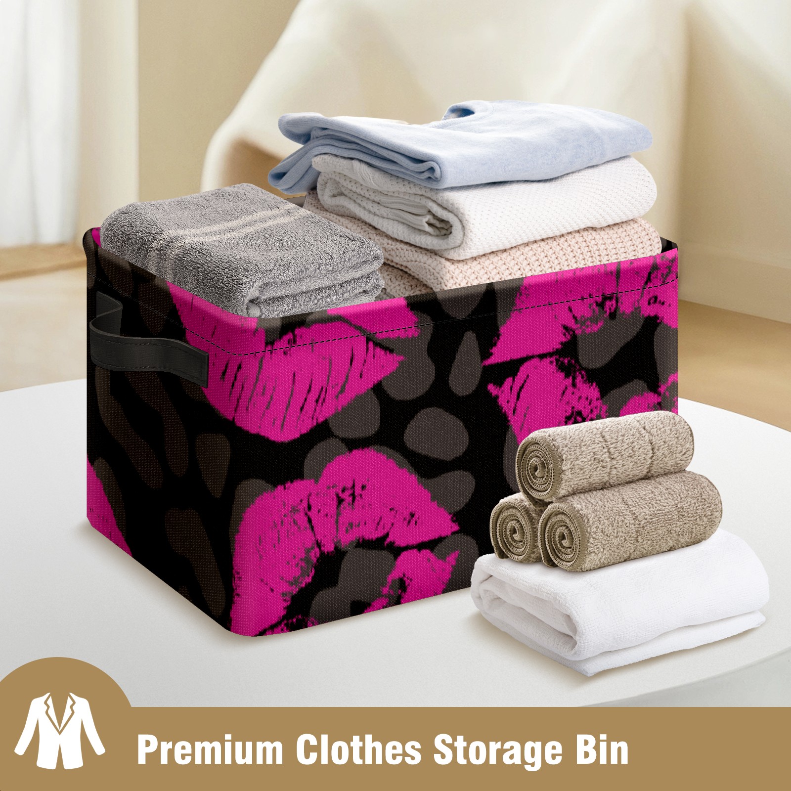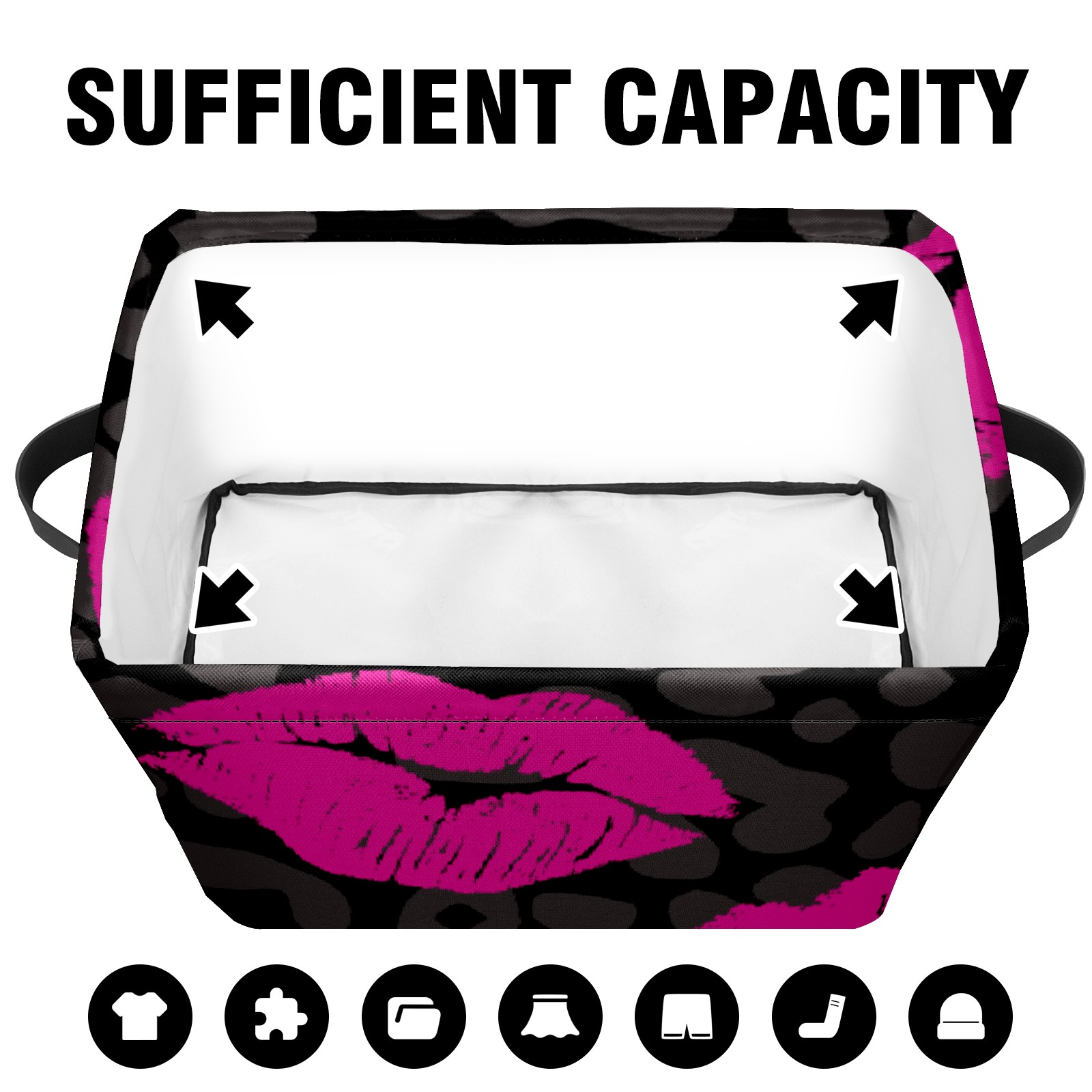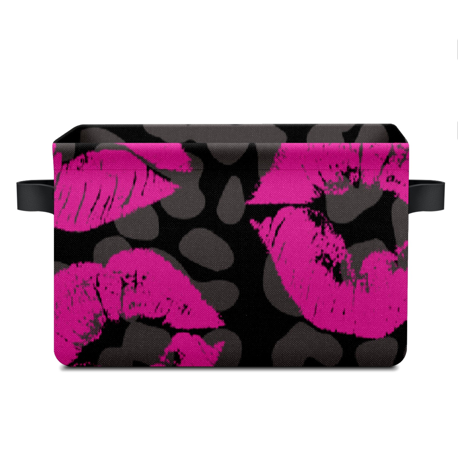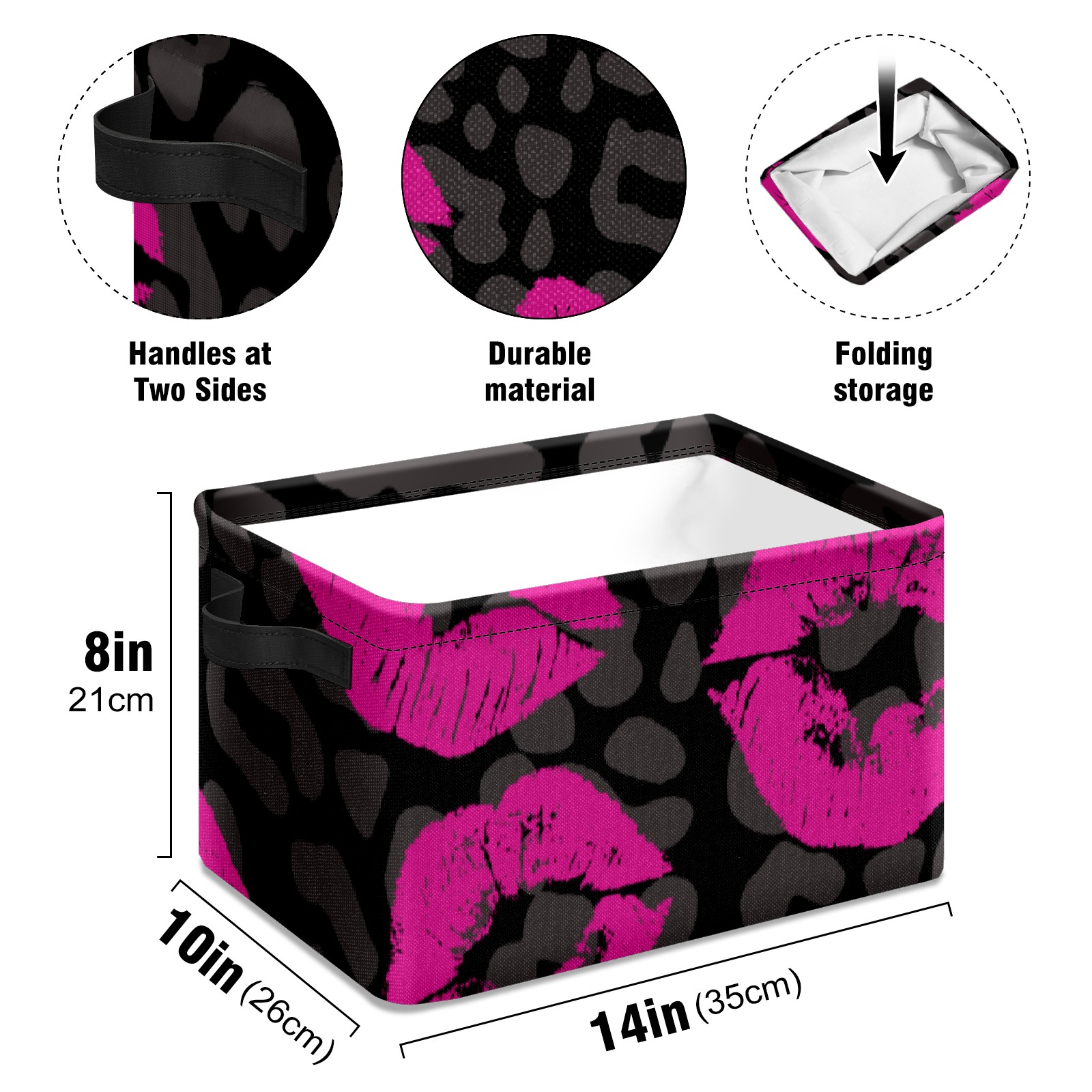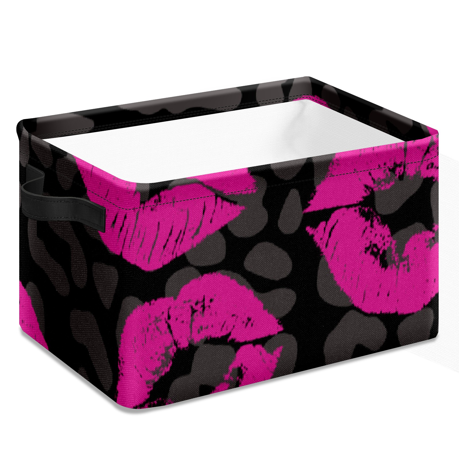 Collapsible 600D Oxford Storage Basket with Pink Lips Pattern Leopard Grain - Metal Frame 10"x14"x8" Reinforced Handles, Multi-Purpose Organizer